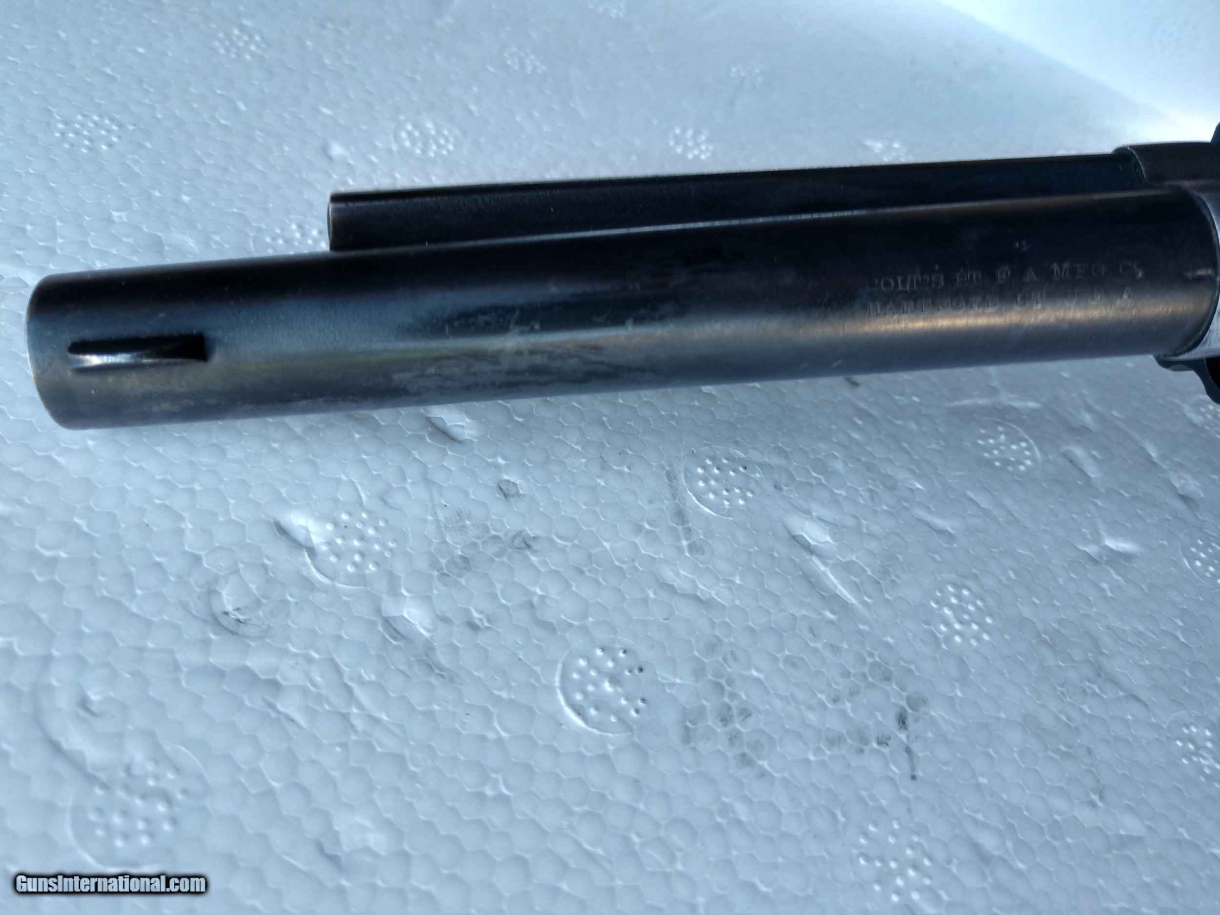 Description: Manufacturing of these revolvers occurred at the Hartford plant 1882-1886 not more than 4,000 were made. This one, serial number 16058 was made around the holidays 1883. Overall condition is extremely fine for a 137 year old single action Colt in ORIGINAL condition. There is quite a bit of original blue remaining on the blued parts. The frame, which was case hardened, is now a very attractive grey patina. All factory markings are as new. The grips are the exacting factory fit collectors expect from Colt and are without any cracks or bumps or scrapes - 100% The action works as expected. The bore is bright and shiny, with the rifling being like new. AMAZING & a once in a 21st century opportunity. If you are a true Colt collector you'll not want to miss this one. SOLD Antique: Yes Handgun Caliber: .38 Long Colt Manufacturer: Colt Model: New Police "Cop and Thug Serial Number: 16058 Barrel Length: 5 inch Chambers: 5 Ejectors: Yes Condition: Extremely Fine Bore Condition: Like new Barrel Type: Round Action: Single Triggers: Spur Manufacture Date: 1883 |