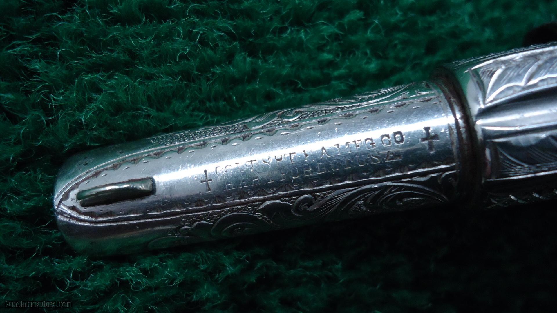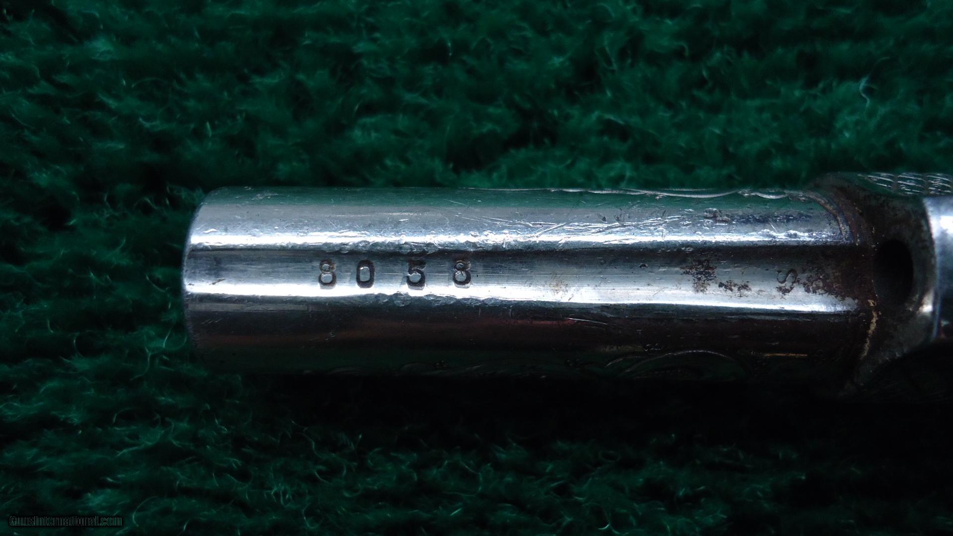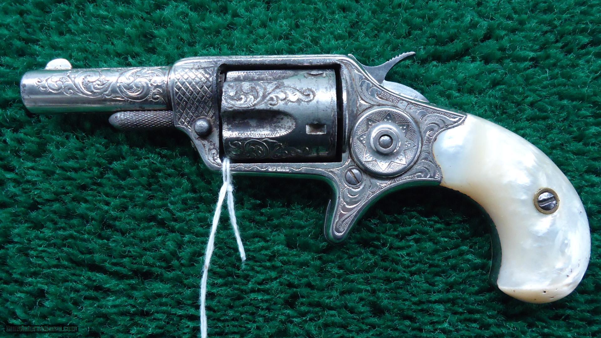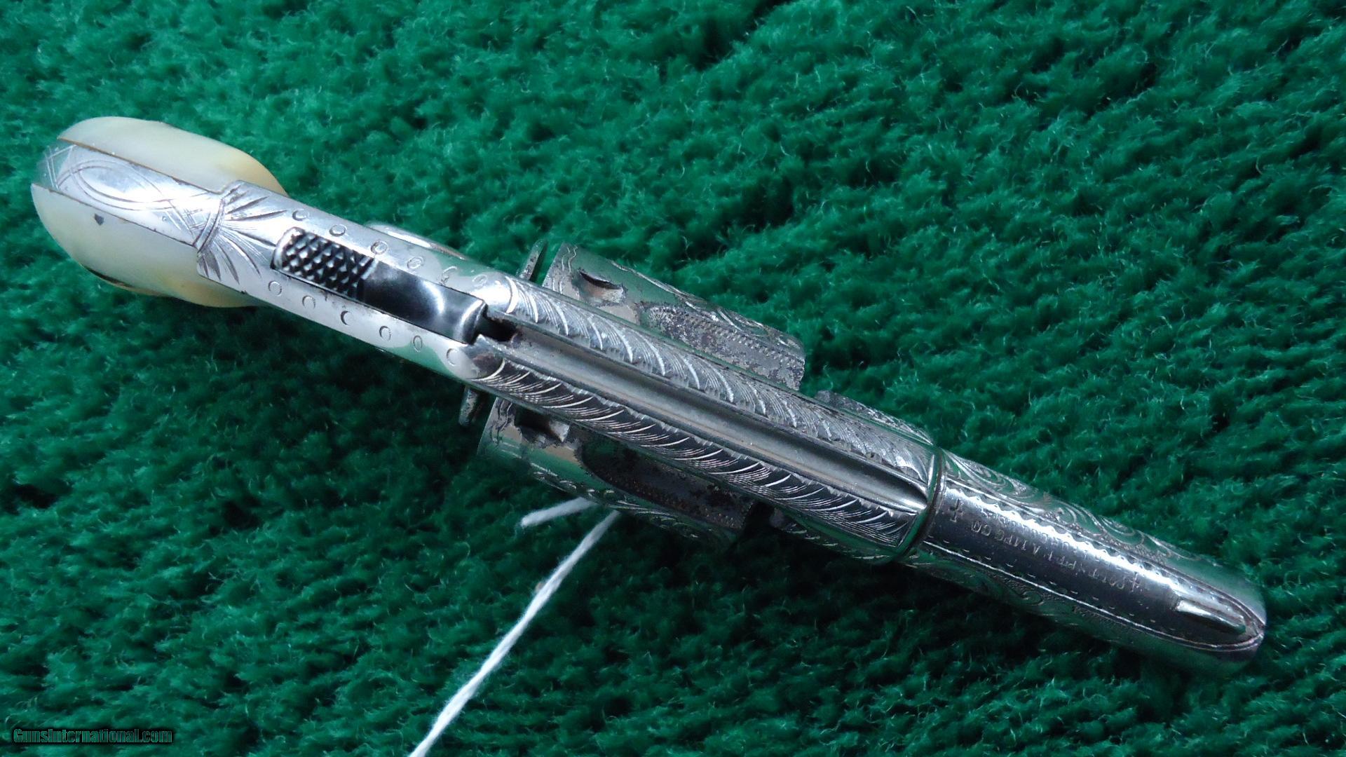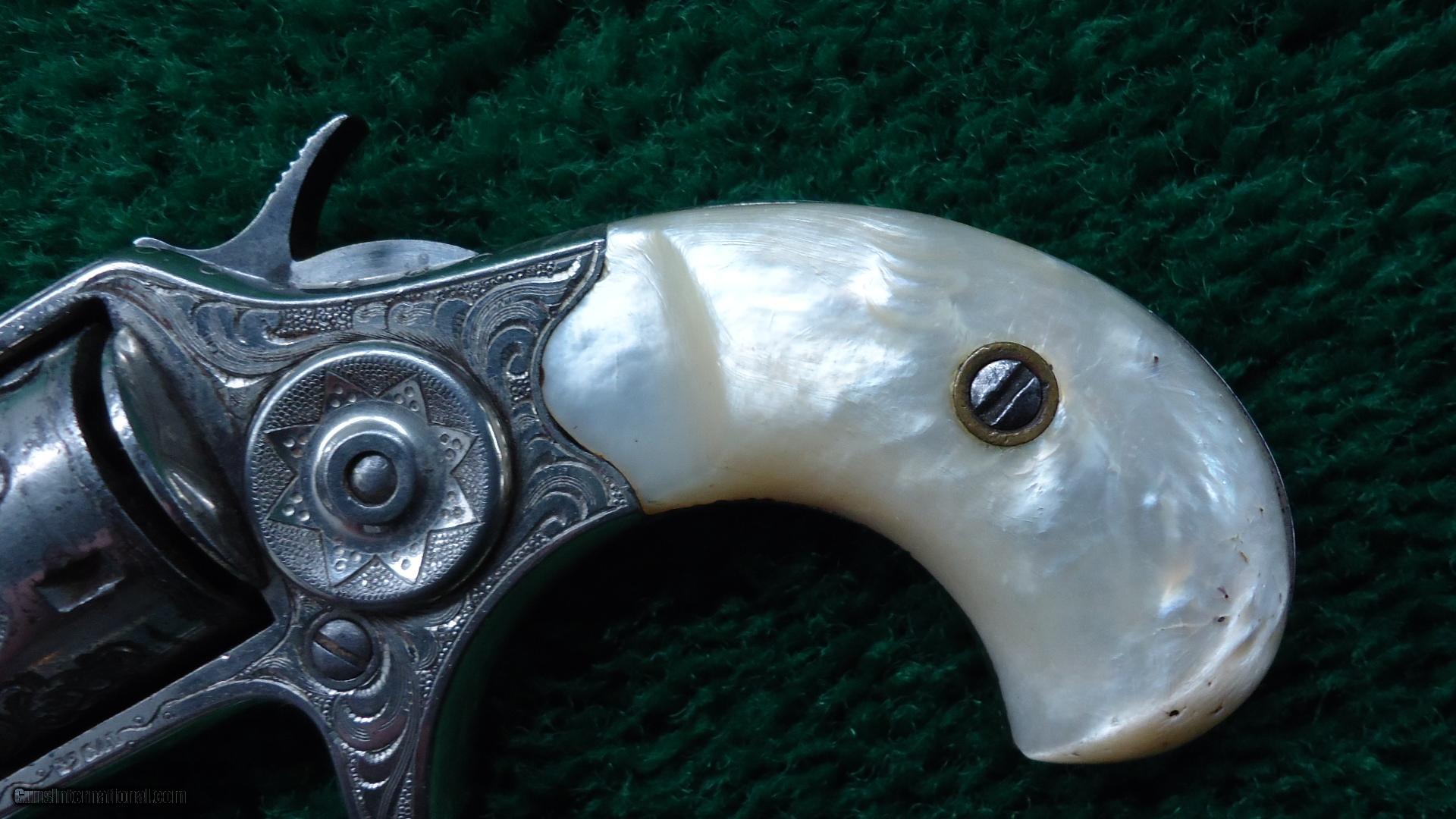 Description: Cal 32. Mother of Pearl grips. Quite elaborately engraved with about 75% coverage. Nice mechanics. Good markings. Overall metal retains about 75-80% nickel. Leroy Merz Antique Firearms specializes in antique and vintage Winchesters and other fine American firearms. Since 1965 Mr. Merz has taken part in the world of firearms and has been a contributor to many well known reference books. Just recently we mailed the 127th edition of our privately-published catalog. We have hundreds of additional guns in every price range at our home online. Search for Merz Antiques in google. SOLD Antique: Yes |