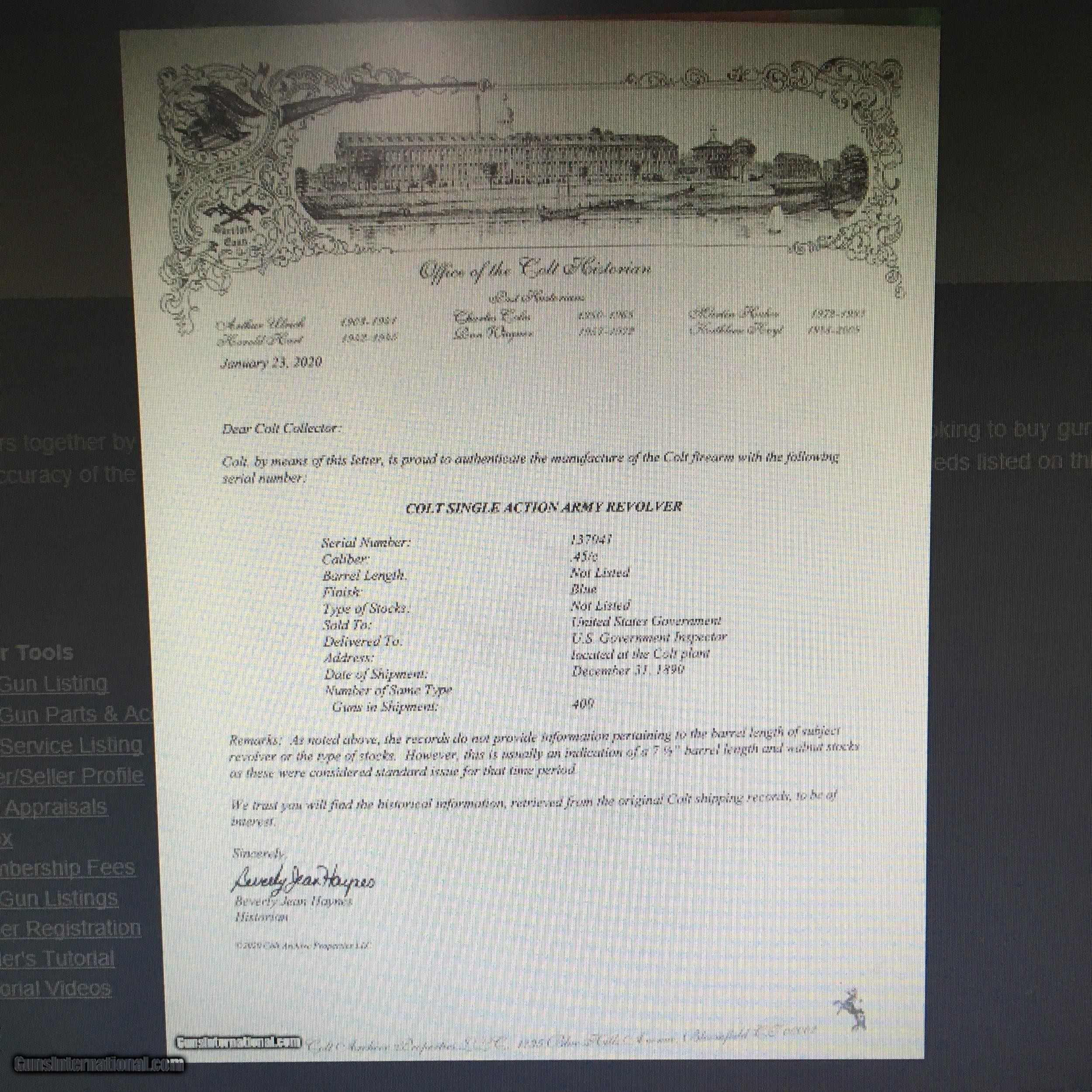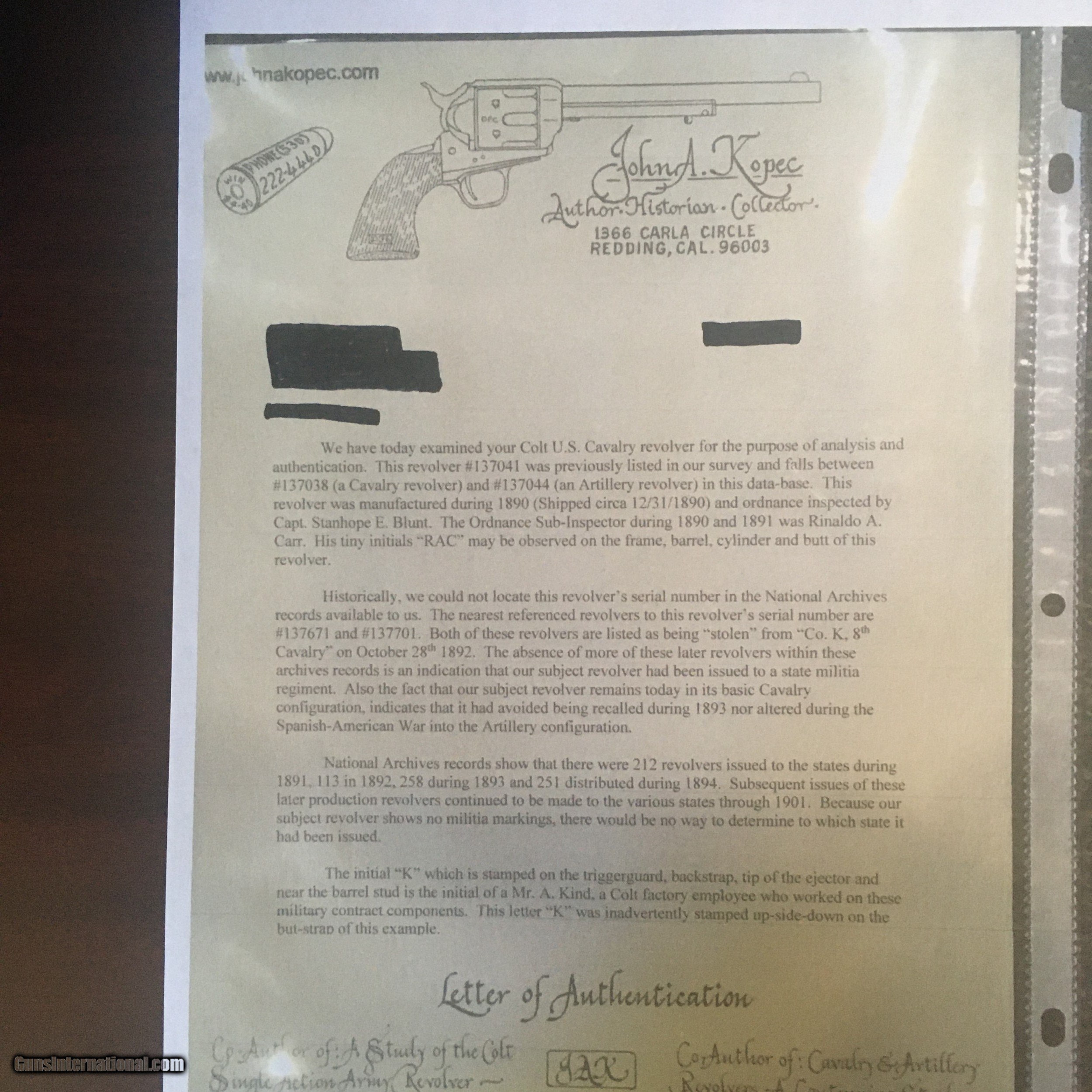 Description: ***SOLD***Very Hard to find, High Condition, Colt Cavalry with Kopec Silver Cert. Letter. Colt Factory Letter and a Super Nice U.S. Government issued Cavalry Holster. One of the last Colt Cavalries produced in 1890. This gun escaped the Arsenal refurbishing because it was like new and the Re-barreling by having been issued to the New York Militia (see Kopec letter). It would be Very hard and very expensive to find a better Cavalry today! GOLD Kopec letter if the front sight had not been notched by whoever the gun was issued, in my opinion. Very Nice, high condition, correct U.S. Cavalry Holster. Pictures tell the rest! SOLD Antique: Yes Handgun Caliber: .45 Colt Manufacturer: Colt Model: SAA Serial Number: 137,041 Barrel Length: 7 1/2 Condition: Excellent Metal Condition: Excellent Wood Condition: Excellent Bore Condition: Excellent |