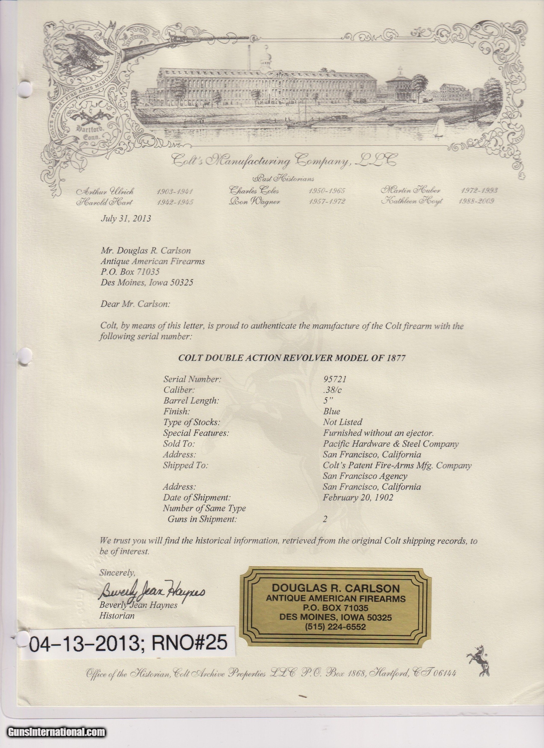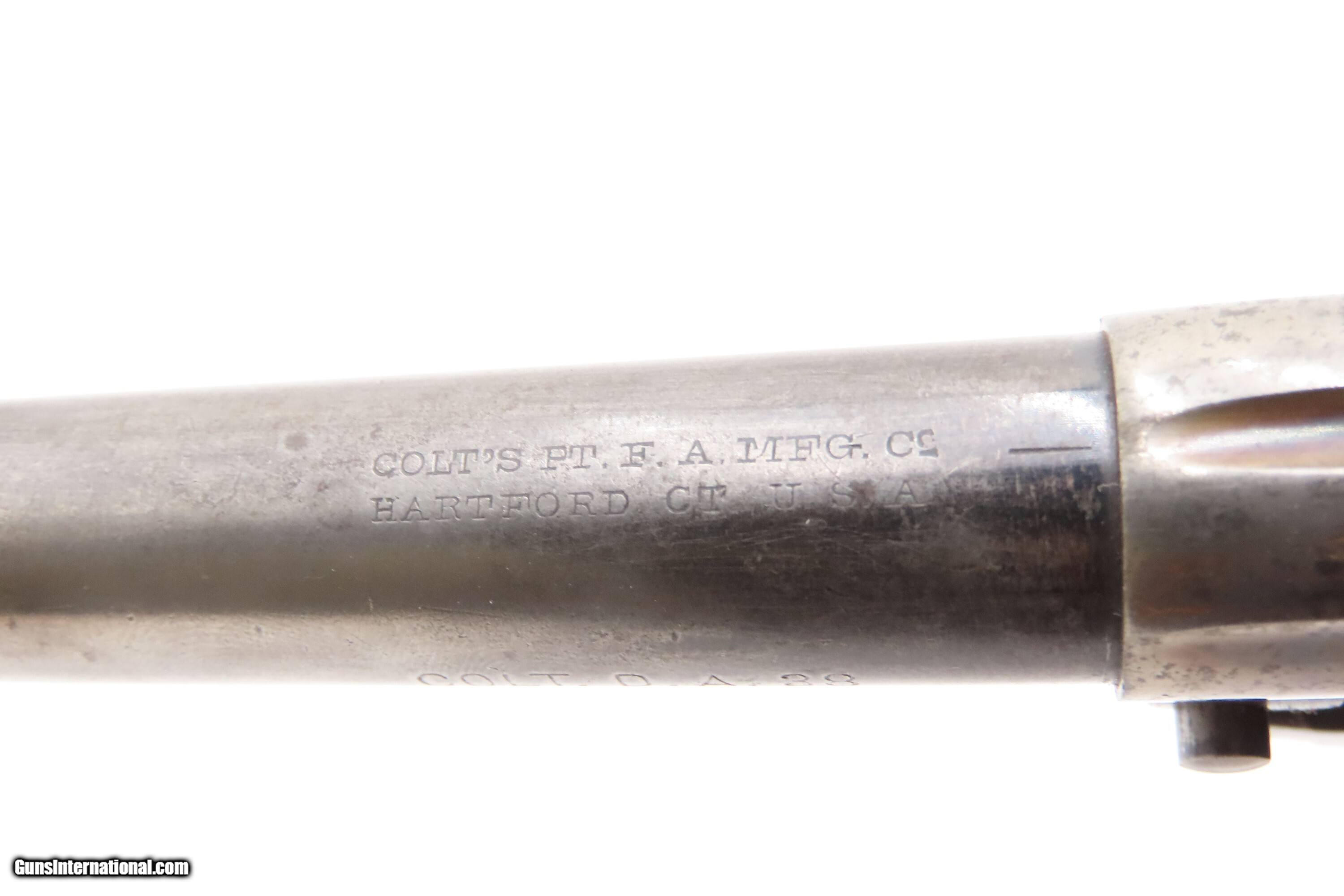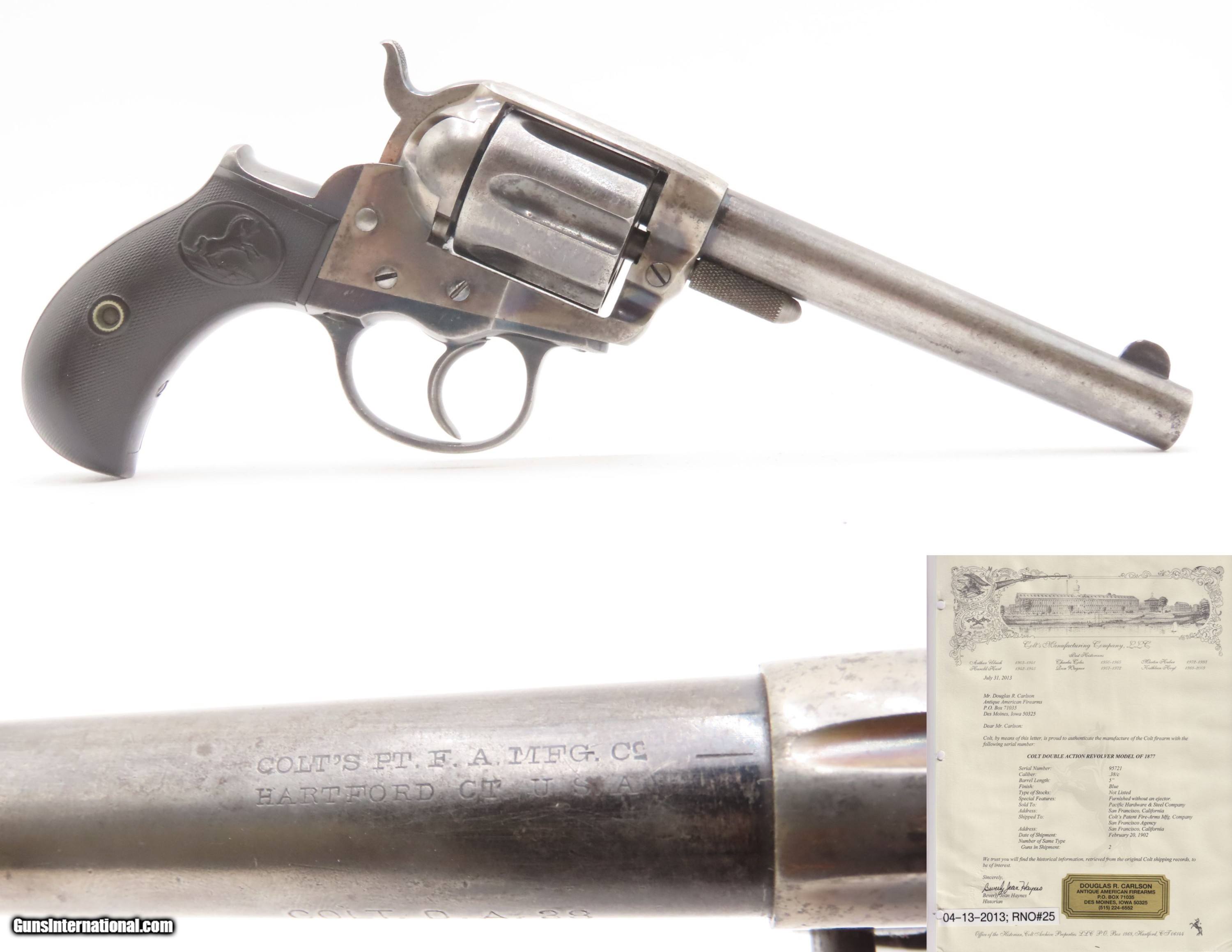 Description: LETTERED Antique Colt SHERIFF’S MODEL M1877 “Lightning” Revolver WILD WEST SAN FRANCISCO Shipped with DESIREABLE 5 INCH BARREL Here Ancestry Guns presents an antique Factory Lettered San Francisco Shipped Colt “Sheriff’s Model” 1877 Lightning Double Action Revolver with the very scarce 5-inch barrel, made in 1894 in Hartford, Connecticut. The Model 1877 was Colt’s first venture into double action revolvers. It was quite successful, selling 166,849 from 1877 through 1909. Nonetheless, there was some hesitation to move away from the single action mechanism, which had so proven itself. Famous adopters of the Lightning were William “Billy the Kid” Bonney and John Wesley Hardin, along with “Doc” Holliday. Doc’s weapon of choice early in his western career was an 1851 Colt Navy revolver. Later, Doc carried a nickel-plated .41 caliber Colt Thunderer or the .38 caliber Colt Lightning. The Model 1877 was designed in 1876 by William Mason and was offered in three different calibers with production beginning in January 1877, which led to the three unofficial names. The first production model was the “Lightning”, in .38 Long Colt caliber. Later that year, Colt came out with the .41 Long Colt caliber called the “Thunderer”. The .32 Long Colt caliber, called the “Rainmaker”, didn’t go into production until sometime in 1887. Benjamin Kittredge, the largest Colt Distributor in Cincinnati, Ohio, coined the nicknames for these guns as a marketing tool. He was also responsible for calling the Model 1873 Single Action Army the “Peacemaker”. None of the nicknames were ever used by the factory in any reference materials. The 1877 "Thunderer” in .41 caliber was the preferred weapon of Billy the Kid and was his weapon of choice when he was killed by Pat Garret in 1881. As mentioned above, this gun was manufactured in 1894, per Colt factory serial number records. The accompanying factory letter states this revolver was sold to Pacific Hardware & Steel Company of San Francisco, California, and shipped on February 20, 1902, to Colt's San Francisco Agency, in .38 caliber, with a 5 inch barrel, blue finish, and type of stocks not listed. This was a 2 gun shipment. The overall condition is fine. Much original blue is present on the guard and grip frame. Traces of blue are present on the barrel. Case colored frame. Markings are sharp. Visible numbers match. Excellent action. Bright sharply rifled bore. Both grips are very good with average handling wear. Own the original! This is a legitimate antique and not a reproduction. Barrel is 5 inches. Caliber: .38 Long Colt Overall condition as seen in photos. Very Fast. Very Safe. FREE SHIPPING WORLDWIDE. Delivered directly to your door by express mail! Guaranteed AUTHENTIC & Includes CERTIFICATE OF AUTHENTICITY. $4000 #259572 Antique: Yes Price: $4,000.00 Buy Now Pay with