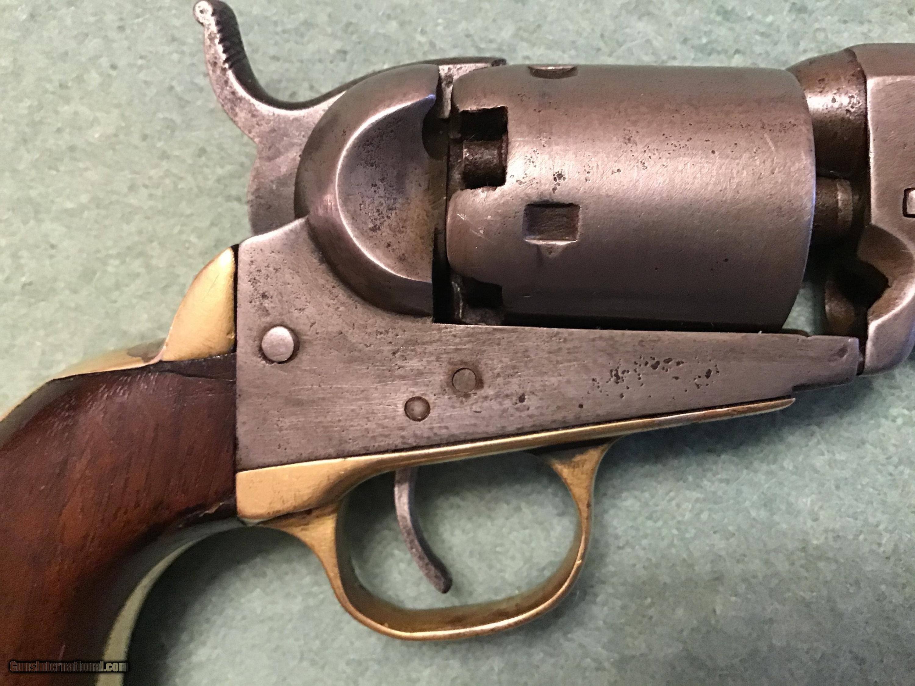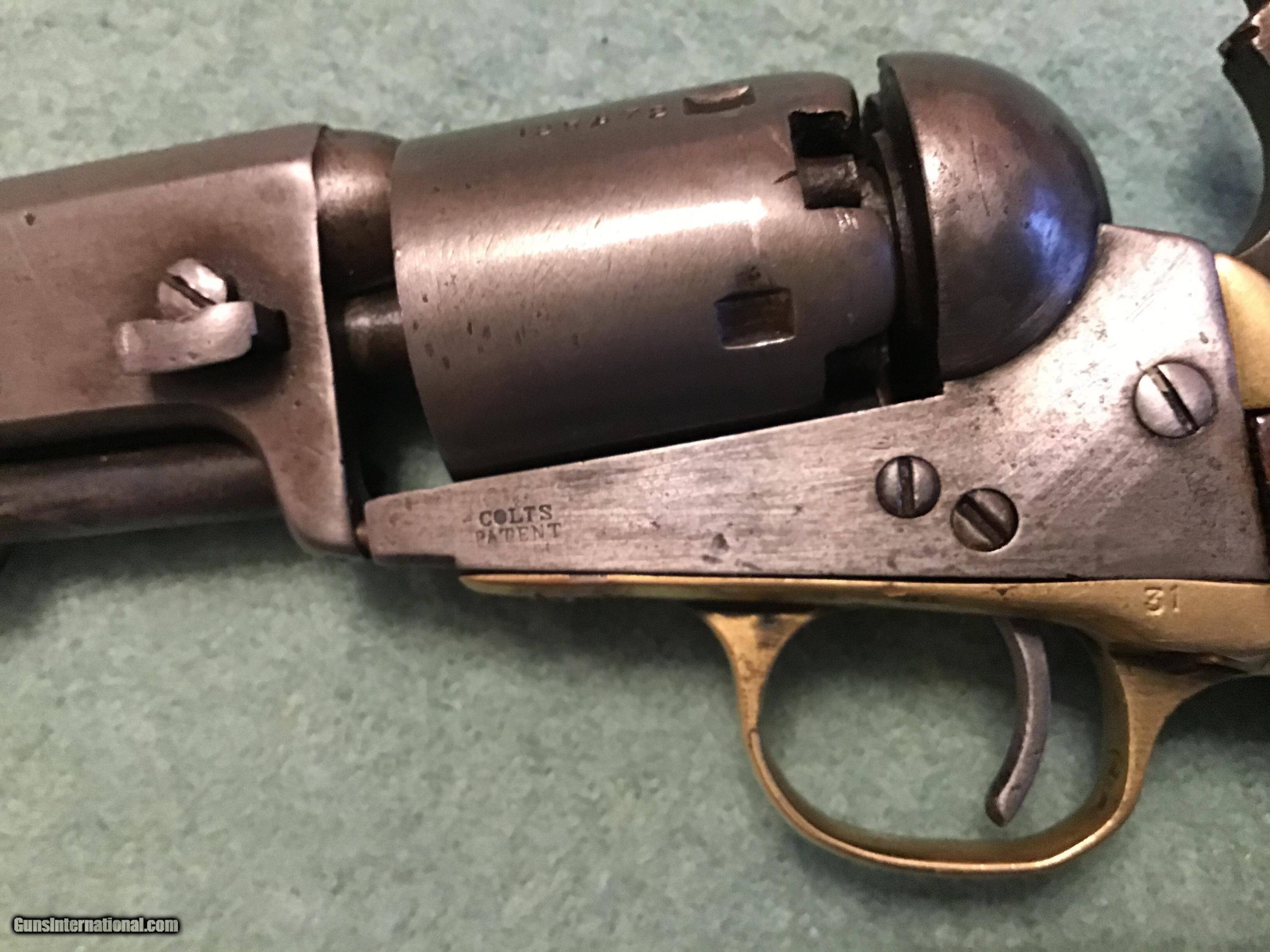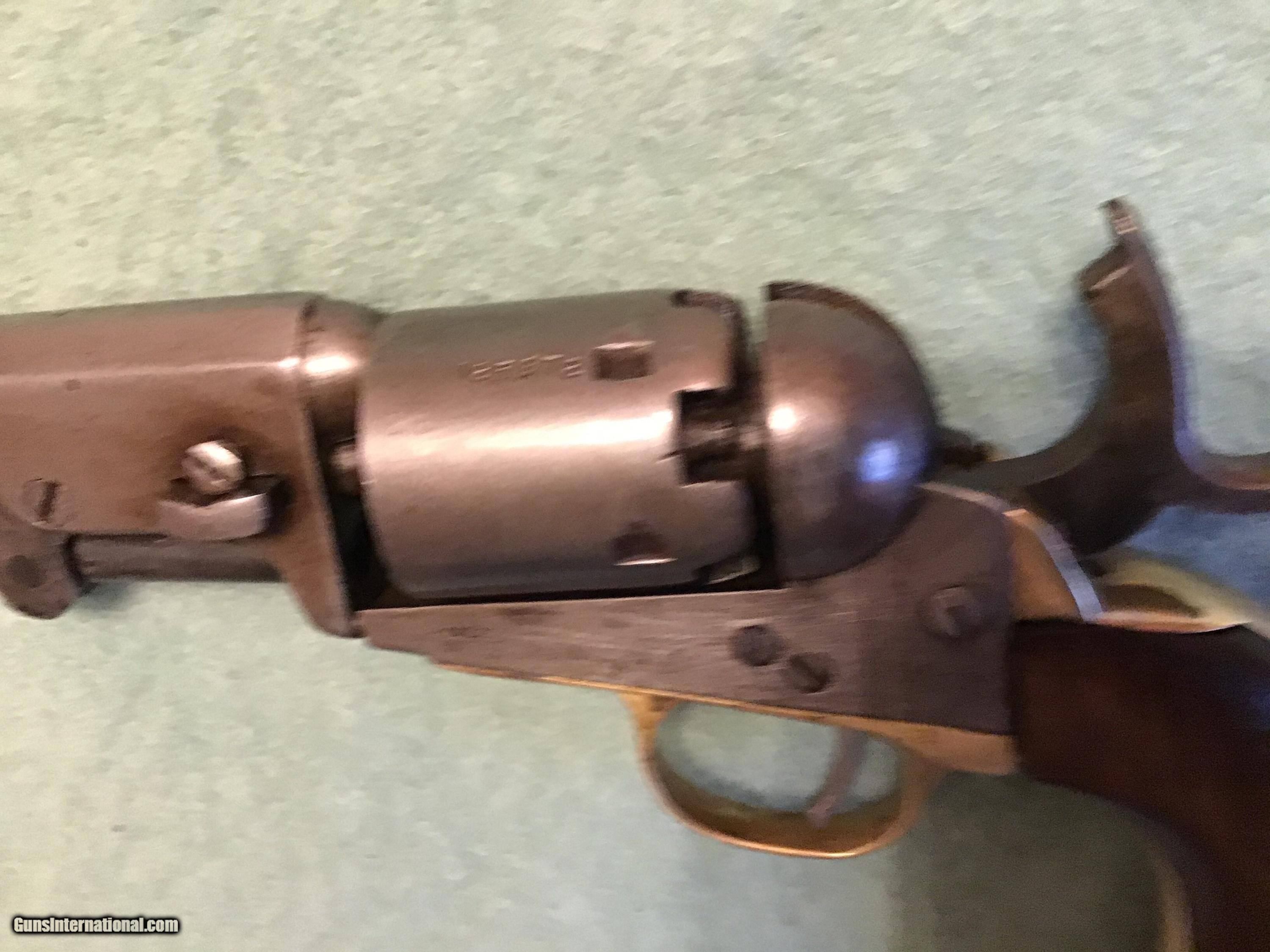 Description: On Hold Sale Pending.Colt Model 1849, 31 caliber pocket manufactured 1856-1857. All metal is a smooth grey color. Brass is lightly cleaned. Serial number 125672 is located in 5 locations including the cylinder. No scene remains on the cylinder. Cylinder rotates as it should and it holds at half and full cock and it locks up at full cock. wood grips are very good. Address read Address New York City. All nipples are present and look good. A good looking and functioning colt pocket. Please feel free to contact me with any questions. Shipping will be actual cost by insured priority mail with tracking. On Hold Sale Pending SOLD Antique: Yes Manufacturer: Colt Model: 1849 Serial Number: 125,672 Barrel Length: 4” |