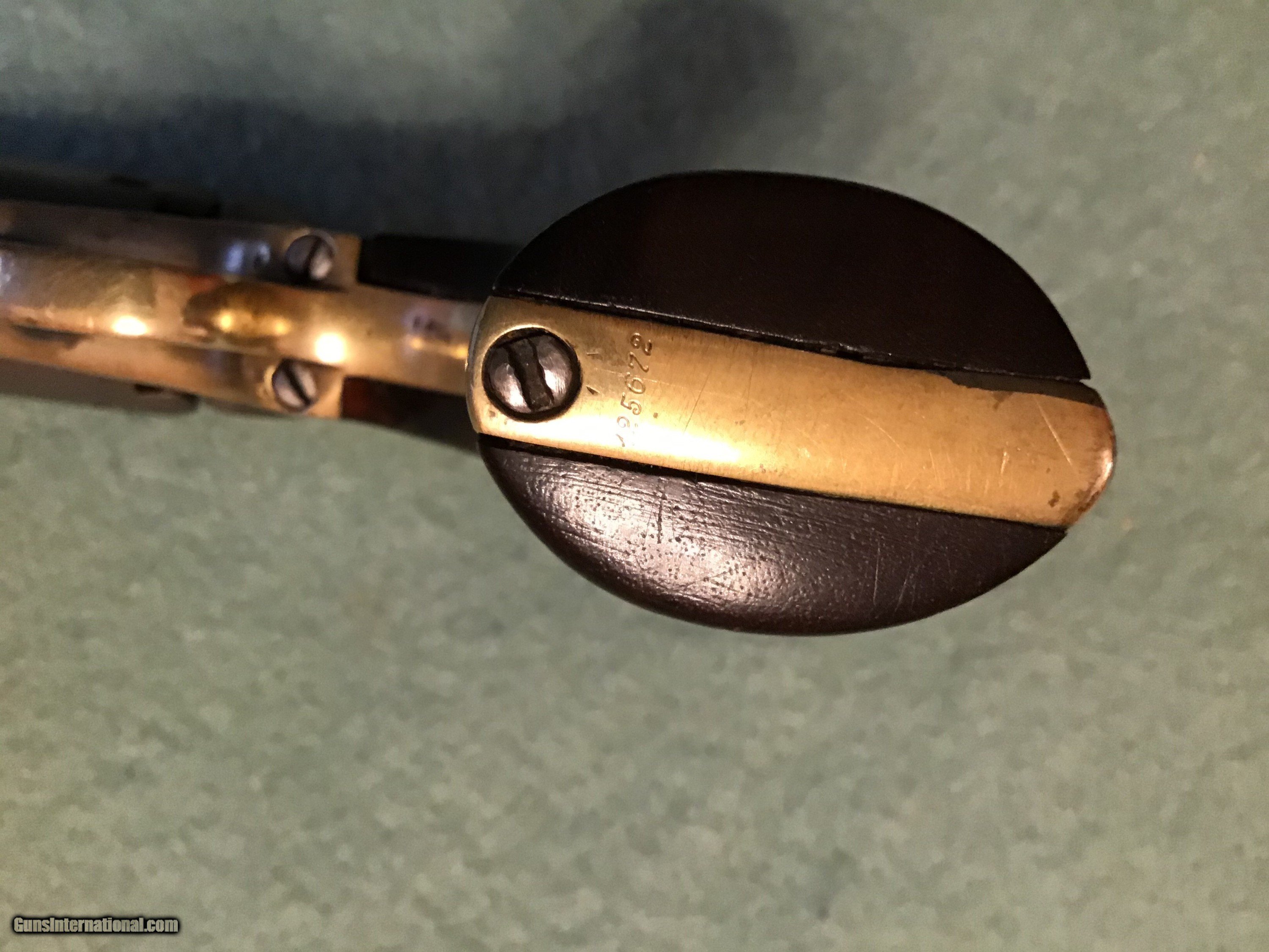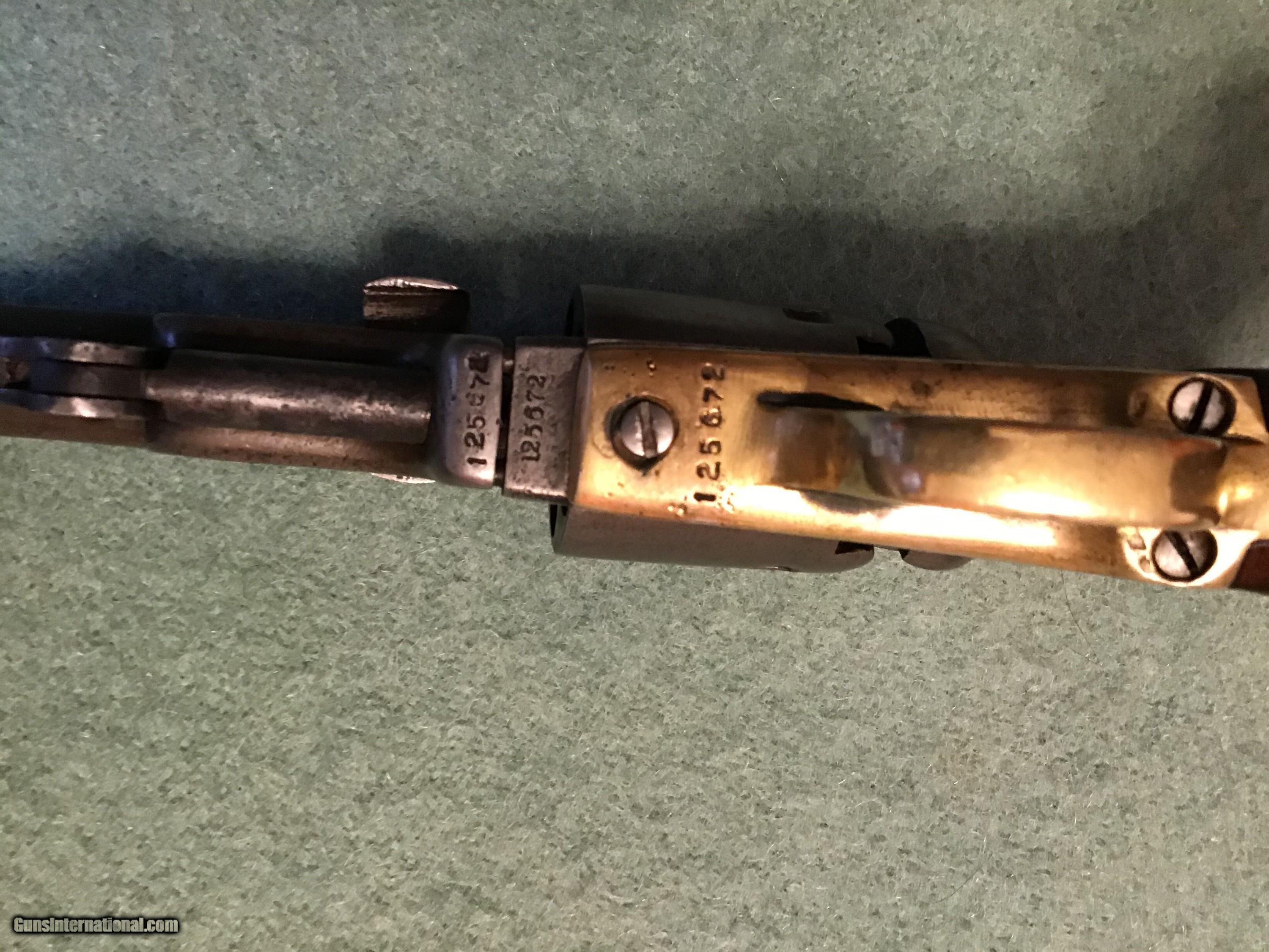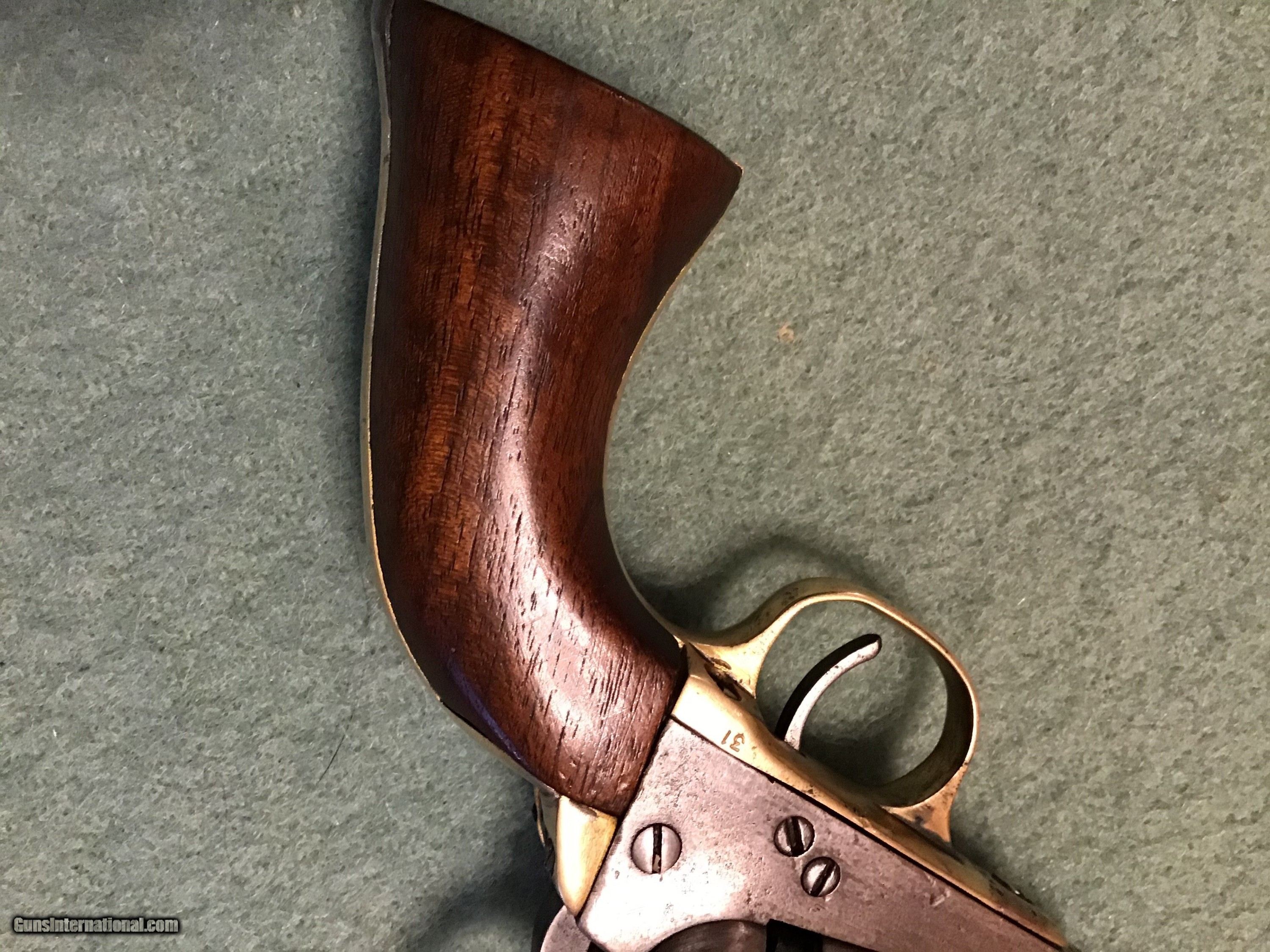 Description: On Hold Sale Pending.Colt Model 1849, 31 caliber pocket manufactured 1856-1857. All metal is a smooth grey color. Brass is lightly cleaned. Serial number 125672 is located in 5 locations including the cylinder. No scene remains on the cylinder. Cylinder rotates as it should and it holds at half and full cock and it locks up at full cock. wood grips are very good. Address read Address New York City. All nipples are present and look good. A good looking and functioning colt pocket. Please feel free to contact me with any questions. Shipping will be actual cost by insured priority mail with tracking. On Hold Sale Pending SOLD Antique: Yes Manufacturer: Colt Model: 1849 Serial Number: 125,672 Barrel Length: 4” |