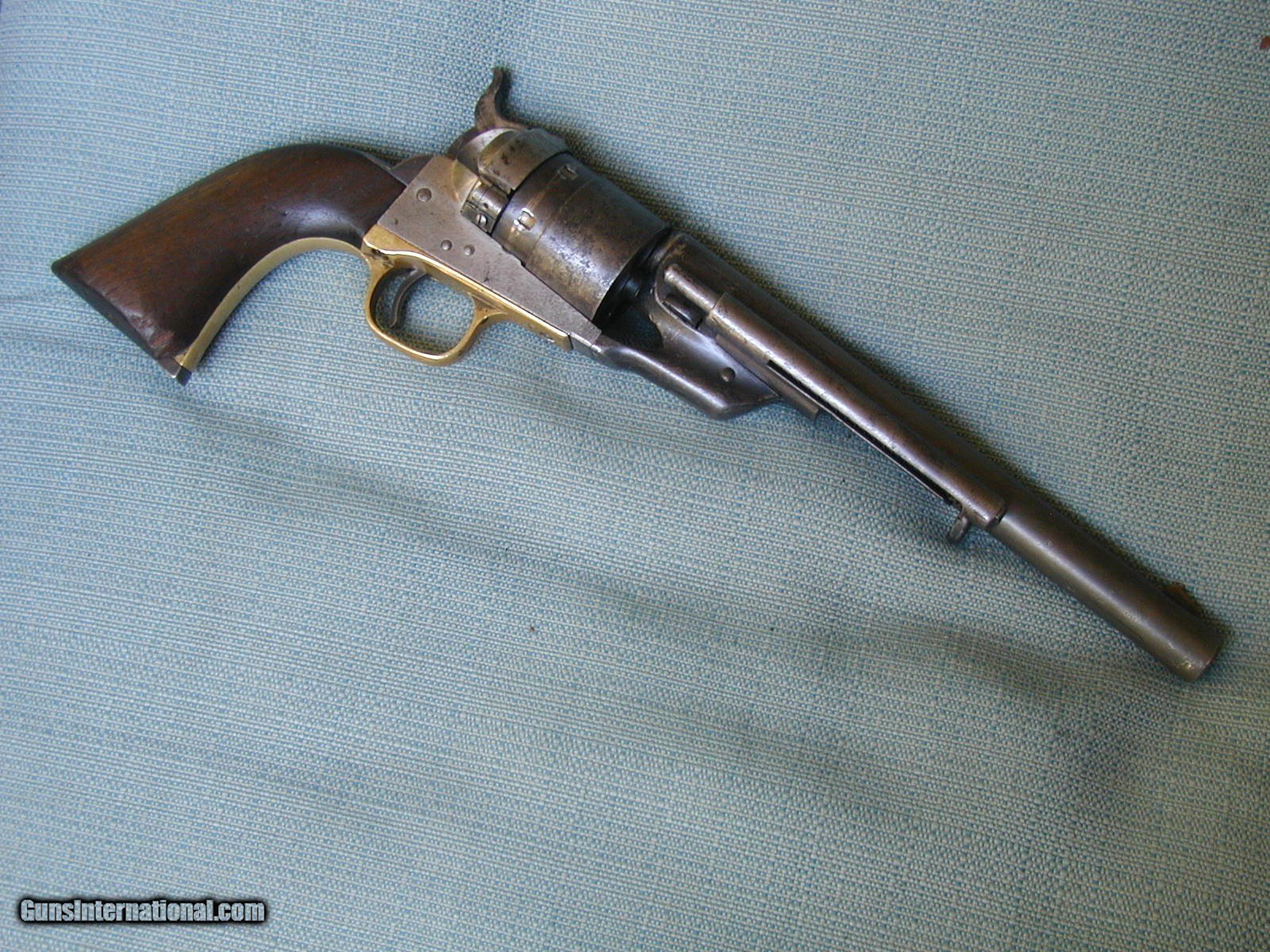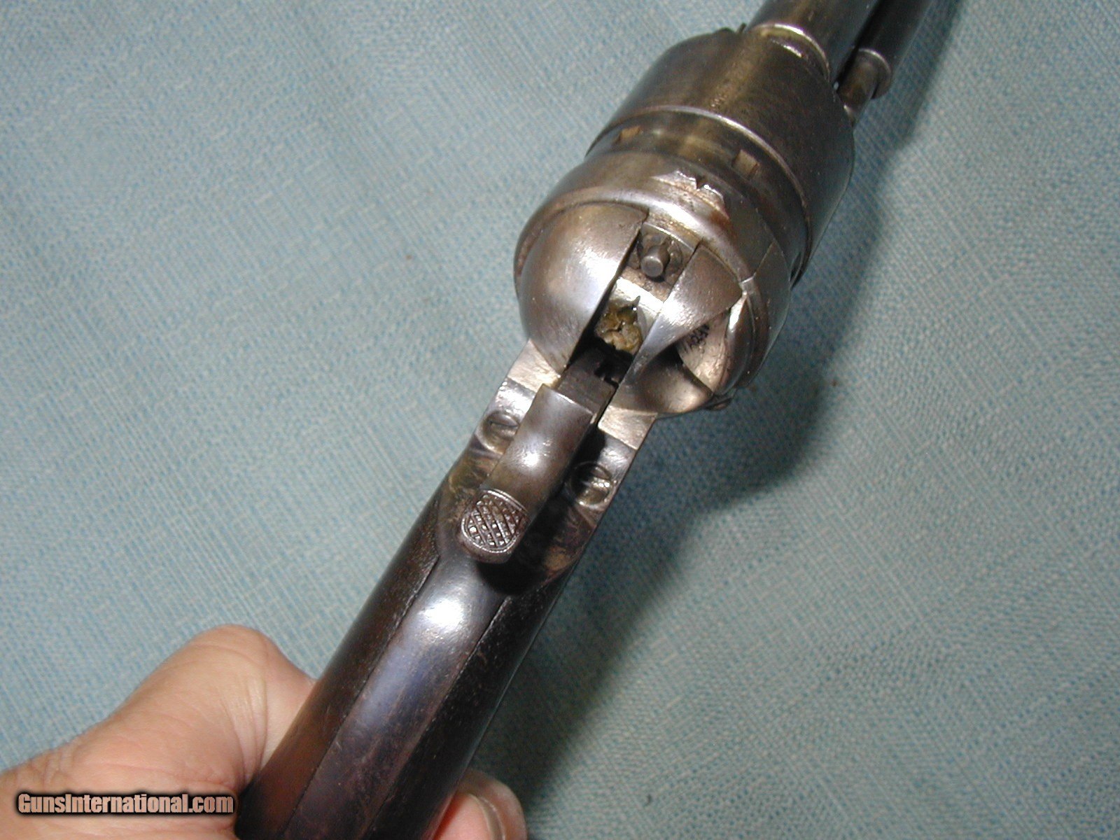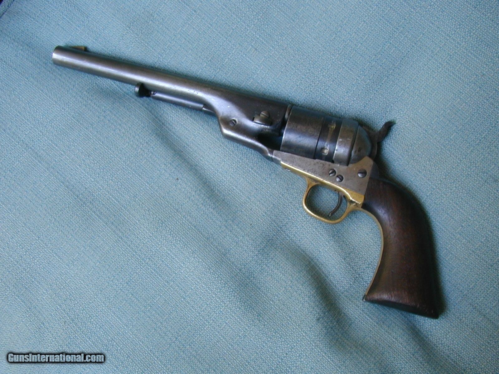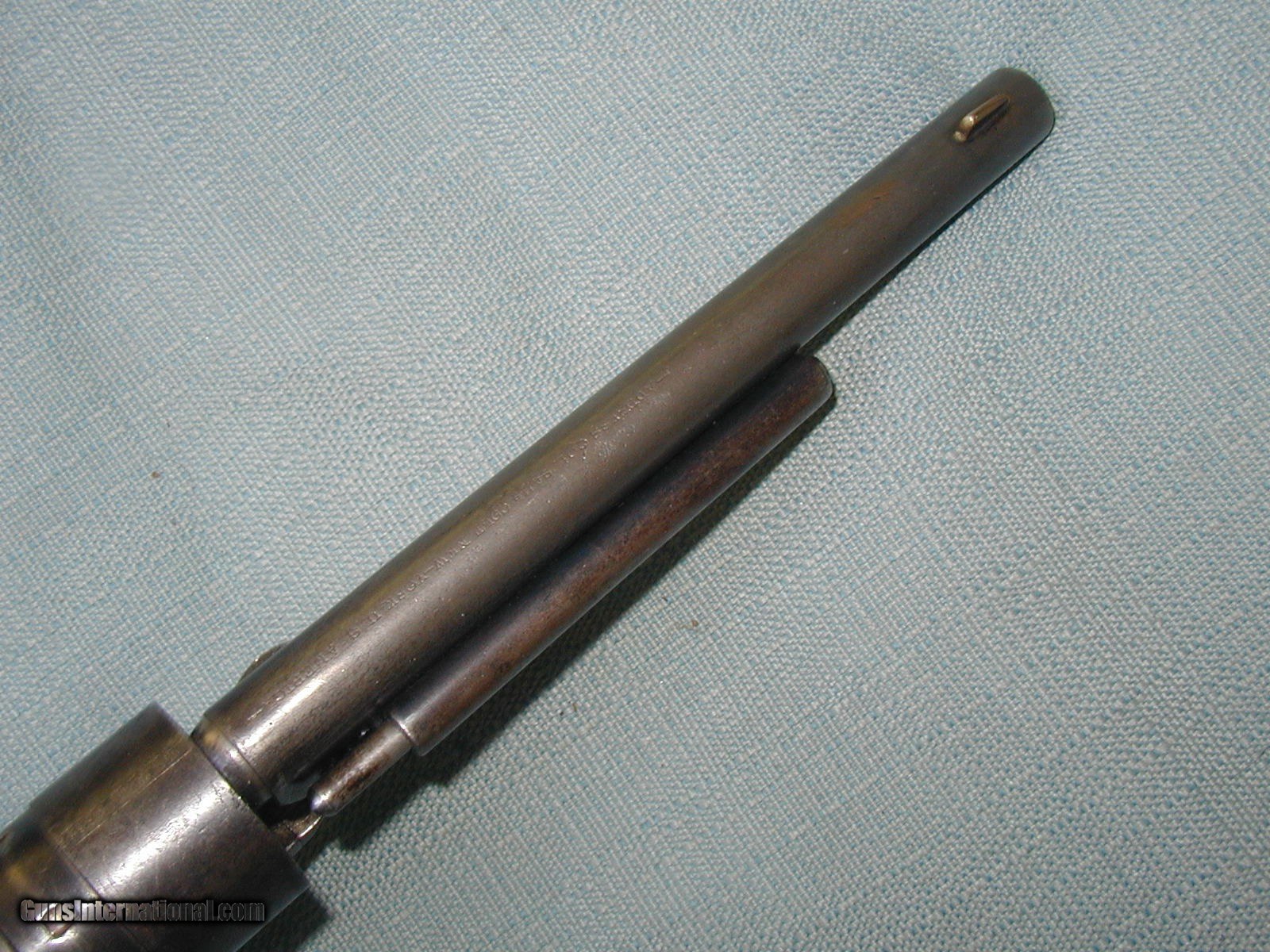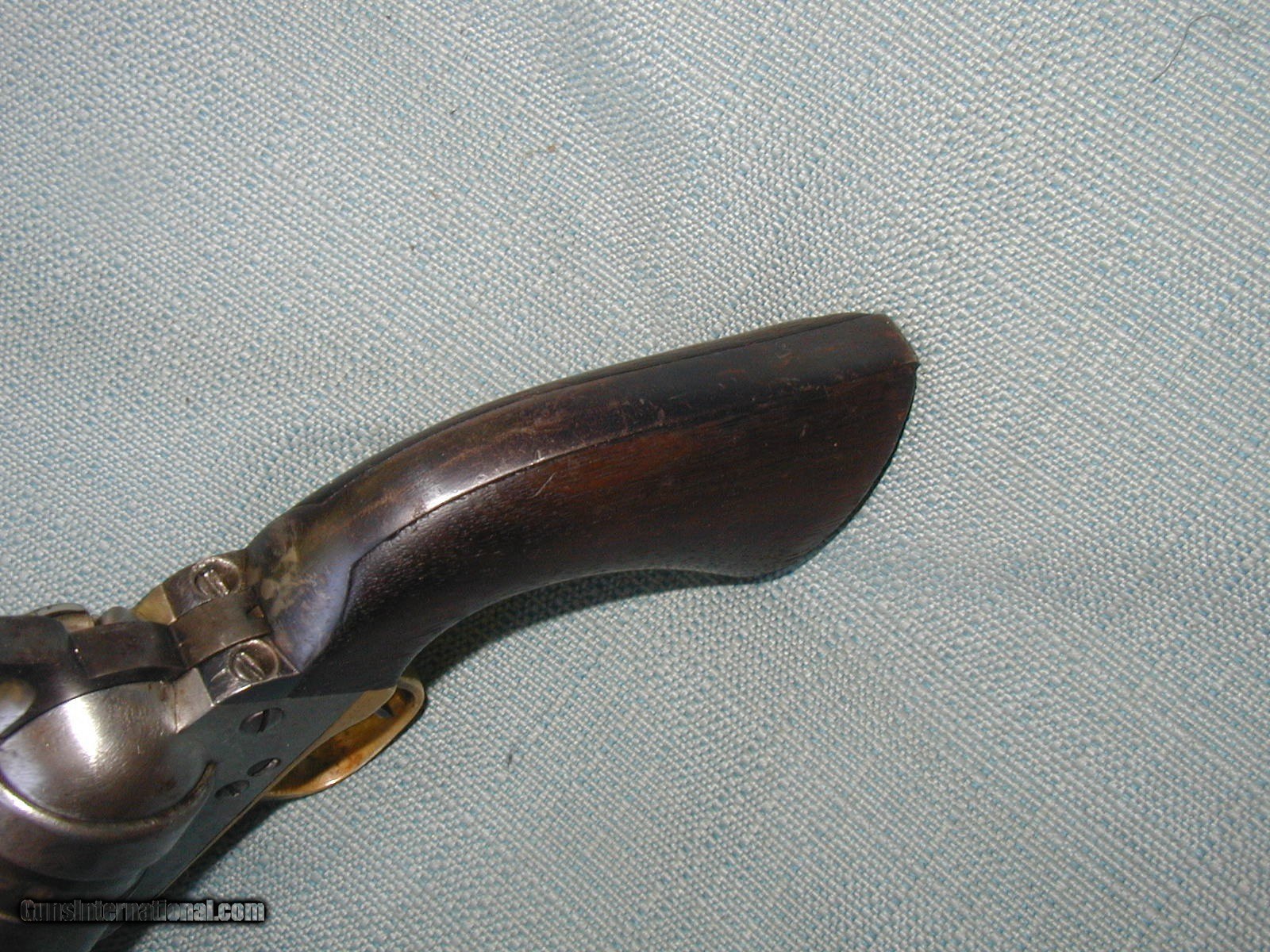 Description: THIS IS A NICE ORIGINAL COLT RICHARDS .44 CONVERSION. IT HAS 80% CYLINDER SCENE, PERFECT WORKING ACTION, VERY GOOD BORE AND IS ALL MATCHING, HOWEVER , THE WEDGE IS UN-NUMBERED...THERE IS BLUE IN THE AREA OF THE BARREL WHERE THE WEDGE IS ON BOTH SIDES, THE BACKSTRAP , AND ON THE CYLINDER, PARTICULARLY IN THE REBATED AREA..... GOOD ORIGINAL GRIPS WITH SOME CORNER CHIPS . ORIGINAL AND UN-ALTERED SOLD Antique: Yes |