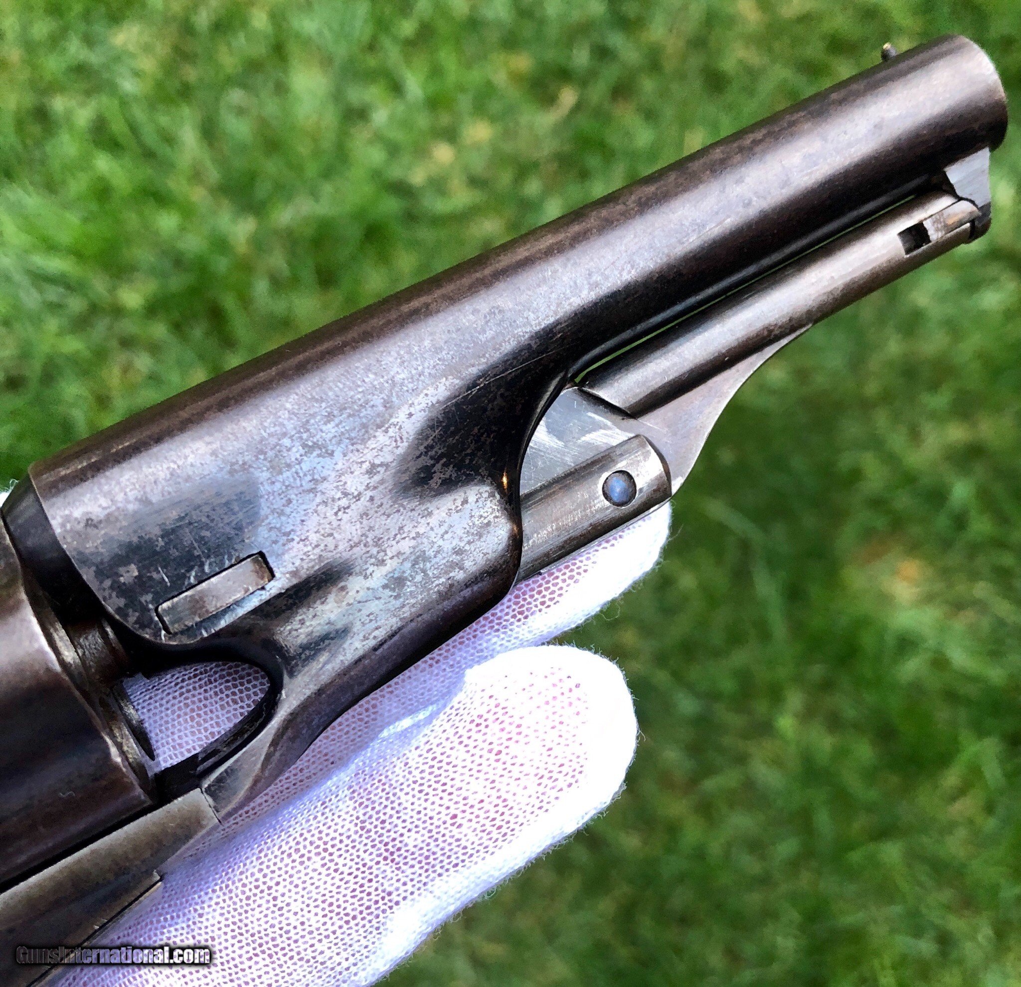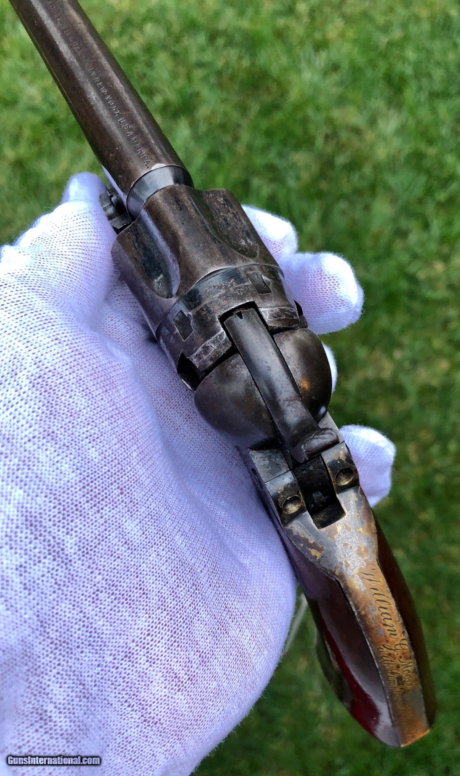 Description: This is a Spectacular Colt 1862 Presentation inscribed "William G. Moore with Compliments of Col Colt". This revolver shows much of its original finish. The color case hardening on the frame is vibrant and strong with the barrel showing areas of bright high polish blue. The grips are more of a higher grade Piano varnish finish as for the presentation. This Colt is part of a known time period where Col Sam colt gifted 3 Colt 1862 Polices to J.D. Cameron, simon Cameron, and William G. Moore. All are known to be identical with the same type of presentation in script and all appear identical. Here is some information regarding William G. Moore: One of the several known recipients of revolvers around this time working in Washington was Secretary of War Simon Cameron whom William G. Moore served as private secretary. Each set was inscribed with the individual's name followed by "with Compliments of Col Colt" on the back strap. As recorded in the Hartford Courant on November 9, 1861, Secretary Cameron and his party as well as that of Governor William A. Buckingham of Connecticut and his staff arrived in Hartford on November 8, 1861, and toured the Colt factory under the guidance of Samuel Colt himself as well as those of the Sharps Rifle Co. They were then conveyed to Armsmear where they were entertained by the Colt family. It is very likely some of these sets were presented at that time either at the factory or in Colt's home including possibly this revolver. The revolver is inscribed in script that matches the other Samuel Colt presentations with "William G. Moore/with Compliments of Col. Colt" along the back strap. William G. Moore (1829-1898) worked in journalism and then public works in Washington, D.C. prior to the war and joined the National Rifles and moved from the rank of private to corporal and sergeant in that unit between April 15 and July 15, 1861. Most of the members of the National Rifles at the outbreak of the war left to join Confederate units, but Moore and other Union patriots refilled the ranks. On June 19, 1861, he is listed as having been given the rank of captain and position of assistant quartermaster. He became Secretary Cameron's private secretary. Cameron only served in that role from March 5, 1861 until January 14, 1862, and was forced to resign due to well-founded corruption allegations. Colt himself was fighting off claims of corruption and double dealing at this time as well. On July 23, 1861, the National Republican recorded that Captain Moore was a spectator at the 1st Battle of Bull Run just southwest of Washington in July 1861 and picked up a wounded soldier's musket and gear and joined the fight alongside the Zouaves until the Union retreat. At the end of the war and early in reconstruction from May 1, 1865, to November 5, 1866, Moore served as a major and the assistant adjutant-general of volunteers. In December 1865, he received a brevet commission as lieutenant colonel and colonel of volunteers. In November 1866, he was appointed paymaster and also served as private secretary to President Andrew Johnson until 1868. On March 2, 1867, he was made a lieutenant colonel in the U. S. Army. He resigned in April of 1870. From December 1896 until his death July 1898, he served as the major and superintendent of the Washington, D.C. Police Department. This colt is mechanically excellent and is an excellent Historic Colt. The case is the original case this revolver was presented with. It contains an original high condition flask, a .36P mold, bullet mold, and cap tin. Overall an extremely historic and desireable set that would be an excellent addition to any Collector's Colt collection. More photographs can be found at w w w. haiglersvolcanictrading. com Asking: $17,500.00 SOLD Antique: Yes |