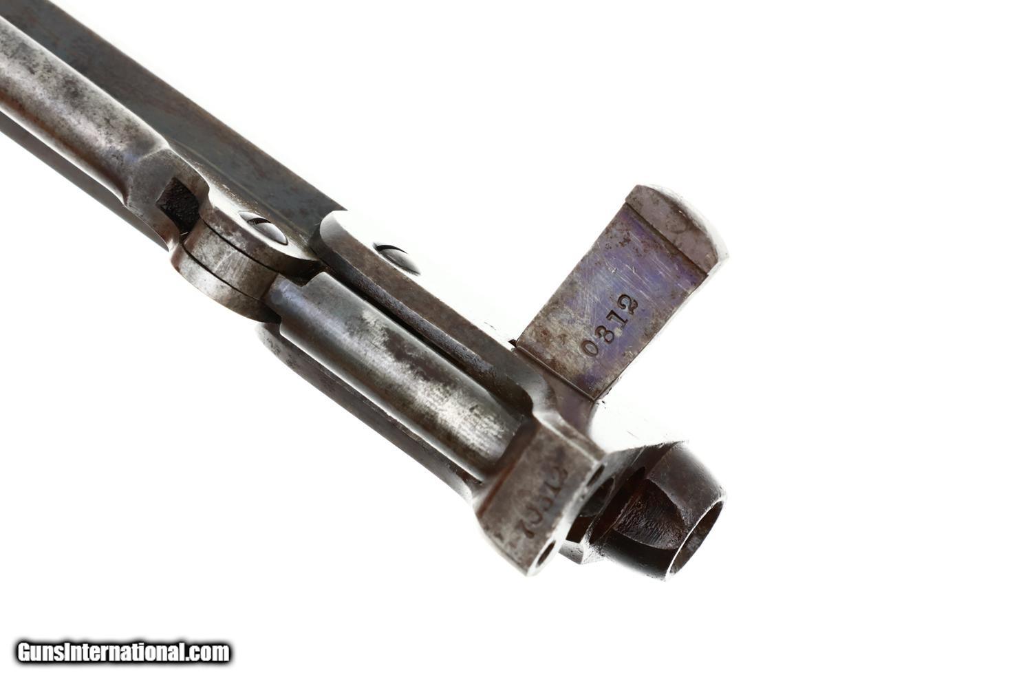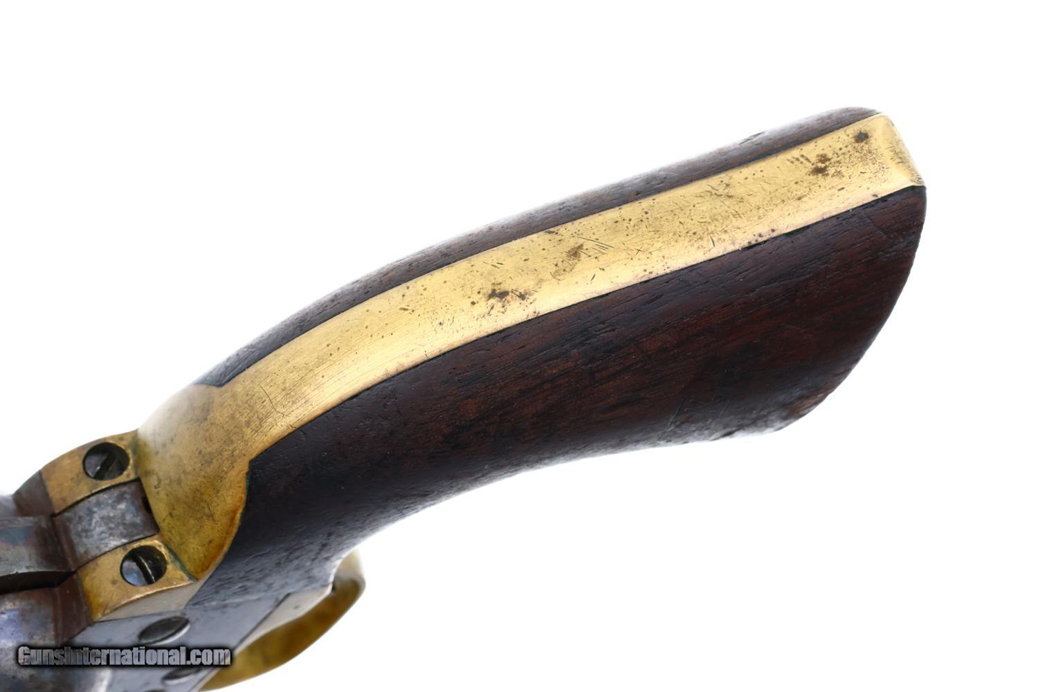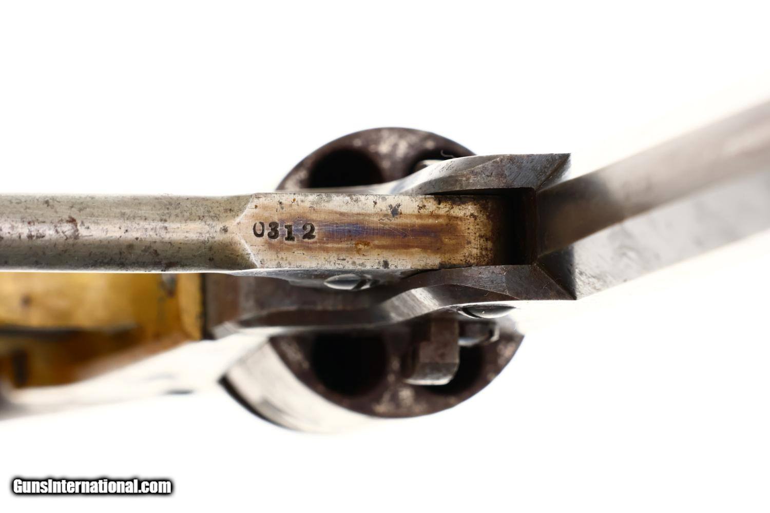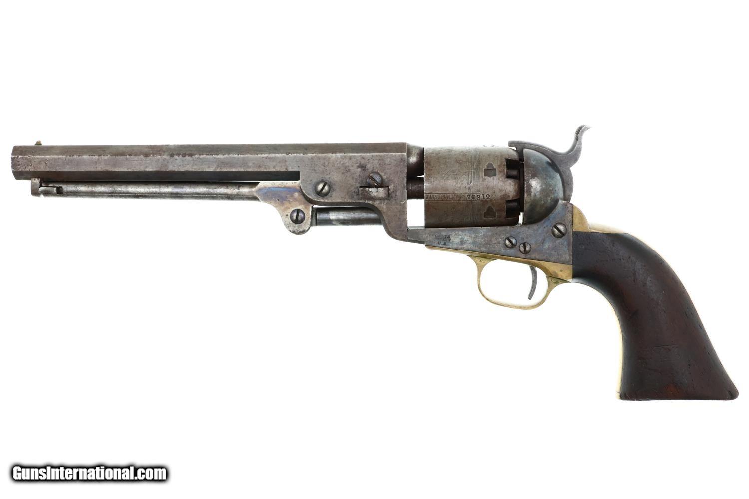 G-VG overall with most of the blued parts having a toned to a brown-gray Slightly better condition case hardened parts whose colors are present but faded. The brass frame has a yellow-mustard color with shallow handling marks, the inspector initials on the left side well delineated. All serial numbers well defined. Grips are oil-stained, dark, with scattered handling marks and thinning of the cartouches. The cartouche on the left panel is legible, only the outline is visible on the right. Dull bore with easily discernible rifling. Correct manual mechanics, with each cylinder locking firmly into place. A nice and all matching U.S. military Colt 1851 Navy revolver. ANTIQUE.