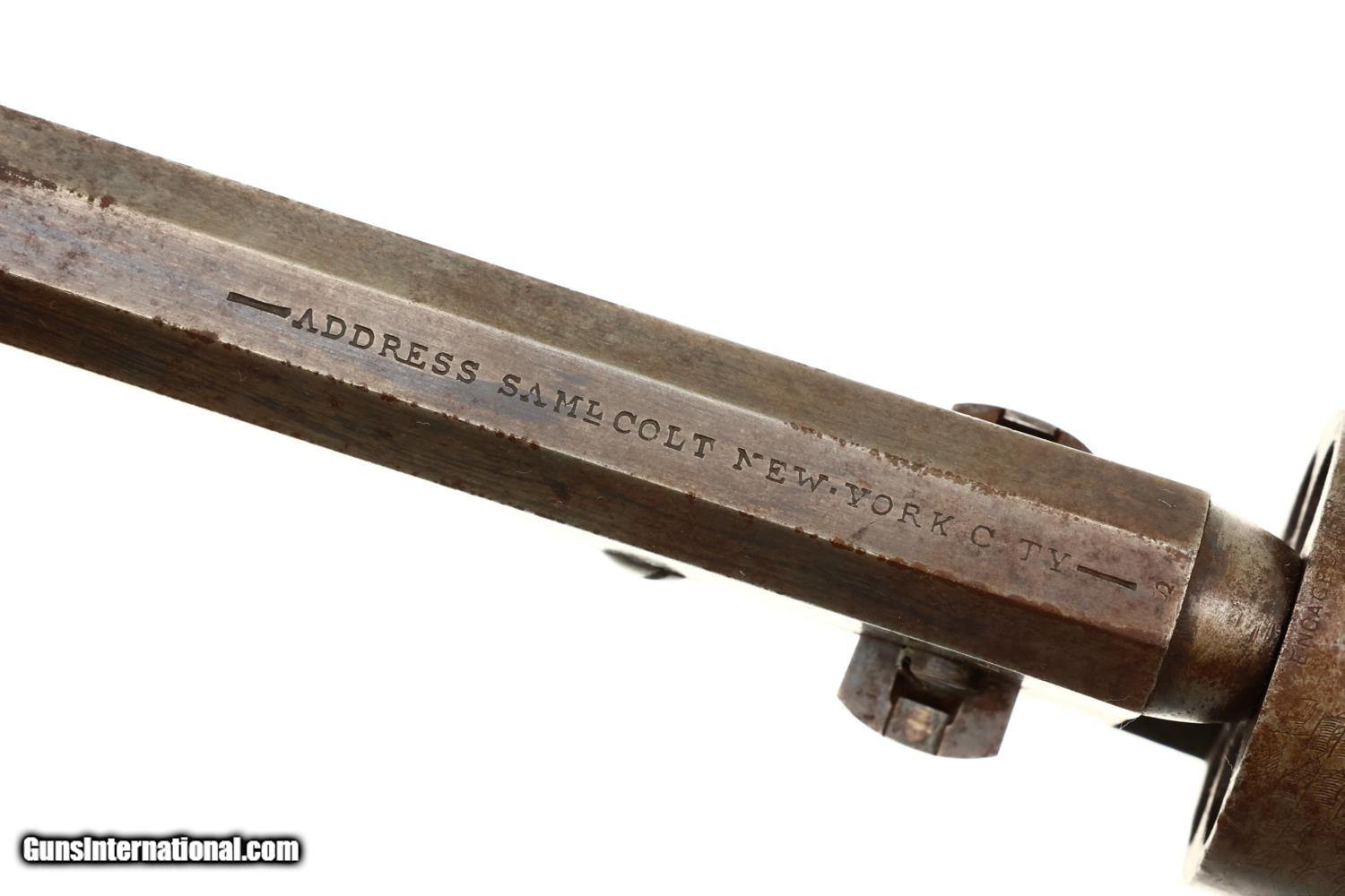 Standard configuration Colt 1851 Navy revolver in .36 percussion, serial number 70312, made from 1850-1873 (approximately 257,348 total produced), chambered in .36 caliber, with 7.5-inch octagonal barrel and classic six-shot percussion cylinder. Inverted cone front sight, hammer notch rear sight. Top of barrel marked "ADDRESS SAML COLT NEW-YORK CITY". Left side of frame marked: COLTS PATENT U.S. Brass backstrap and inspected trigger guard. Matching serial number "70312" appearing on the cylinder and frame, trigger guard housing, and underside of barrel, while the ramrod and locking wedge bears the last four digits "0312". The cylinder displays Waterman Ormsby's engraved scene depicting the victory of the Second Texas Navy at the Battle of Campeche on May 16, 1843, a naval theme chosen by Colt as appreciation to the Texas Navy who had purchased the earlier Colt Paterson Revolver though, despite the "Navy" designation, this model was chiefly purchased by civilians and military land forces. Fitted with smooth walnut grips, both panels with cartouches.
