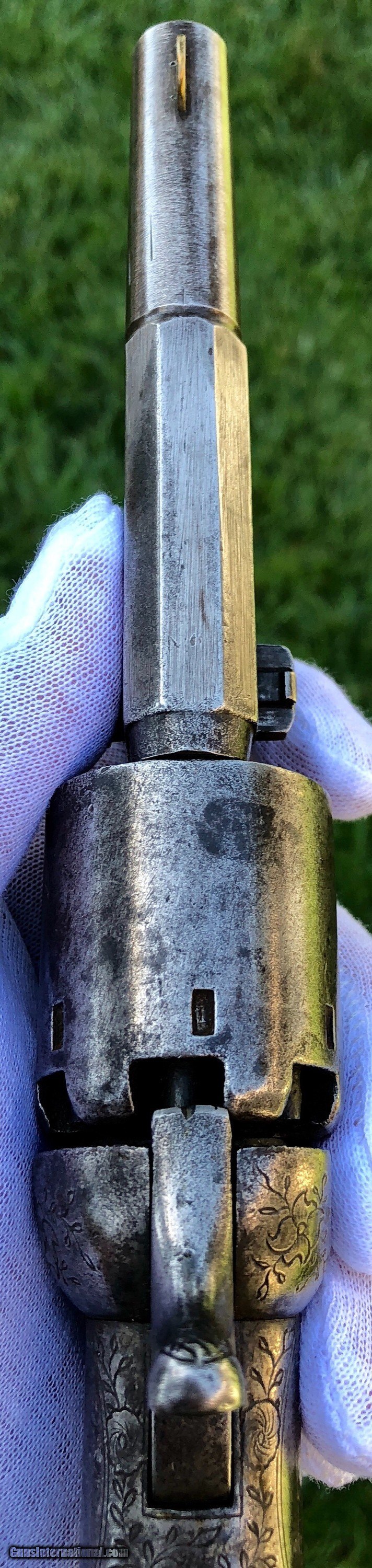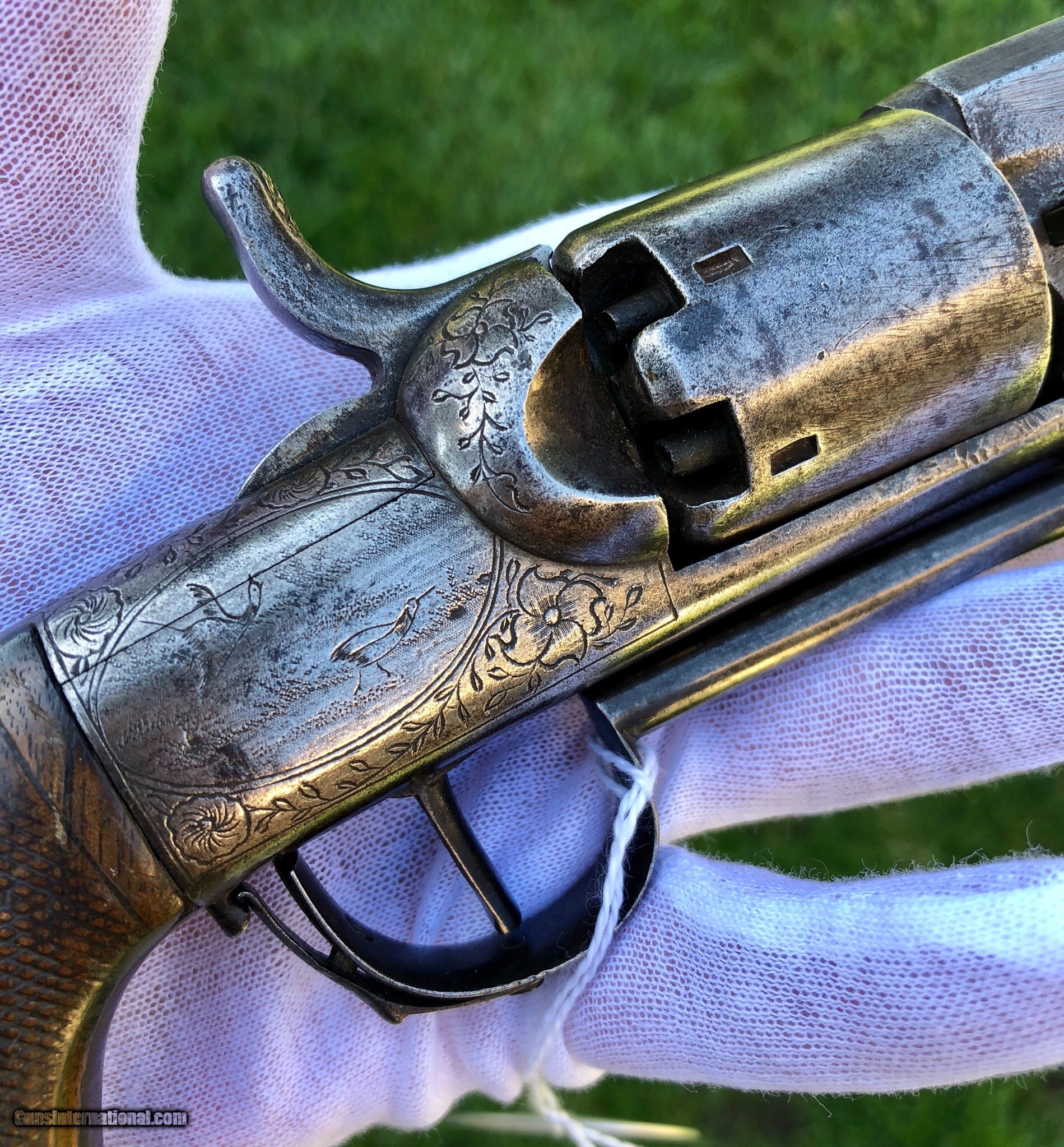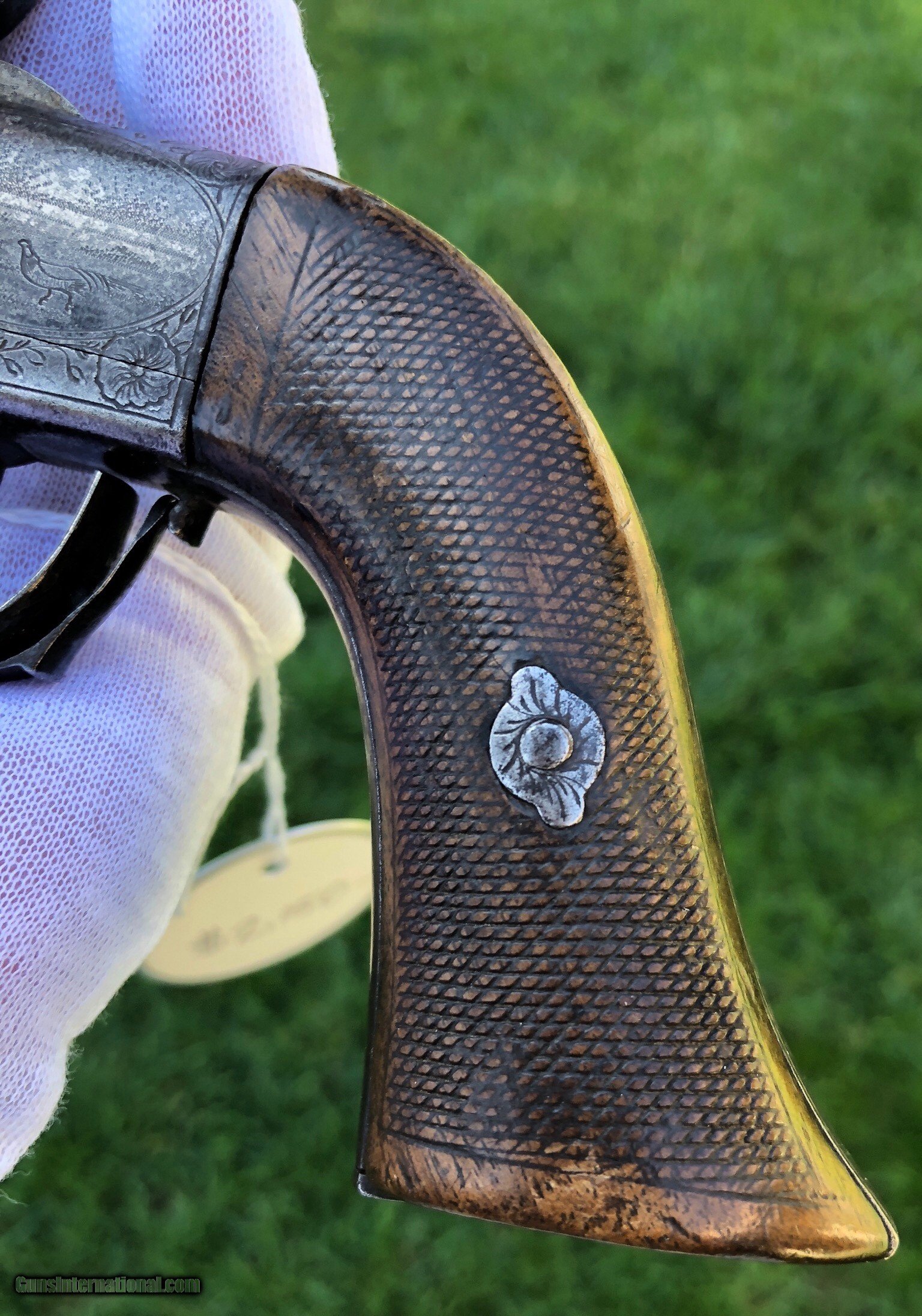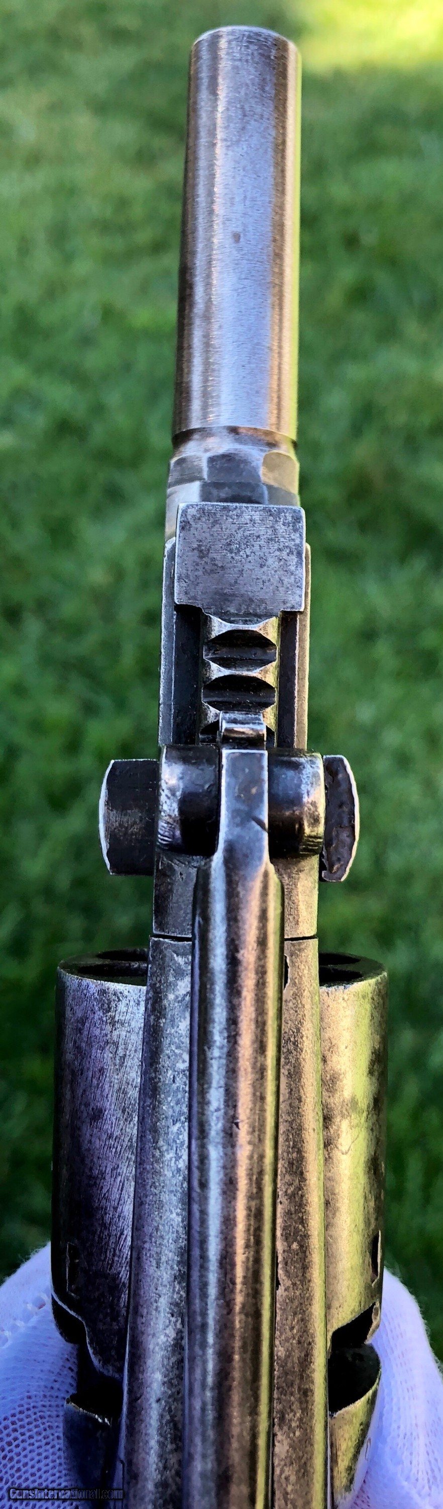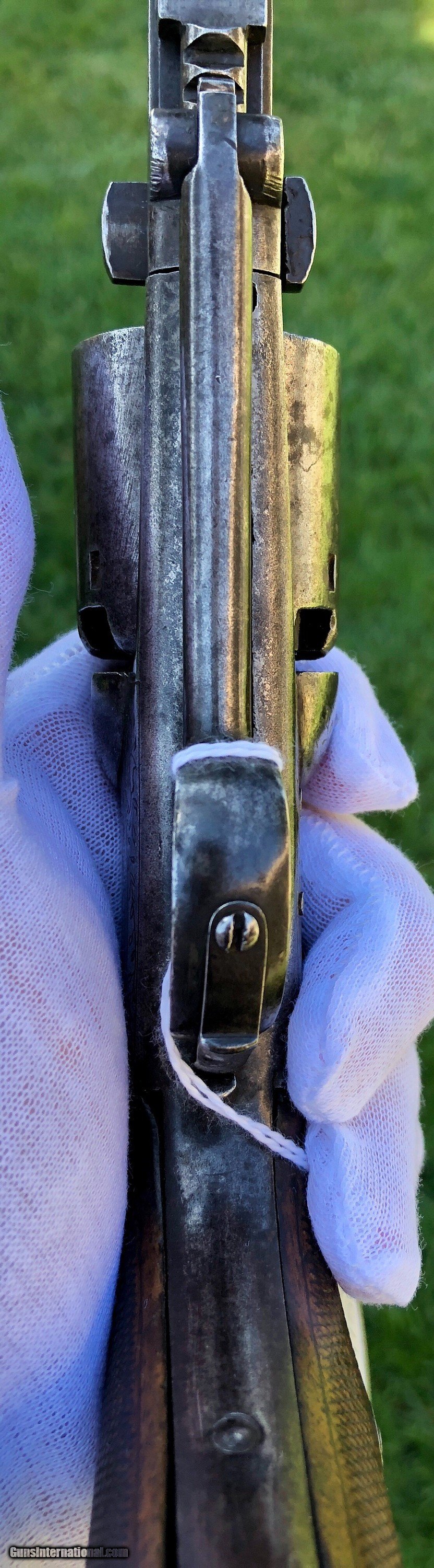 Description: This is a very interesting Brevette Colt, it has a strange Ratchet Lever Latch system. The frame has 2 engraved panel scenes also. Mechanically the cylinder will most of the time rotate freely. When the hammer is cocked back it will rotate the cylinder but not lock up completely. The revolver is a light grey patina. The grips have two chips near the rear bottom edge. Overall a very interesting Brevette! Shipping is $35 fully insured. $1,750.00 SOLD Antique: Yes |