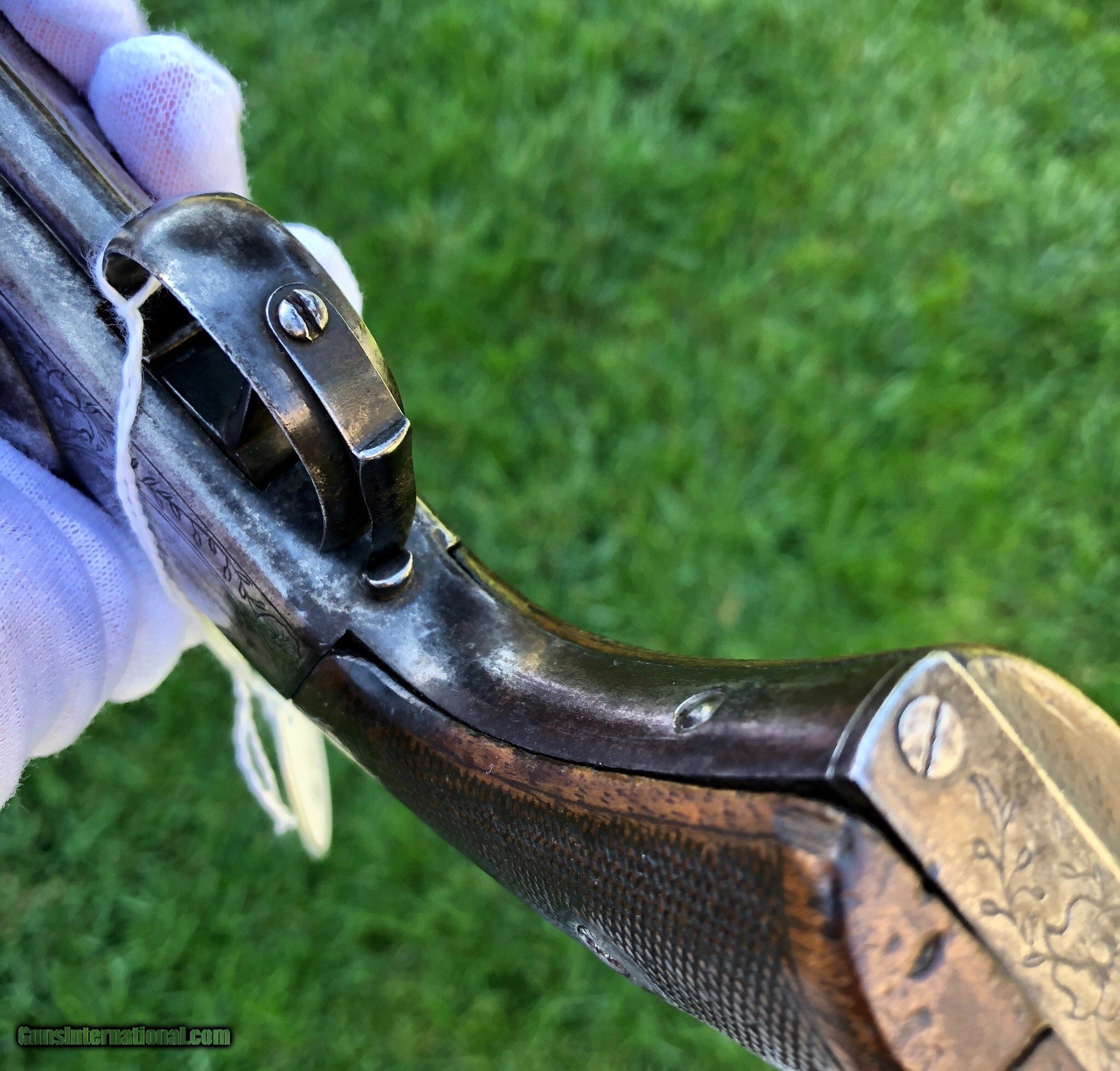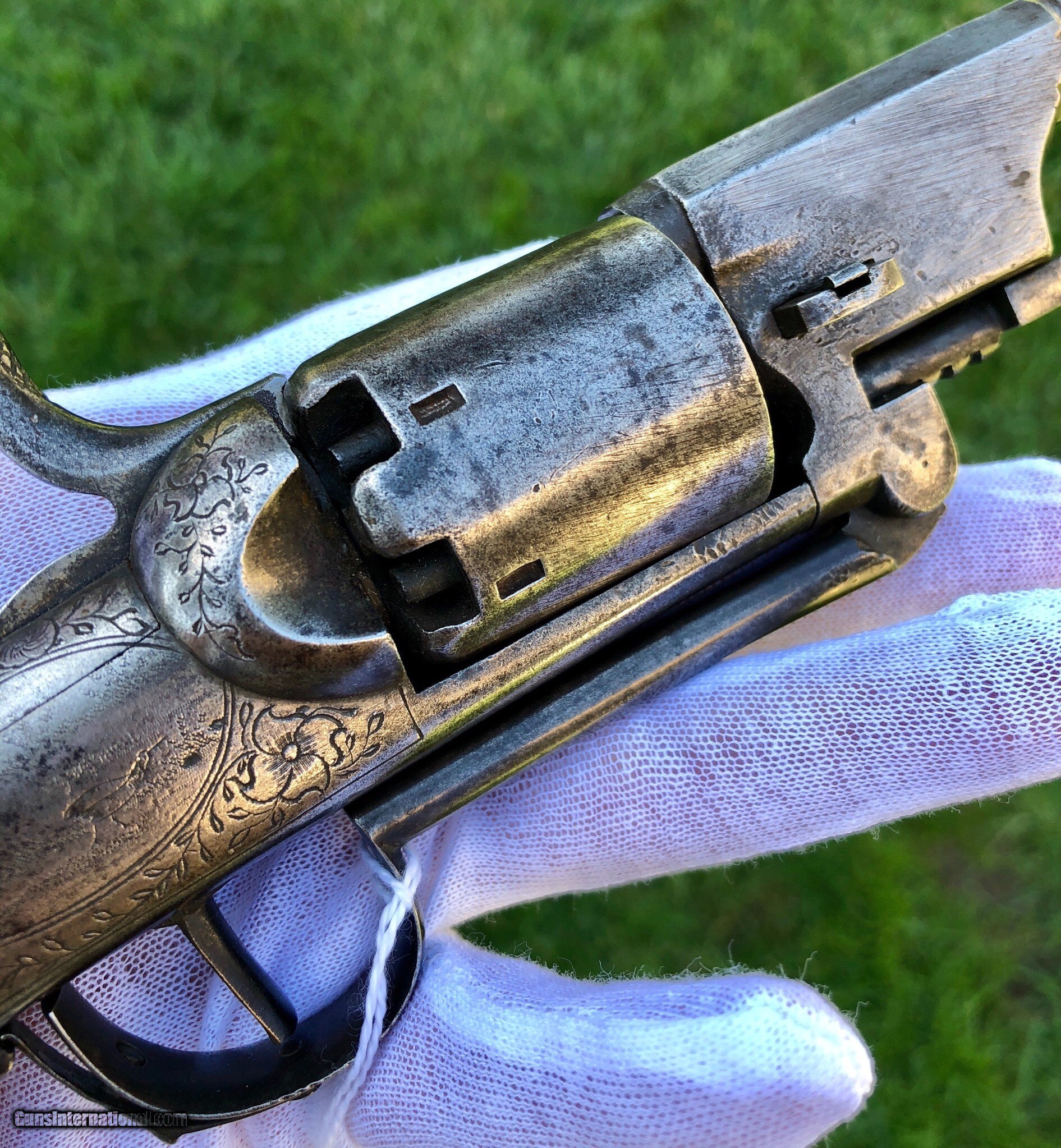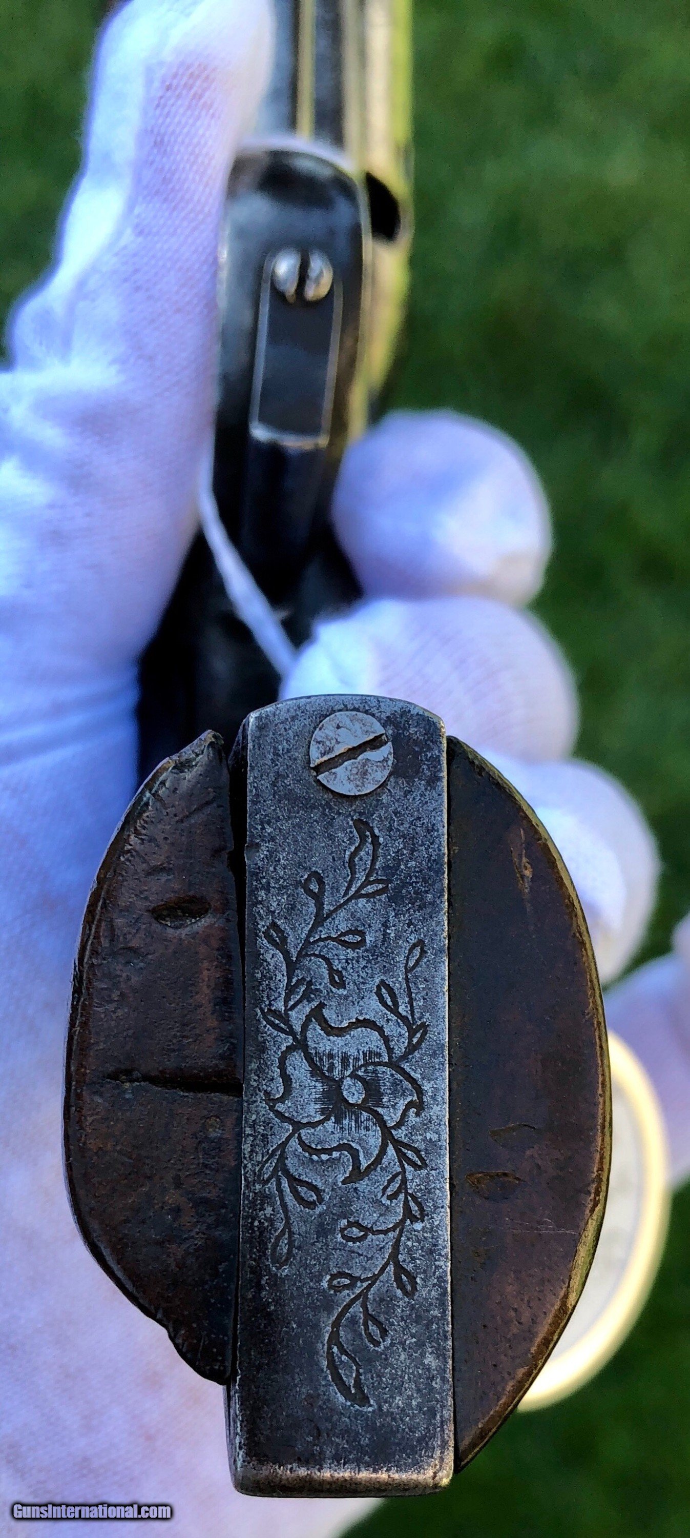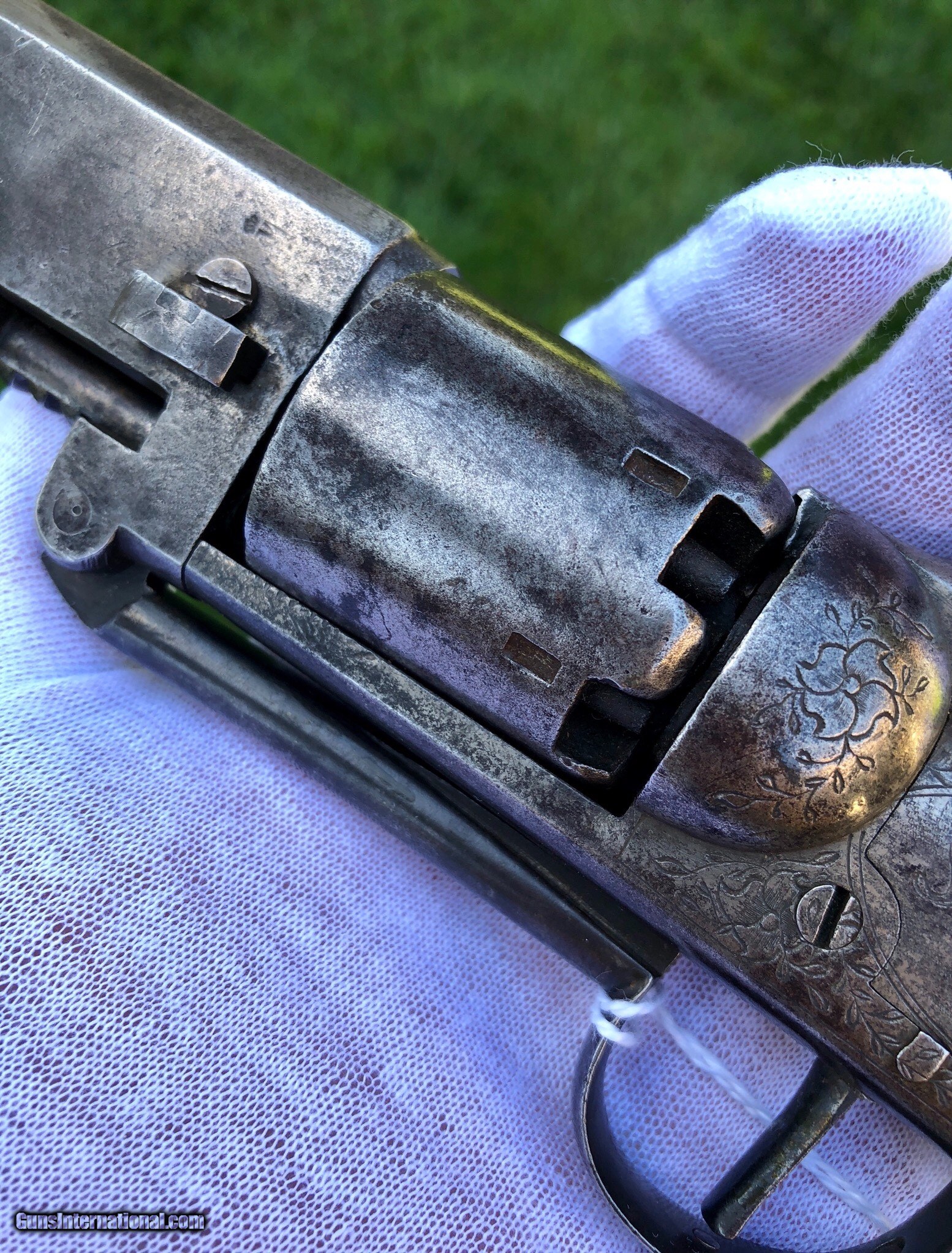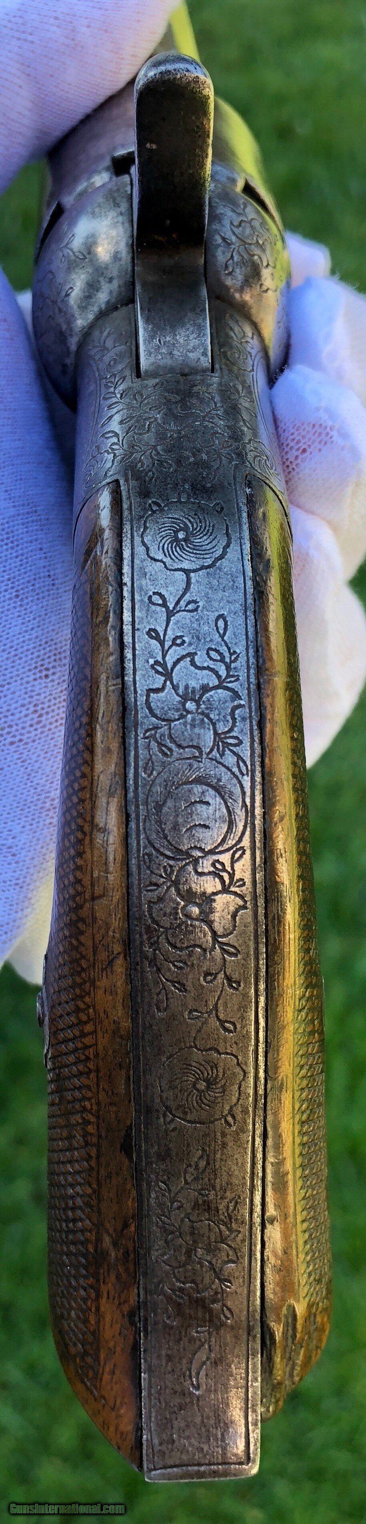Description: This is a very interesting Brevette Colt, it has a strange Ratchet Lever Latch system. The frame has 2 engraved panel scenes also. Mechanically the cylinder will most of the time rotate freely. When the hammer is cocked back it will rotate the cylinder but not lock up completely. The revolver is a light grey patina. The grips have two chips near the rear bottom edge. Overall a very interesting Brevette! Shipping is $35 fully insured. $1,750.00 SOLD Antique: Yes |