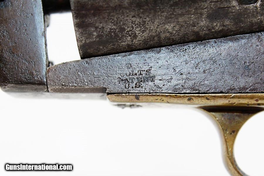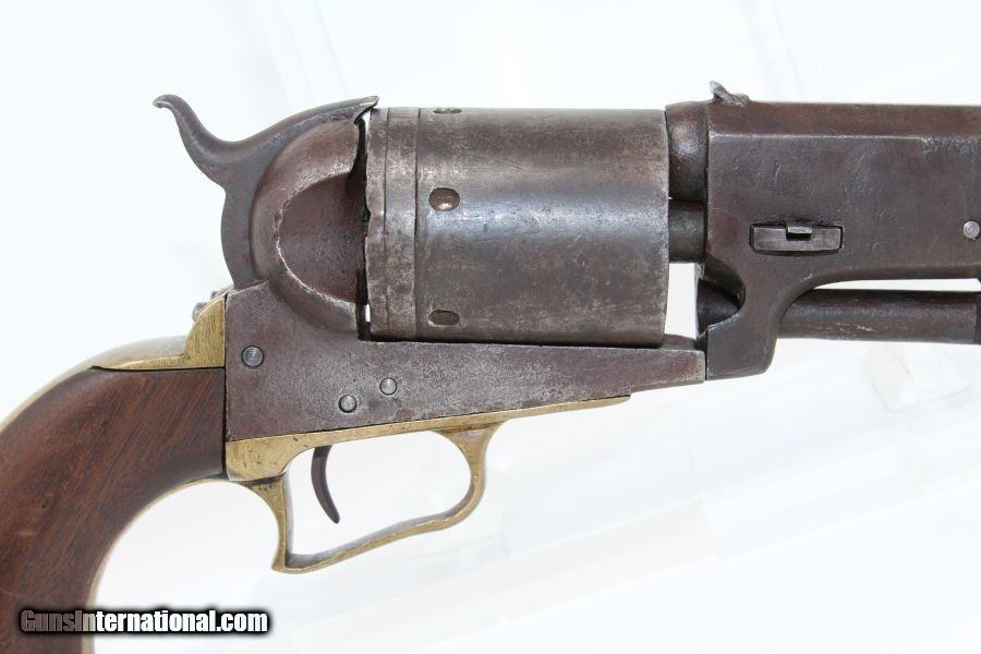 Description: RARE Antique 1st Model COLT DRAGOON in .44 HENRY Neat Companion for a Henry or Winchester 1866! Here we present a unique antique Colt 1st Model Dragoon Revolver Converted to .44 Henry, originally made in .44 percussion in 1849 in Hartford, Connecticut. The Colt Dragoon hardly needs an introduction. It was the refined predecessor to the Colt Walker and was a horse pistol in every sense of the word. Weighing over 4 lbs. you would definitely want a horse to carry it for you. It was also designed to be able to take down man or beast on the battlefield. Though it was not Colt’s best seller, it has become one of the most iconic of the Colt pistols. Only about 7,000 of this variant was ever produced. Many were used in the American Civil War, though the Union would adopt the much smaller Colt 1860 Army, a much-streamlined version with the same .44 caliber firepower. This one is “US” marked on the frame. It features the earlier square-backed trigger guard as opposed to the later rounded version. These 1st models are scarce, but this one is even more unique due to its having been converted to .44 Henry by a period gunsmith. This would have made a great companion sidearm to a Henry or Winchester Model 1866. Someone liked this gun enough to have it converted for continued use. This was the precursor to the Colt Single Action Army Revolvers that would come in the early-to-mid 1870s. The overall condition is good. The iron surfaces are dark with age. The markings are mostly clear. The numbers match with the exception of the unnumbered barrel wedge. The grips are in good shape with the handling marks you would expect. The bore is in very good shape with strong rifling. The action is strong. Own the original! This is a legitimate antique and not a reproduction. Barrel is 7-1/2 inches. Caliber: .44 Henry Overall condition as seen in photos. Very Fast. Very Safe. FREE SHIPPING WORLDWIDE. Delivered directly to your door by express mail! Guaranteed AUTHENTIC & Includes CERTIFICATE OF AUTHENTICITY. ancestryguns $9450 #8140 SOLD Antique: Yes |