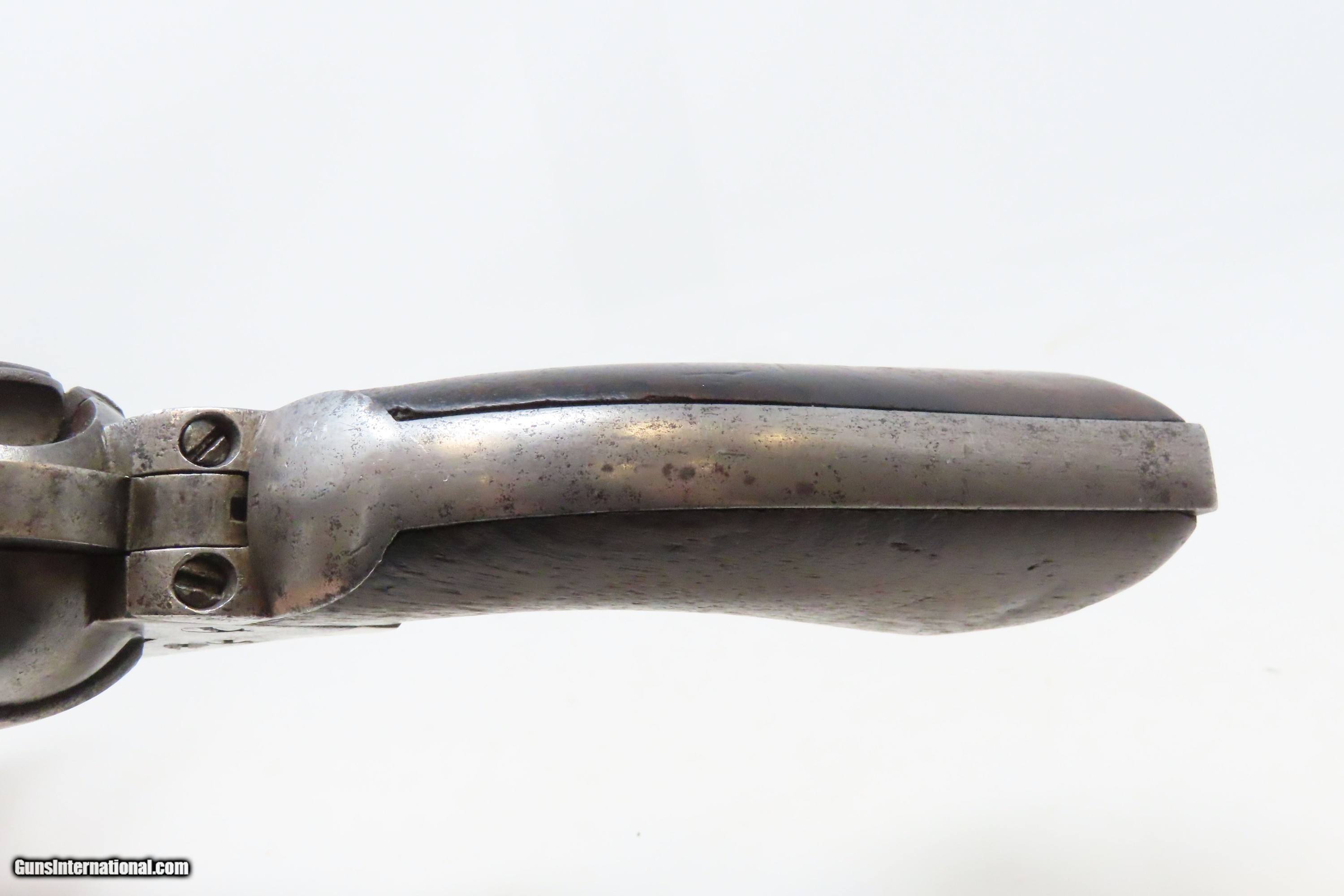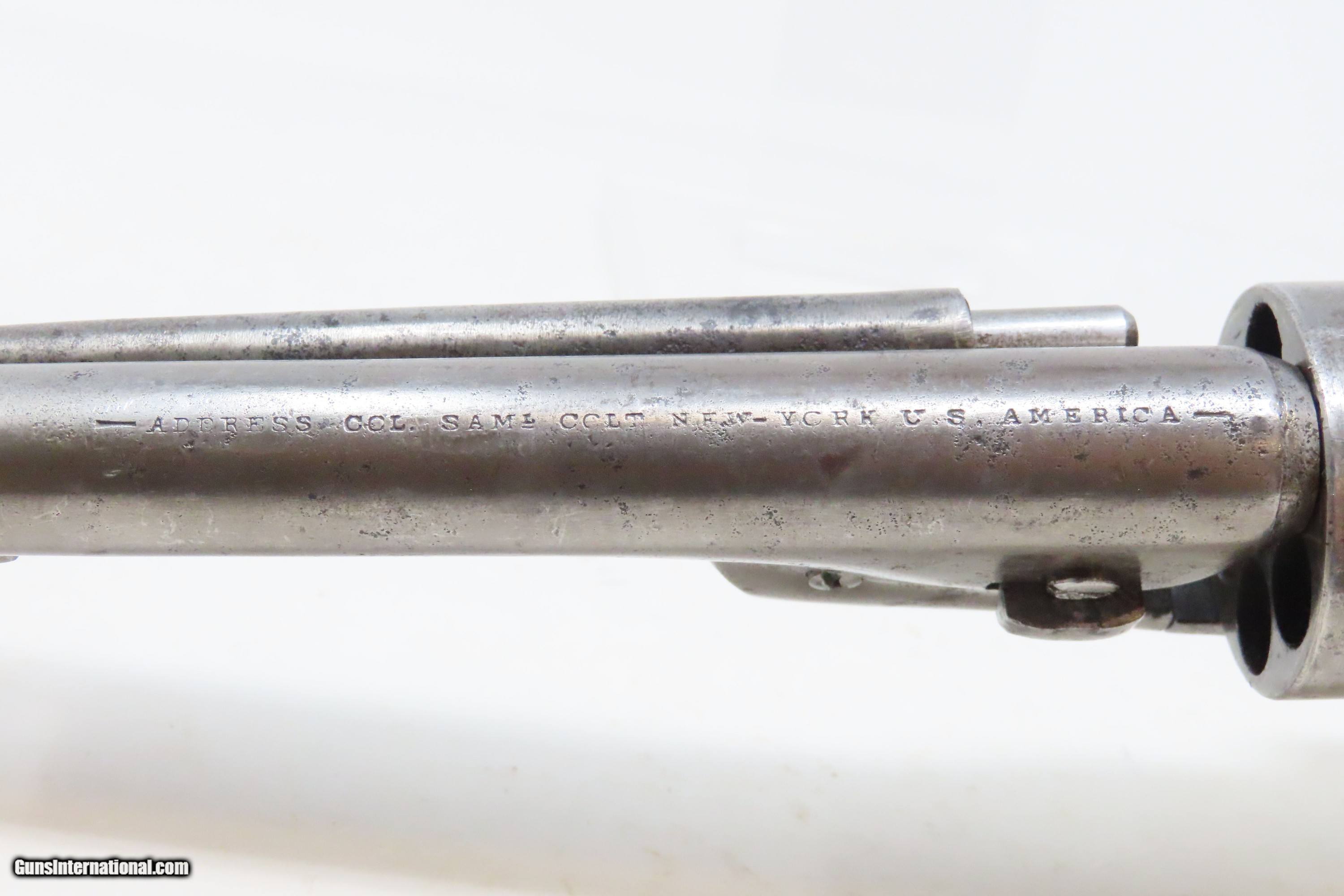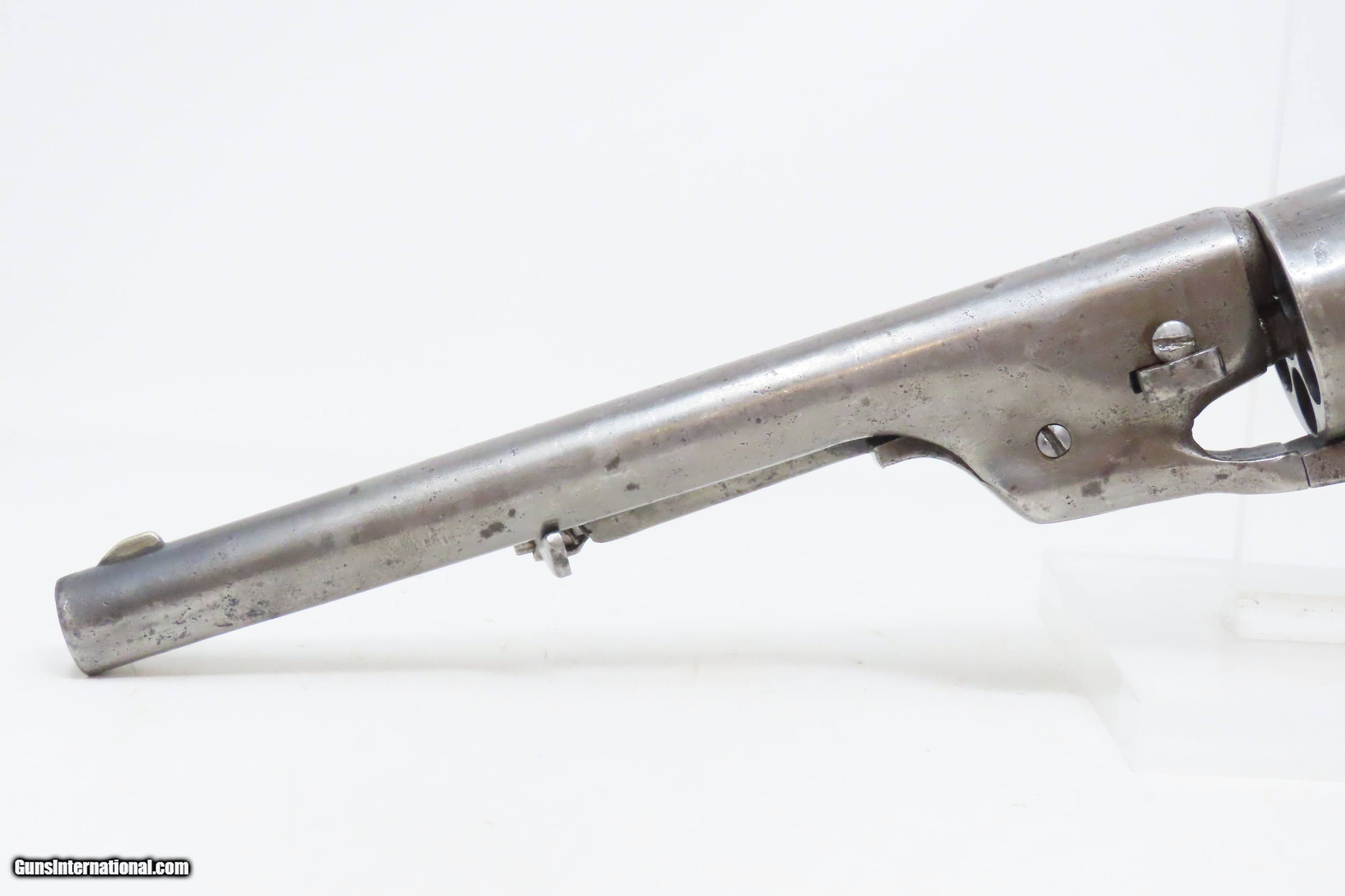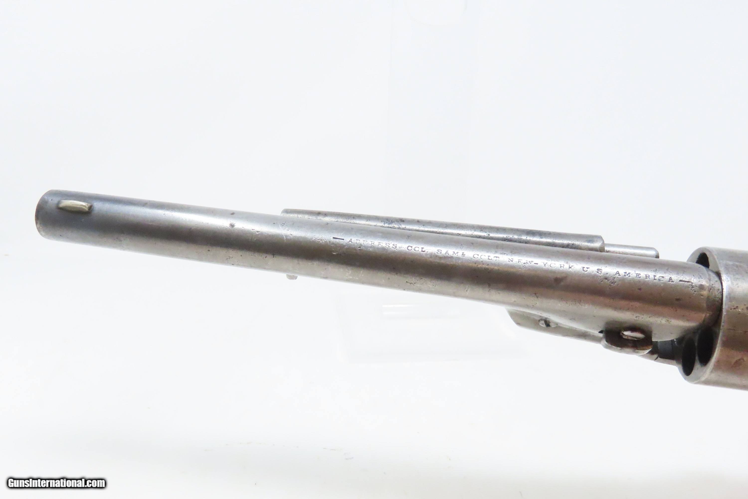 Description: RARE Antique COLT M1860 ARMY “12-Stop” RICHARDS Conversion .44 CF Revolver VERY SMALL NUMBER MADE with “12-Stop” CYLINDER Here we present an antique Period Engraved Colt Model 1860 Army Richards Conversion Revolver, manufactured in 1864 and converted sometime between 1873-78. Of the 9000 that were converted, only a very small number of the early production revolvers utilized the 12-Stop cylinders. Charles B. Richards was an engineer who worked for the Colt’s Patent Fire Arms Company and was awarded a patent for converting Colt percussion models to breech loading cartridge revolvers. After the onset of the American Civil War, Richards eventually became Superintendent of Engineering at the Colt factory in Hartford, Connecticut. Richards' first major post-Civil War design was Colt's second attempt at metallic cartridge conversion known as the "Richards Conversion". Colt's revolvers to this point had been black powder percussion pistols. However, the U.S. Army wanted a revolver that held metallic cartridges, which Colt could not produce because the Rollin White patent was still held by rival Smith & Wesson. Colt's only solution would be to bore through the rear of their cylinders and devise a new method of ignition and case extraction. The Richards Conversion was performed on this Colt 1860 Army revolver. The caliber was .44 Colt Centerfire. This conversion added a breechplate with a firing pin and a rear sight mounted on the breechplate. Colt manufactured 9,000 of these revolvers between 1873 and 1878. In 1873 Colt performed the same conversion on the Model 1851 and Model 1861 revolvers for the U.S. Navy in .38 rimfire. The Richards conversion was an instant success, all being done concurrently with the iconic Colt Single Action Army, which Richards was responsible for the development of! The 1860 Army was the single most used pistol of the American Civil War. Over 200,000 were made from 1860 to 1873, and 156,000 of those were made by the end of the war in 1865. The overall condition is good. Gray patina. The action is excellent. The bore is very good with strong rifling. The grip shows use and there is a small chip where the frame meets the left bottom corner. Numbers match except for the cylinder. Own the original! This is a legitimate antique and not a reproduction. Barrel is 8 inches. Caliber: .44 Centerfire Overall condition as seen in photos. Very Fast. Very Safe. FREE SHIPPING WORLDWIDE. Delivered directly to your door by express mail! Guaranteed AUTHENTIC & Includes CERTIFICATE OF AUTHENTICITY. ancestryguns $4000 #240009 SOLD Antique: Yes |