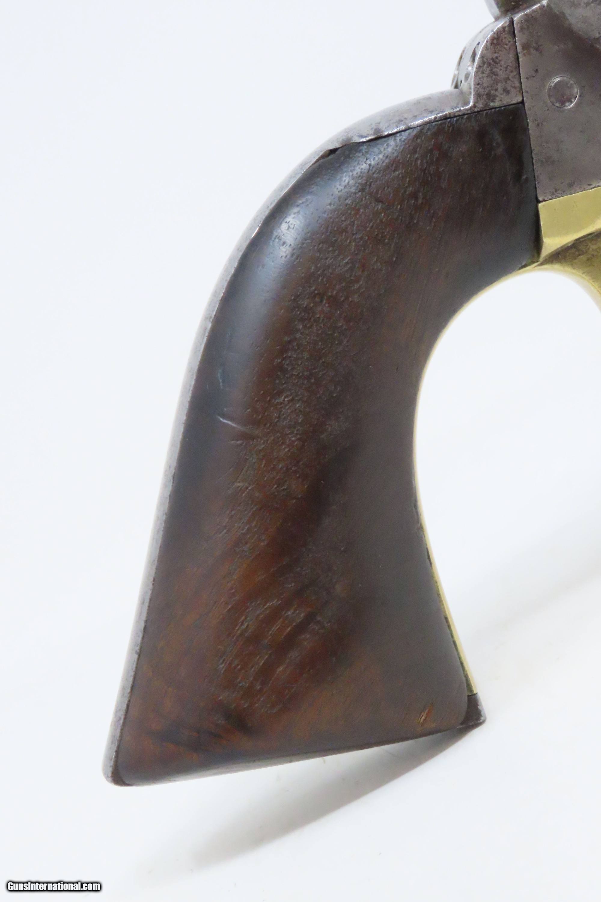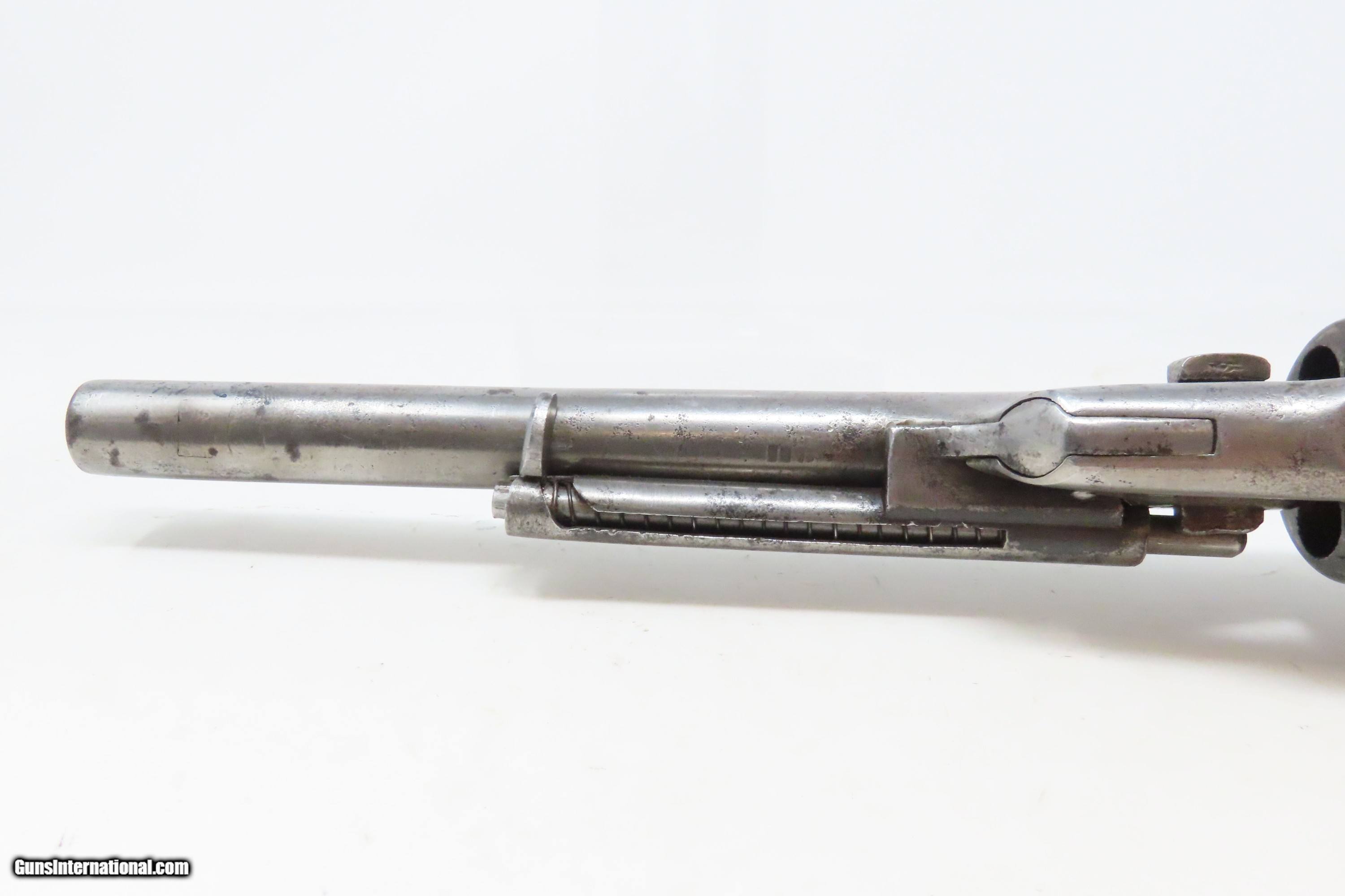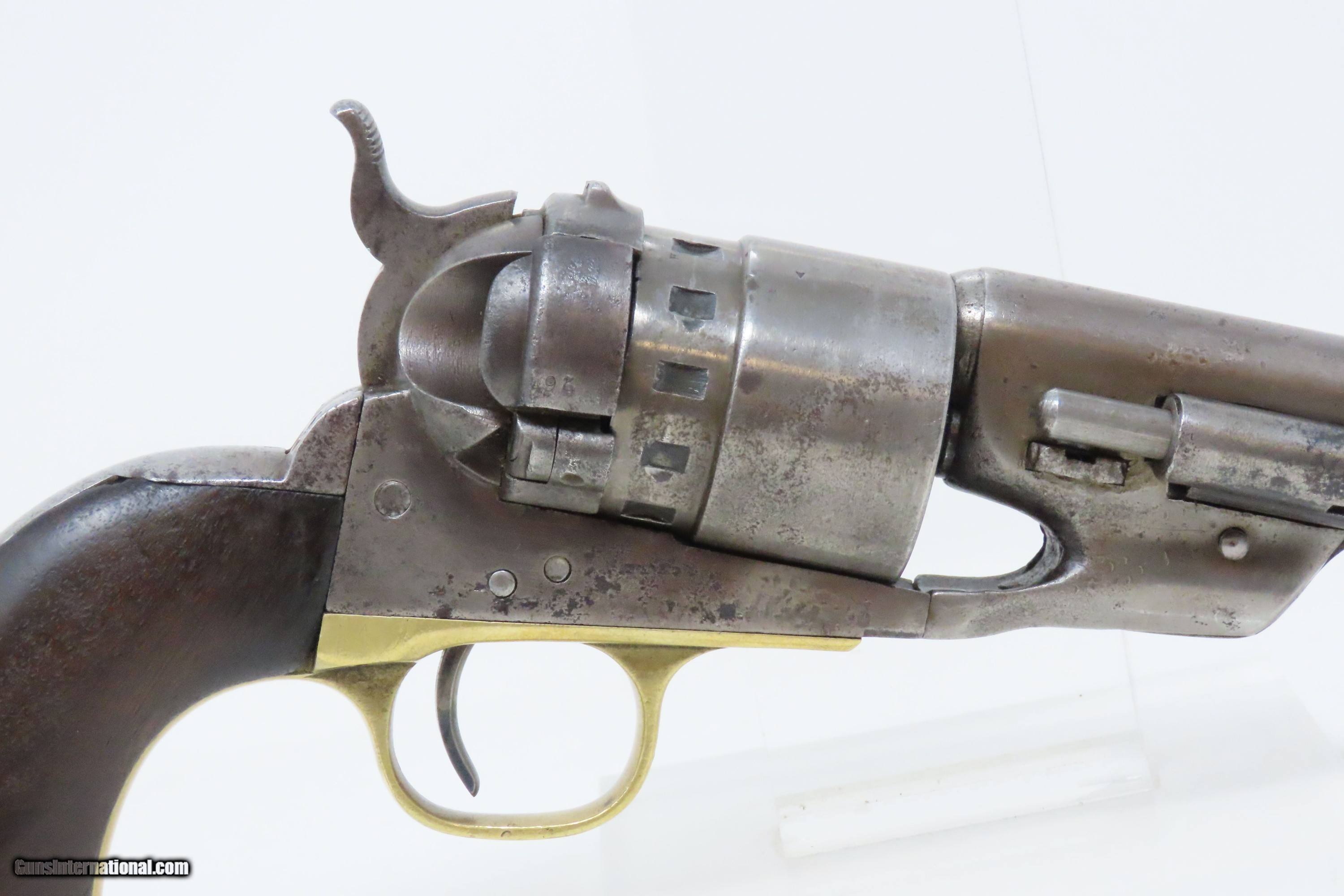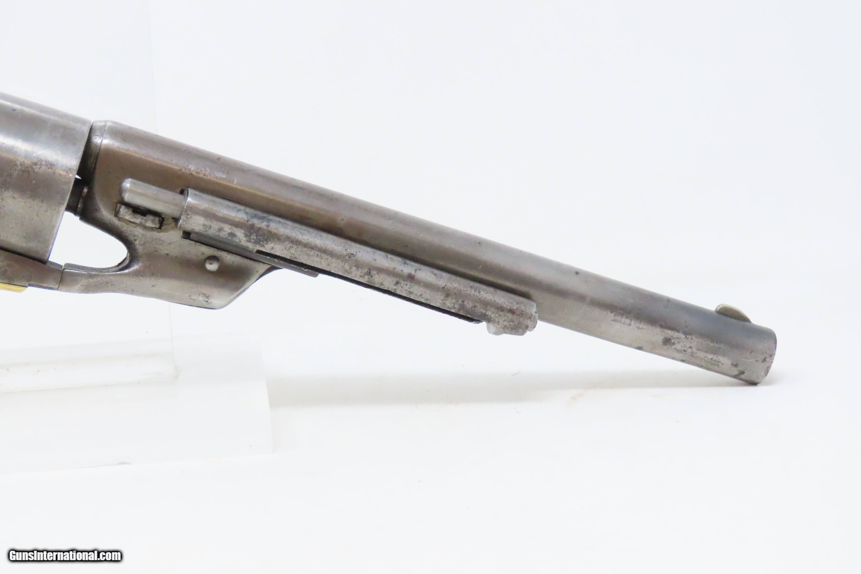 Description: RARE Antique COLT M1860 ARMY “12-Stop” RICHARDS Conversion .44 CF Revolver VERY SMALL NUMBER MADE with “12-Stop” CYLINDER Here we present an antique Period Engraved Colt Model 1860 Army Richards Conversion Revolver, manufactured in 1864 and converted sometime between 1873-78. Of the 9000 that were converted, only a very small number of the early production revolvers utilized the 12-Stop cylinders. Charles B. Richards was an engineer who worked for the Colt’s Patent Fire Arms Company and was awarded a patent for converting Colt percussion models to breech loading cartridge revolvers. After the onset of the American Civil War, Richards eventually became Superintendent of Engineering at the Colt factory in Hartford, Connecticut. Richards' first major post-Civil War design was Colt's second attempt at metallic cartridge conversion known as the "Richards Conversion". Colt's revolvers to this point had been black powder percussion pistols. However, the U.S. Army wanted a revolver that held metallic cartridges, which Colt could not produce because the Rollin White patent was still held by rival Smith & Wesson. Colt's only solution would be to bore through the rear of their cylinders and devise a new method of ignition and case extraction. The Richards Conversion was performed on this Colt 1860 Army revolver. The caliber was .44 Colt Centerfire. This conversion added a breechplate with a firing pin and a rear sight mounted on the breechplate. Colt manufactured 9,000 of these revolvers between 1873 and 1878. In 1873 Colt performed the same conversion on the Model 1851 and Model 1861 revolvers for the U.S. Navy in .38 rimfire. The Richards conversion was an instant success, all being done concurrently with the iconic Colt Single Action Army, which Richards was responsible for the development of! The 1860 Army was the single most used pistol of the American Civil War. Over 200,000 were made from 1860 to 1873, and 156,000 of those were made by the end of the war in 1865. The overall condition is good. Gray patina. The action is excellent. The bore is very good with strong rifling. The grip shows use and there is a small chip where the frame meets the left bottom corner. Numbers match except for the cylinder. Own the original! This is a legitimate antique and not a reproduction. Barrel is 8 inches. Caliber: .44 Centerfire Overall condition as seen in photos. Very Fast. Very Safe. FREE SHIPPING WORLDWIDE. Delivered directly to your door by express mail! Guaranteed AUTHENTIC & Includes CERTIFICATE OF AUTHENTICITY. ancestryguns $4000 #240009 SOLD Antique: Yes |