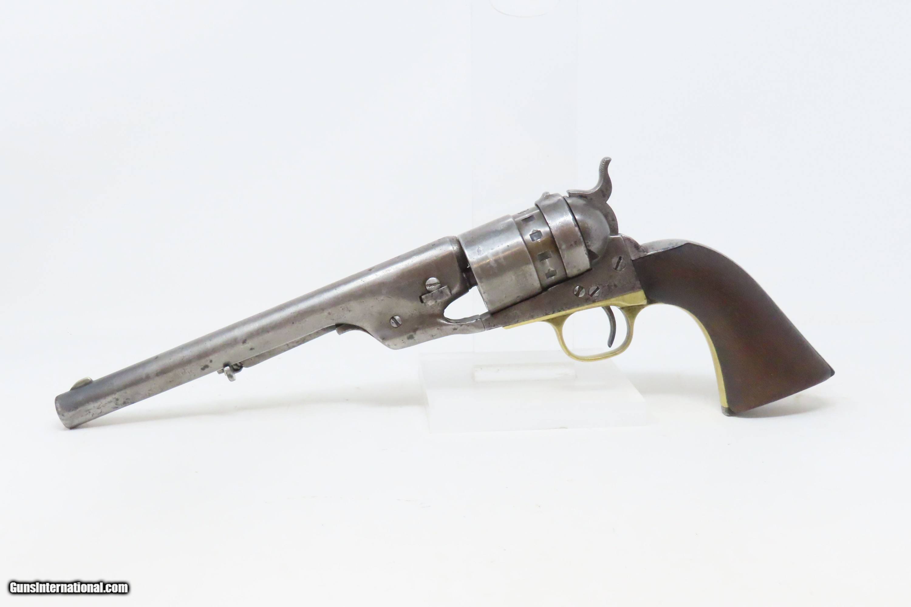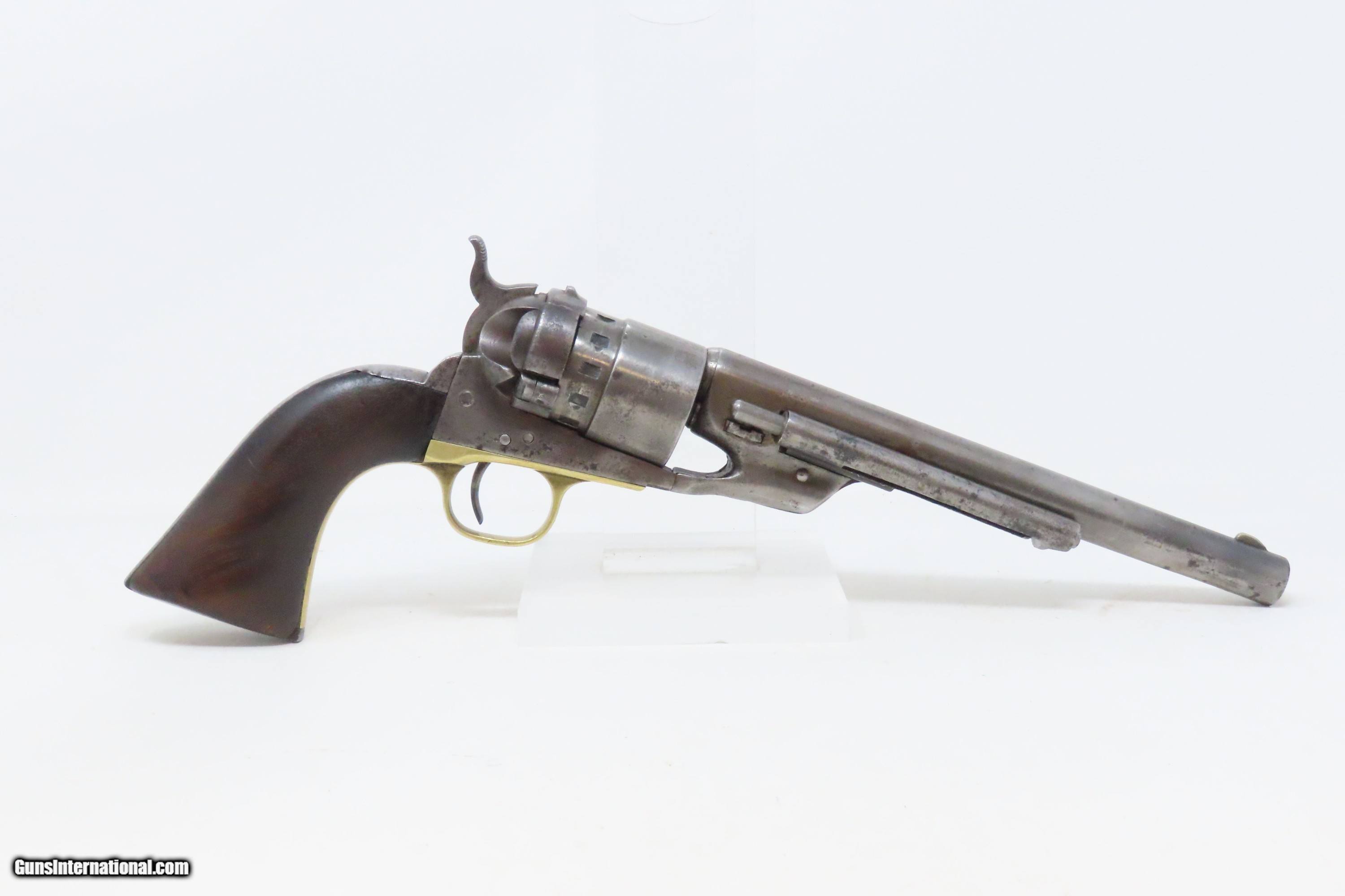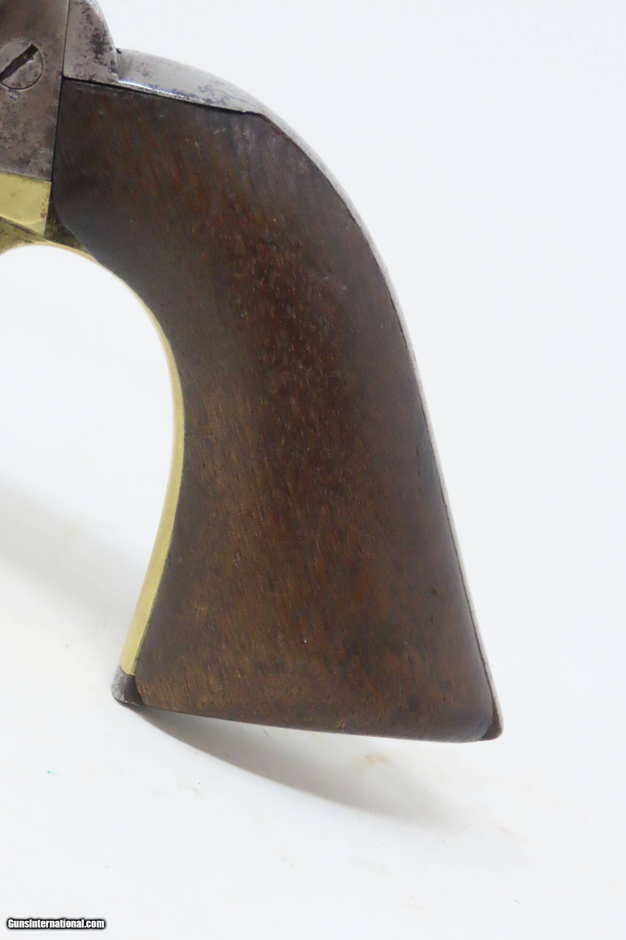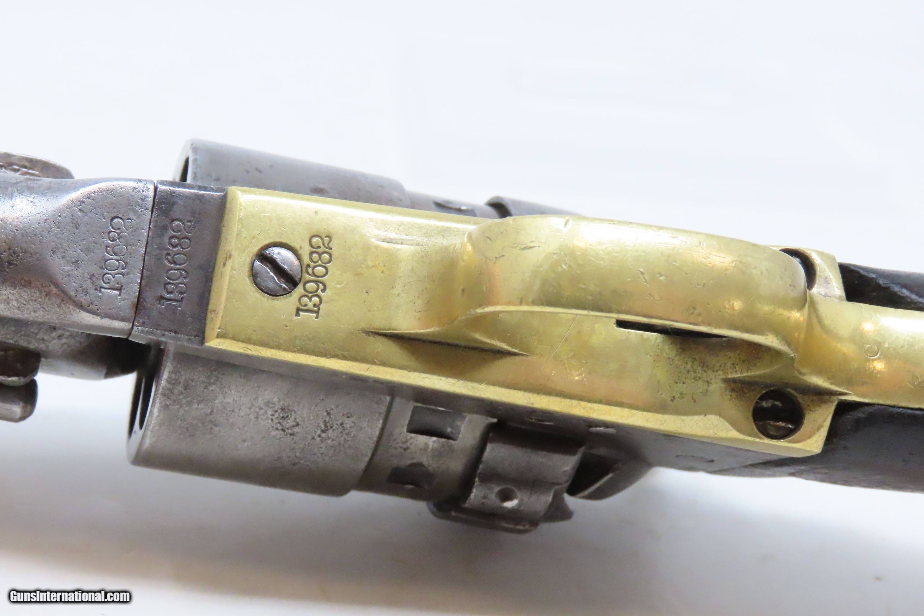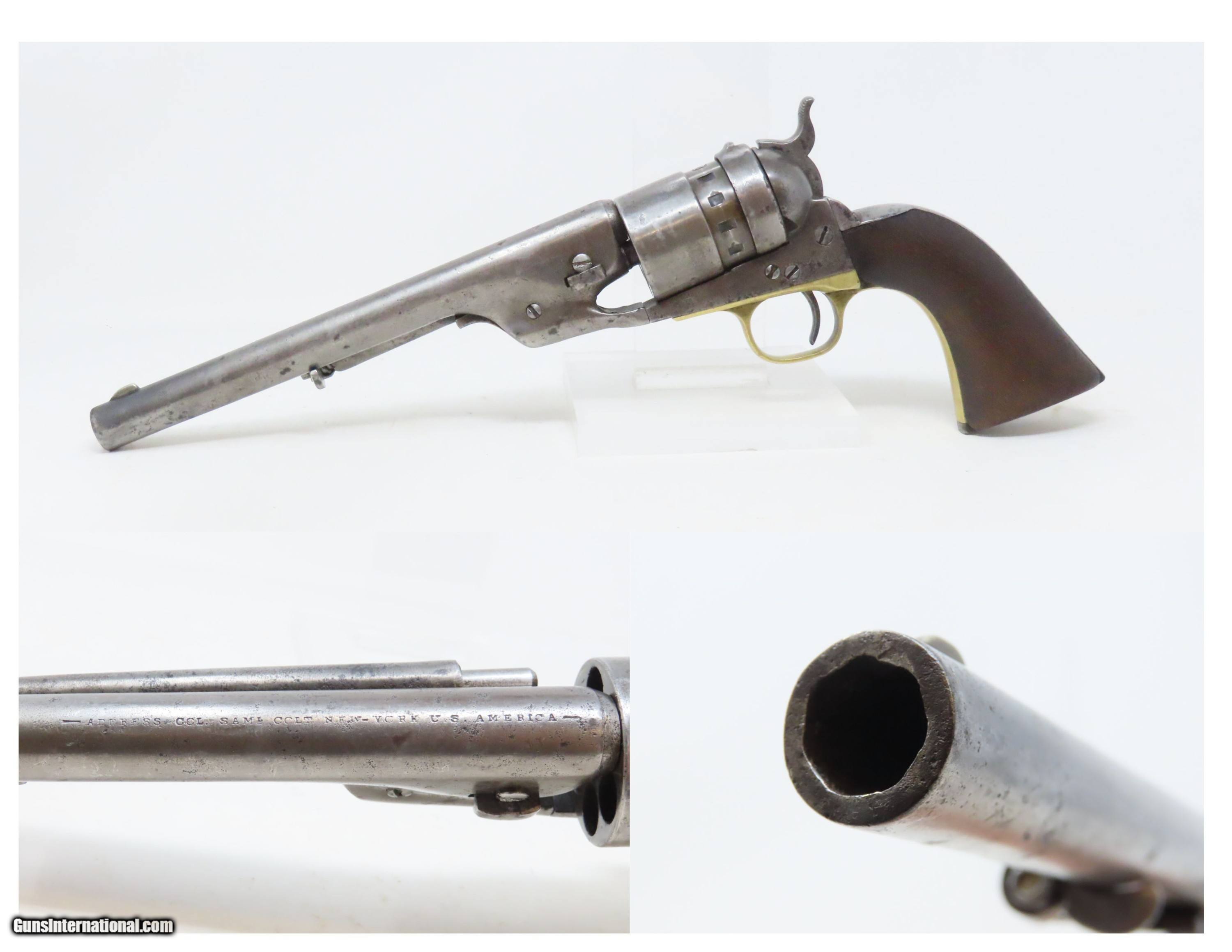 Description: RARE Antique COLT M1860 ARMY “12-Stop” RICHARDS Conversion .44 CF Revolver VERY SMALL NUMBER MADE with “12-Stop” CYLINDER Here we present an antique Period Engraved Colt Model 1860 Army Richards Conversion Revolver, manufactured in 1864 and converted sometime between 1873-78. Of the 9000 that were converted, only a very small number of the early production revolvers utilized the 12-Stop cylinders. Charles B. Richards was an engineer who worked for the Colt’s Patent Fire Arms Company and was awarded a patent for converting Colt percussion models to breech loading cartridge revolvers. After the onset of the American Civil War, Richards eventually became Superintendent of Engineering at the Colt factory in Hartford, Connecticut. Richards' first major post-Civil War design was Colt's second attempt at metallic cartridge conversion known as the "Richards Conversion". Colt's revolvers to this point had been black powder percussion pistols. However, the U.S. Army wanted a revolver that held metallic cartridges, which Colt could not produce because the Rollin White patent was still held by rival Smith & Wesson. Colt's only solution would be to bore through the rear of their cylinders and devise a new method of ignition and case extraction. The Richards Conversion was performed on this Colt 1860 Army revolver. The caliber was .44 Colt Centerfire. This conversion added a breechplate with a firing pin and a rear sight mounted on the breechplate. Colt manufactured 9,000 of these revolvers between 1873 and 1878. In 1873 Colt performed the same conversion on the Model 1851 and Model 1861 revolvers for the U.S. Navy in .38 rimfire. The Richards conversion was an instant success, all being done concurrently with the iconic Colt Single Action Army, which Richards was responsible for the development of! The 1860 Army was the single most used pistol of the American Civil War. Over 200,000 were made from 1860 to 1873, and 156,000 of those were made by the end of the war in 1865. The overall condition is good. Gray patina. The action is excellent. The bore is very good with strong rifling. The grip shows use and there is a small chip where the frame meets the left bottom corner. Numbers match except for the cylinder. Own the original! This is a legitimate antique and not a reproduction. Barrel is 8 inches. Caliber: .44 Centerfire Overall condition as seen in photos. Very Fast. Very Safe. FREE SHIPPING WORLDWIDE. Delivered directly to your door by express mail! Guaranteed AUTHENTIC & Includes CERTIFICATE OF AUTHENTICITY. ancestryguns $4000 #240009 SOLD Antique: Yes |