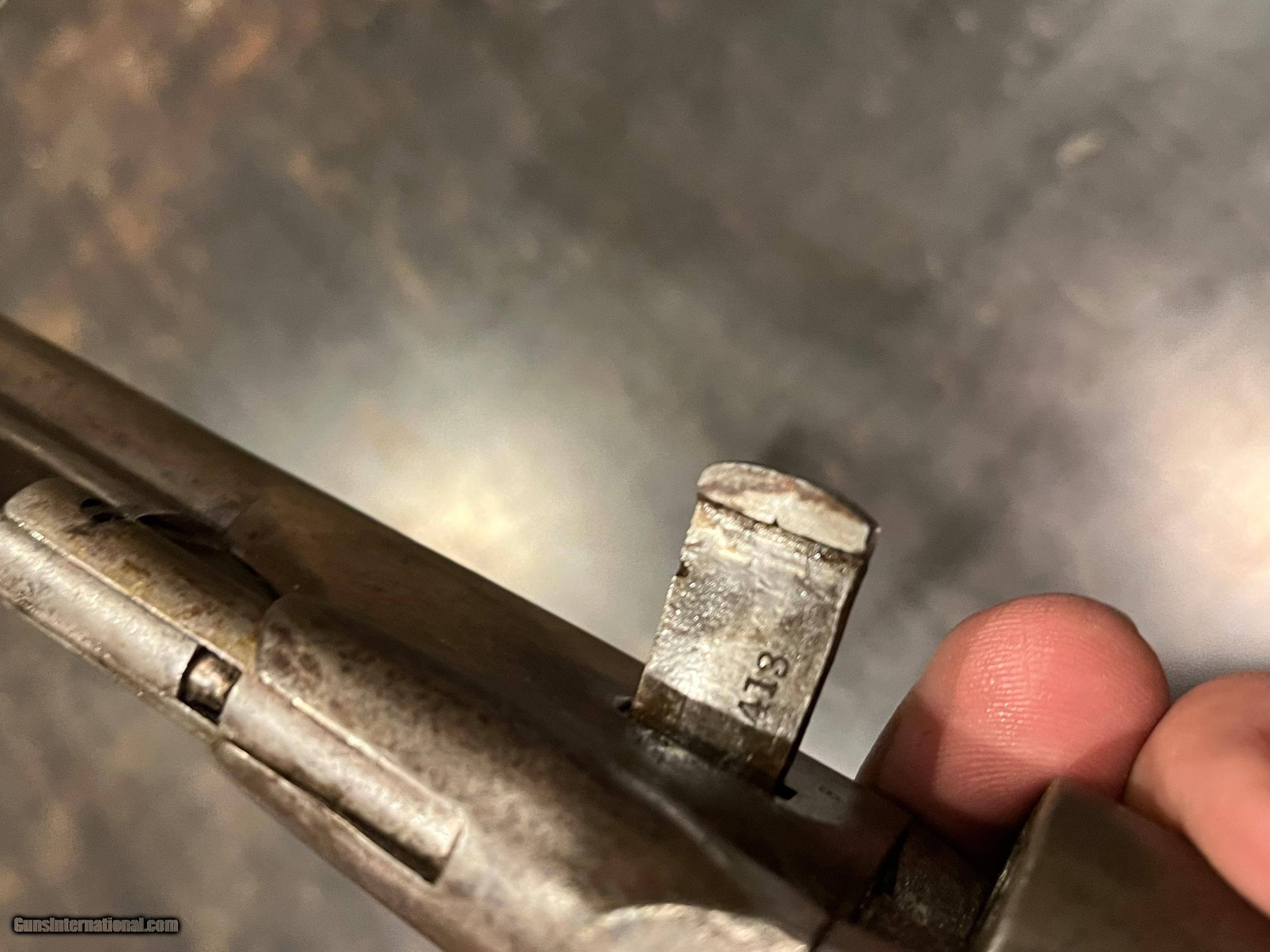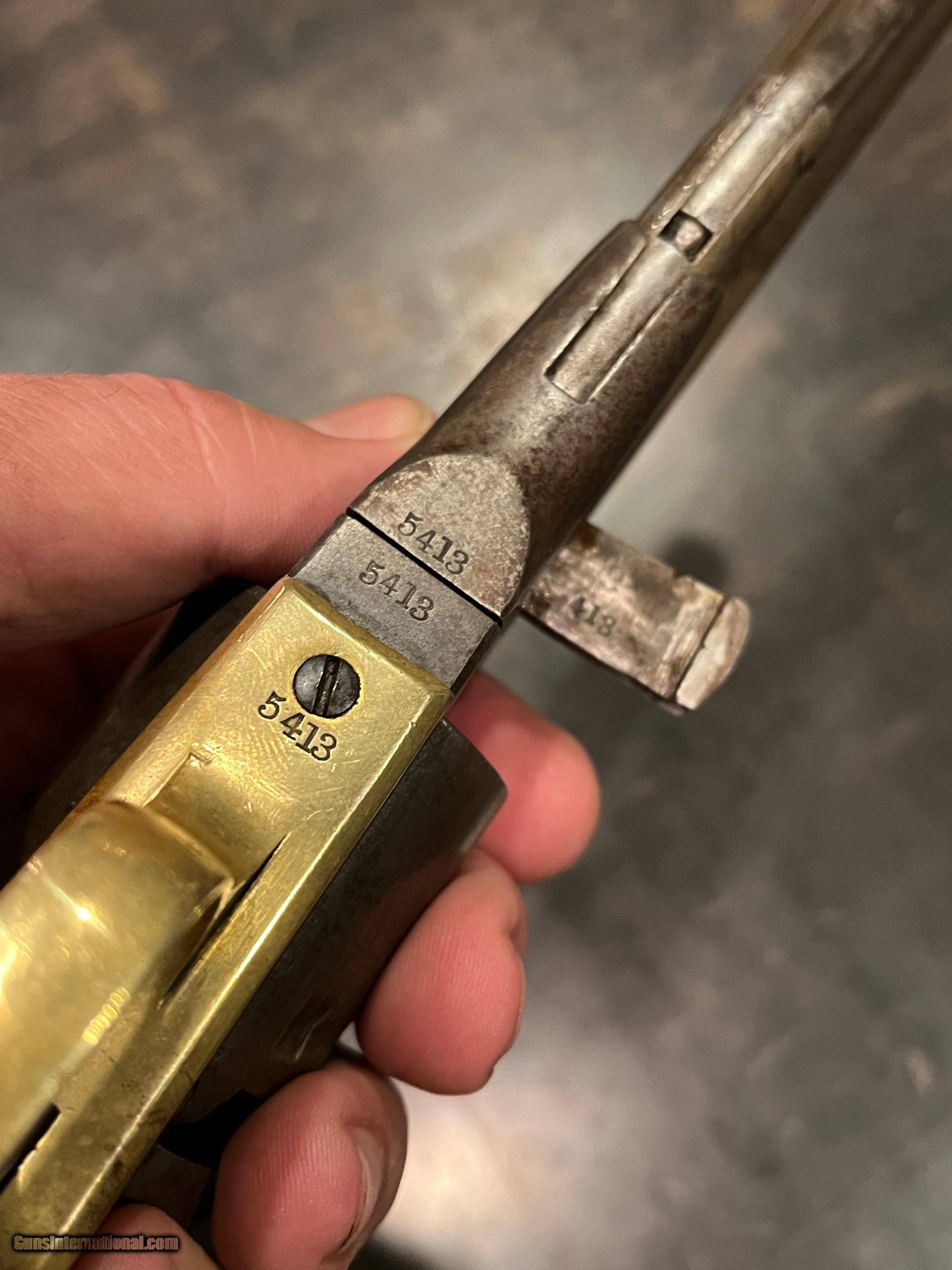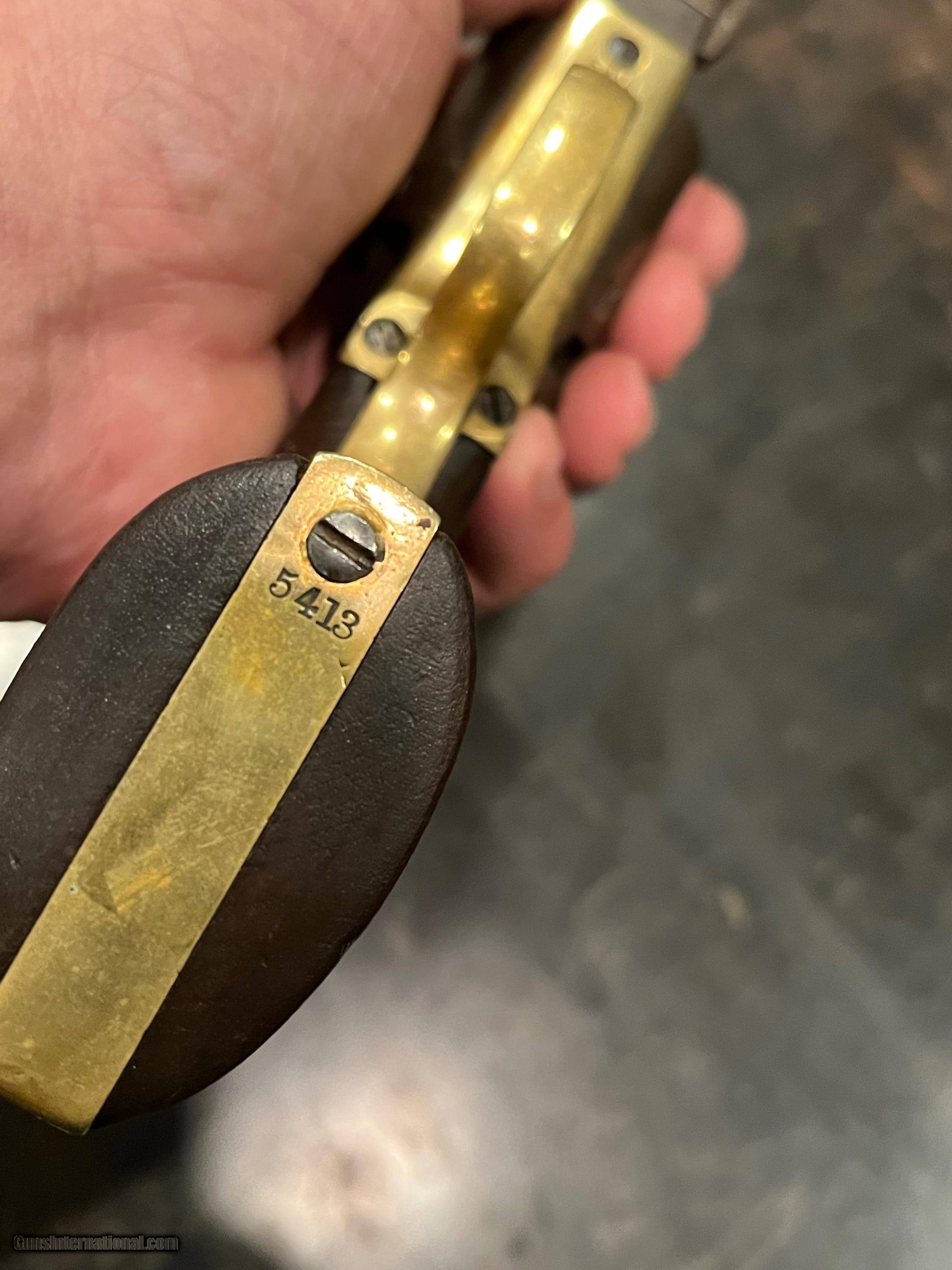 Description: Here is a nice looking all matching serial numbers even the wedge M-1861 Colt Navy Pistol serial # 5413 . Nice action. Clean bore. Nice looking overall with all mechanical SOLD Curio/Relic: Yes Antique: Yes Manufacturer: Colt Model: 1861-Navy Serial Number: 5413 |