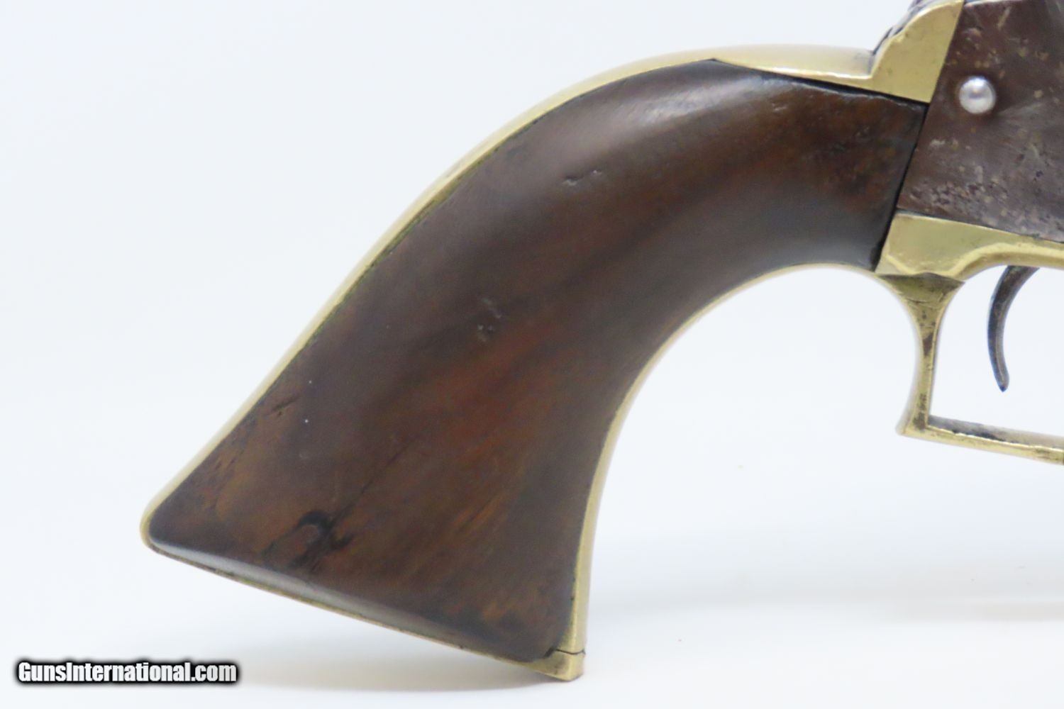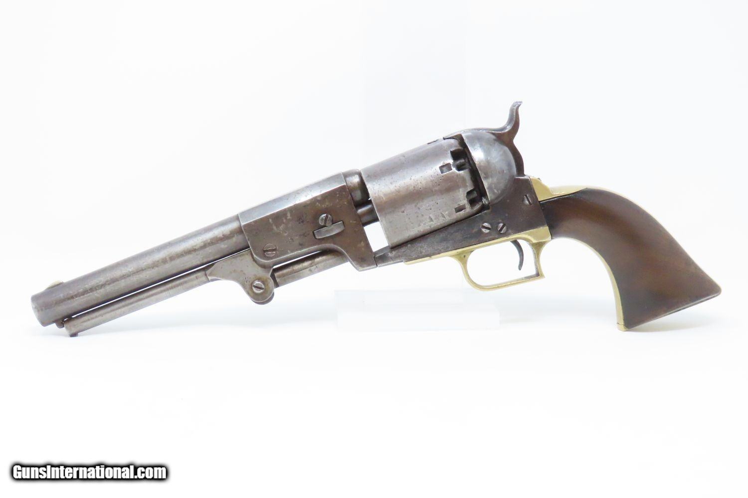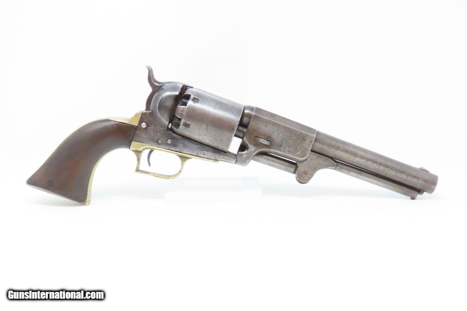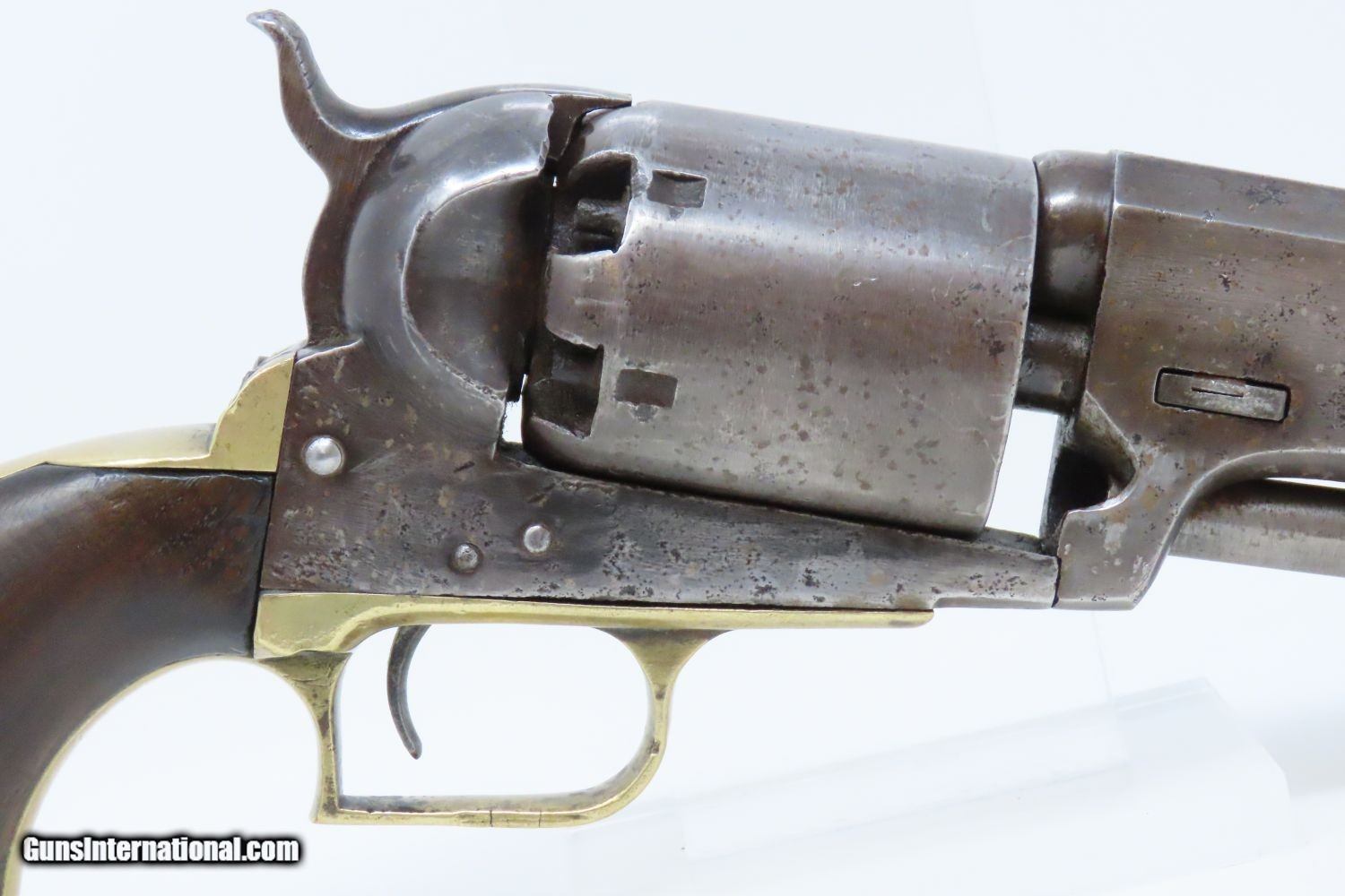 Description: RARE NEW HAMPSHIRE MILITIA COLT DRAGOON Antique 2nd Model .44 Cal. REVOLVER One of Around 300 New Hampshire Guns! Here we present an antique U.S. Issue Colt 2nd Model Dragoon Revolver, manufactured in 1851 in Hartford, Connecticut. Colt produced about 2700 2nd Dragoon Revolvers between 1850 and 1855 and sent approximately 300 of those guns to the New Hampshire and Massachusetts Militias. The left side of the barrel is marked “NEW HAMPSHIRE”. These Dragoons fell into the serial number range of 10,000 to the early 11,000s. At least part of an Army contract for 1000 revolvers dated February 4, 1850 was filled with 2nd Dragoon Revolvers. These would inevitably go on to see service during the American Civil War. The revolver has the distinctive combination of square-back, brass, trigger guard and rectangular cylinder stops found only on the 2nd Model Dragoons and has the V-shaped mainspring used to about serial number 10,000. The half round barrel is marked: “-ADDRESS SAML COLT NEW-YORK CITY-” reading from the muzzle to the breech. The left front of the frame is roll-stamped: “COLT'S/PATENT/U.S.” in three lines. The full serial number, “10124” is located on the barrel lug, cylinder arbor pin, frame, trigger guard, backstrap, cylinder and loading lever. Colt’s Dragoons experienced some of the harshest conditions the mid-19th century had to offer, and it is amazing that any survived, in any condition. This pistol was designed for use by horse-mounted rifleman, and it is so much pistol that you will want a horse to carry it for you because of its significant weight. This one would have seen use during the American Civil War. The overall condition is very good. The action (hammer/trigger) is strong and the cylinder advances appropriately, though lockup is imperfect. The bore is in good shape. The grip is firm despite the minor hairline crack on the bottom of the right side. This is a great opportunity to add one of Samuel Colt’s most recognized inventions to your collection, an extremely rare New Hampshire Militia Issued Colt 2nd Model Dragoon! Own the original! This is a legitimate antique and not a reproduction. Barrel is 7-1/2 inches. Caliber: .44 Percussion Overall condition as seen in photos. Very Fast. Very Safe. FREE SHIPPING WORLDWIDE. Delivered directly to your door by express mail! Guaranteed AUTHENTIC & Includes CERTIFICATE OF AUTHENTICITY. ancestryguns $8745 #201091 SOLD Antique: Yes |