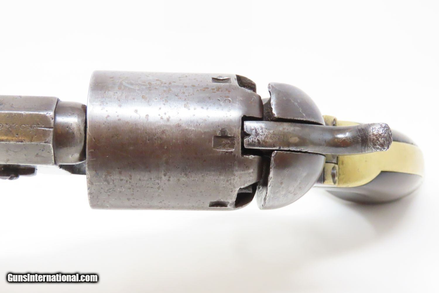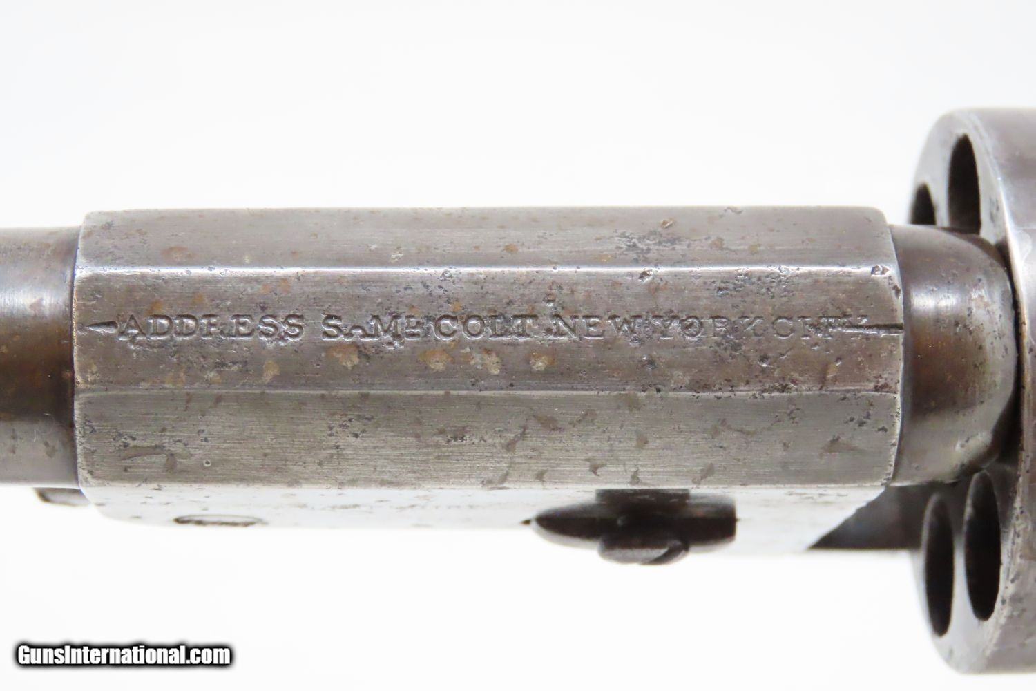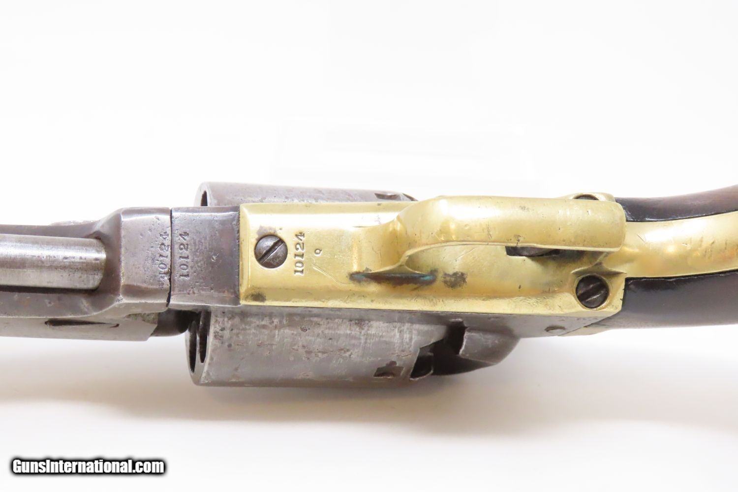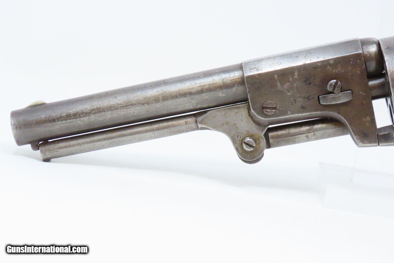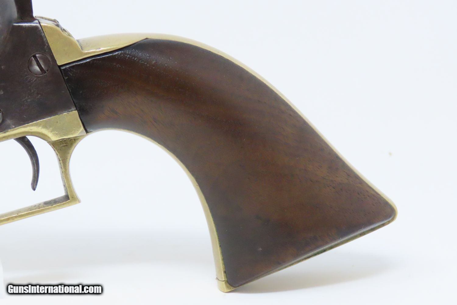 Description: RARE NEW HAMPSHIRE MILITIA COLT DRAGOON Antique 2nd Model .44 Cal. REVOLVER One of Around 300 New Hampshire Guns! Here we present an antique U.S. Issue Colt 2nd Model Dragoon Revolver, manufactured in 1851 in Hartford, Connecticut. Colt produced about 2700 2nd Dragoon Revolvers between 1850 and 1855 and sent approximately 300 of those guns to the New Hampshire and Massachusetts Militias. The left side of the barrel is marked “NEW HAMPSHIRE”. These Dragoons fell into the serial number range of 10,000 to the early 11,000s. At least part of an Army contract for 1000 revolvers dated February 4, 1850 was filled with 2nd Dragoon Revolvers. These would inevitably go on to see service during the American Civil War. The revolver has the distinctive combination of square-back, brass, trigger guard and rectangular cylinder stops found only on the 2nd Model Dragoons and has the V-shaped mainspring used to about serial number 10,000. The half round barrel is marked: “-ADDRESS SAML COLT NEW-YORK CITY-” reading from the muzzle to the breech. The left front of the frame is roll-stamped: “COLT'S/PATENT/U.S.” in three lines. The full serial number, “10124” is located on the barrel lug, cylinder arbor pin, frame, trigger guard, backstrap, cylinder and loading lever. Colt’s Dragoons experienced some of the harshest conditions the mid-19th century had to offer, and it is amazing that any survived, in any condition. This pistol was designed for use by horse-mounted rifleman, and it is so much pistol that you will want a horse to carry it for you because of its significant weight. This one would have seen use during the American Civil War. The overall condition is very good. The action (hammer/trigger) is strong and the cylinder advances appropriately, though lockup is imperfect. The bore is in good shape. The grip is firm despite the minor hairline crack on the bottom of the right side. This is a great opportunity to add one of Samuel Colt’s most recognized inventions to your collection, an extremely rare New Hampshire Militia Issued Colt 2nd Model Dragoon! Own the original! This is a legitimate antique and not a reproduction. Barrel is 7-1/2 inches. Caliber: .44 Percussion Overall condition as seen in photos. Very Fast. Very Safe. FREE SHIPPING WORLDWIDE. Delivered directly to your door by express mail! Guaranteed AUTHENTIC & Includes CERTIFICATE OF AUTHENTICITY. ancestryguns $8745 #201091 SOLD Antique: Yes |