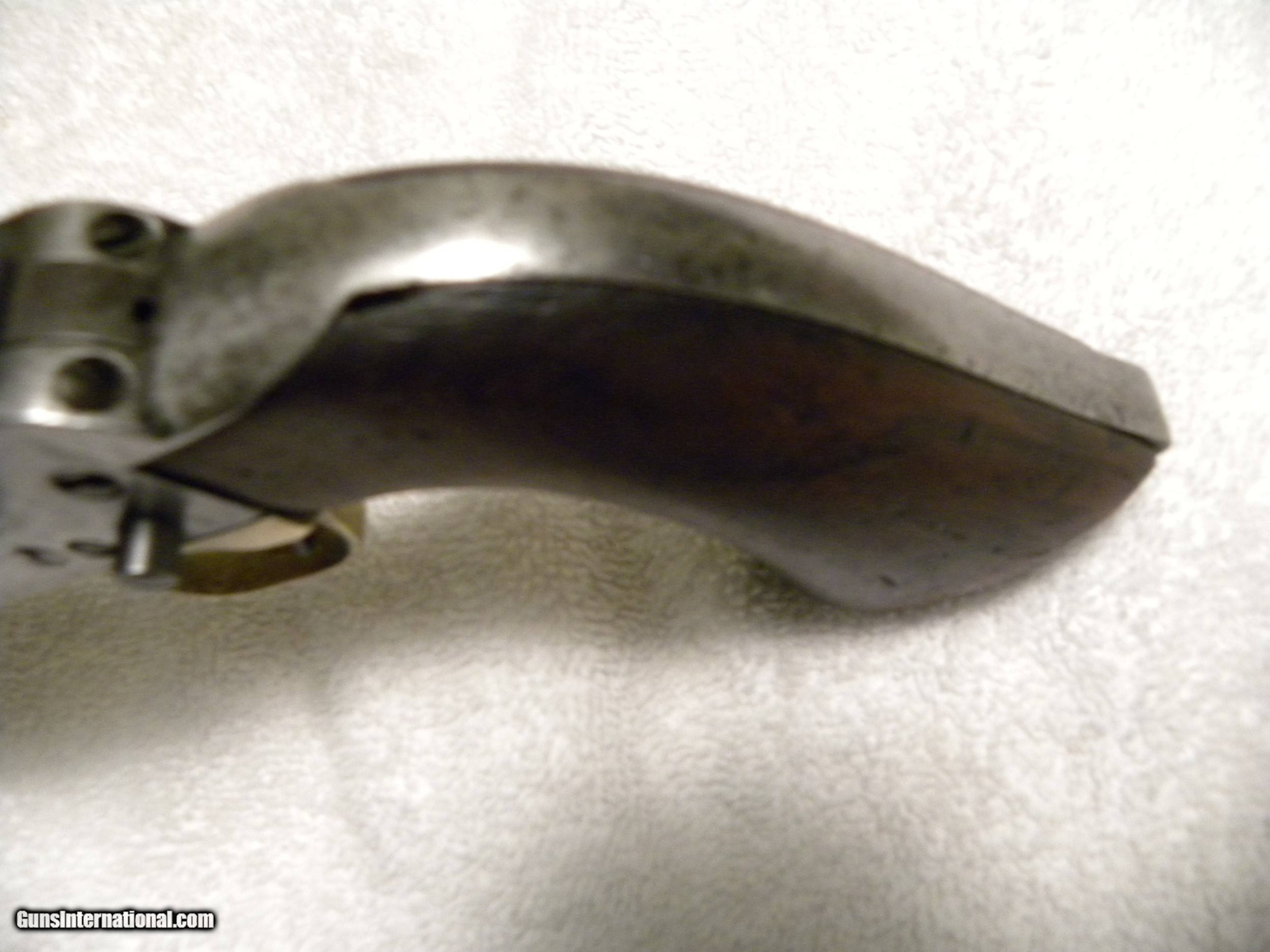 Description: Colt model 1860 New Army 44 cal revolver. Very good package. All numbers match, Made first year 1861, and has elongated screw lugs for shoulder stock. Brass strap just behind the trigger has S stamped also another small stamp. Right grip has chip on top edge at butt strap. Bore has good grooves but has some pitting. (Please see all photos) Good strong spring and hand. Hammer and trigger action smooth and strong. Cylinder turns as it should and stops in the right spot, No sloppyness in cylinder. Hammer strong and firm at both half cock and full cock. Her nipples are not mangeled. Tamping lever works smoothly and locks back in place tightly. Best I could find this was shipped July or August of 1861 to Capt. R Whiteley at Gov. Island, NY. SOLD Antique: Yes Manufacturer: Colt Model: 1860 Serial Number: 8037 Caliber Info: 44 Condition: Fair to good |