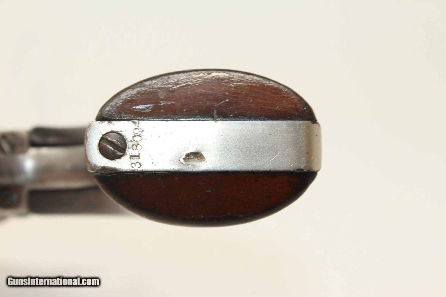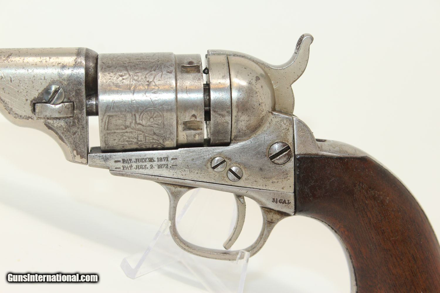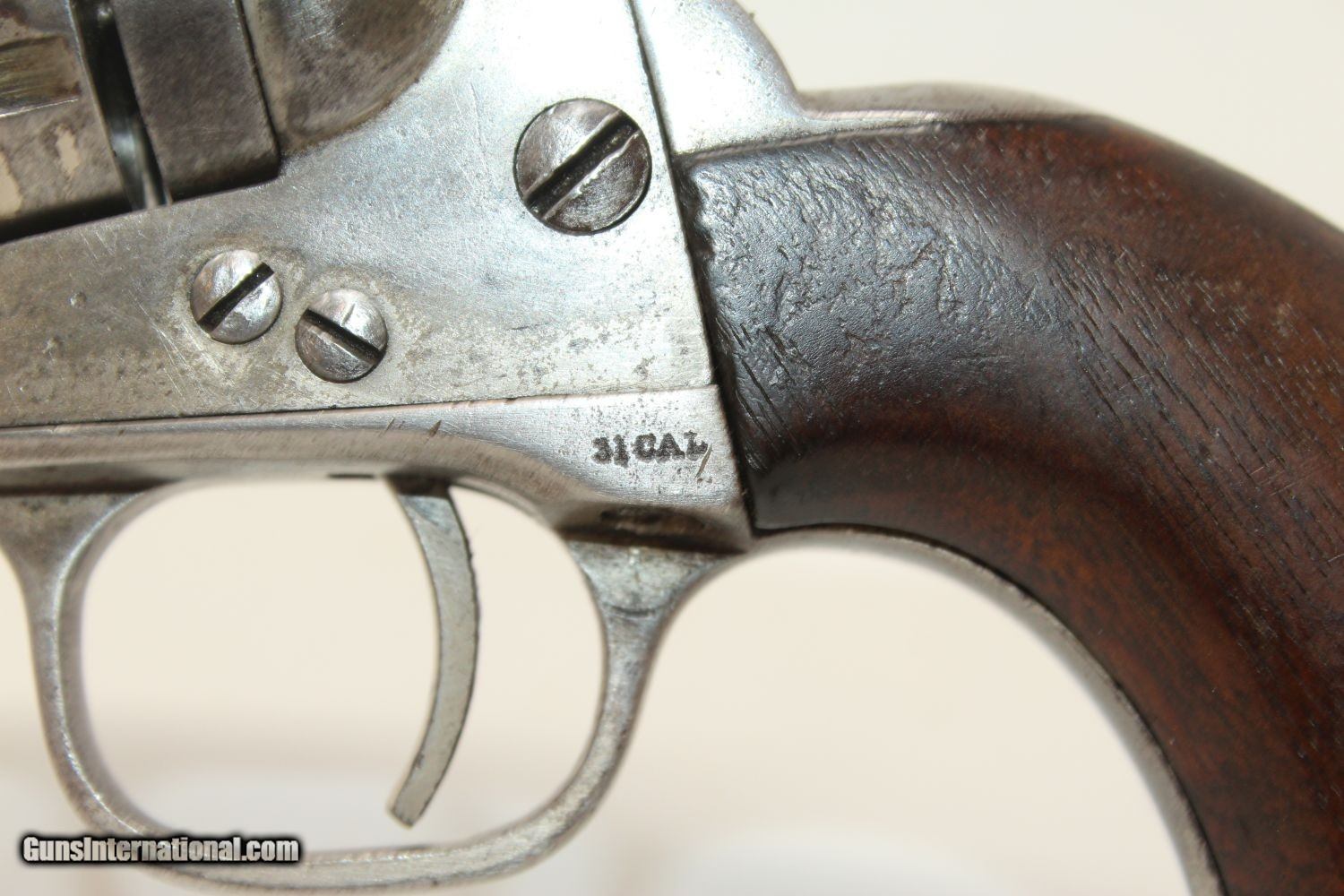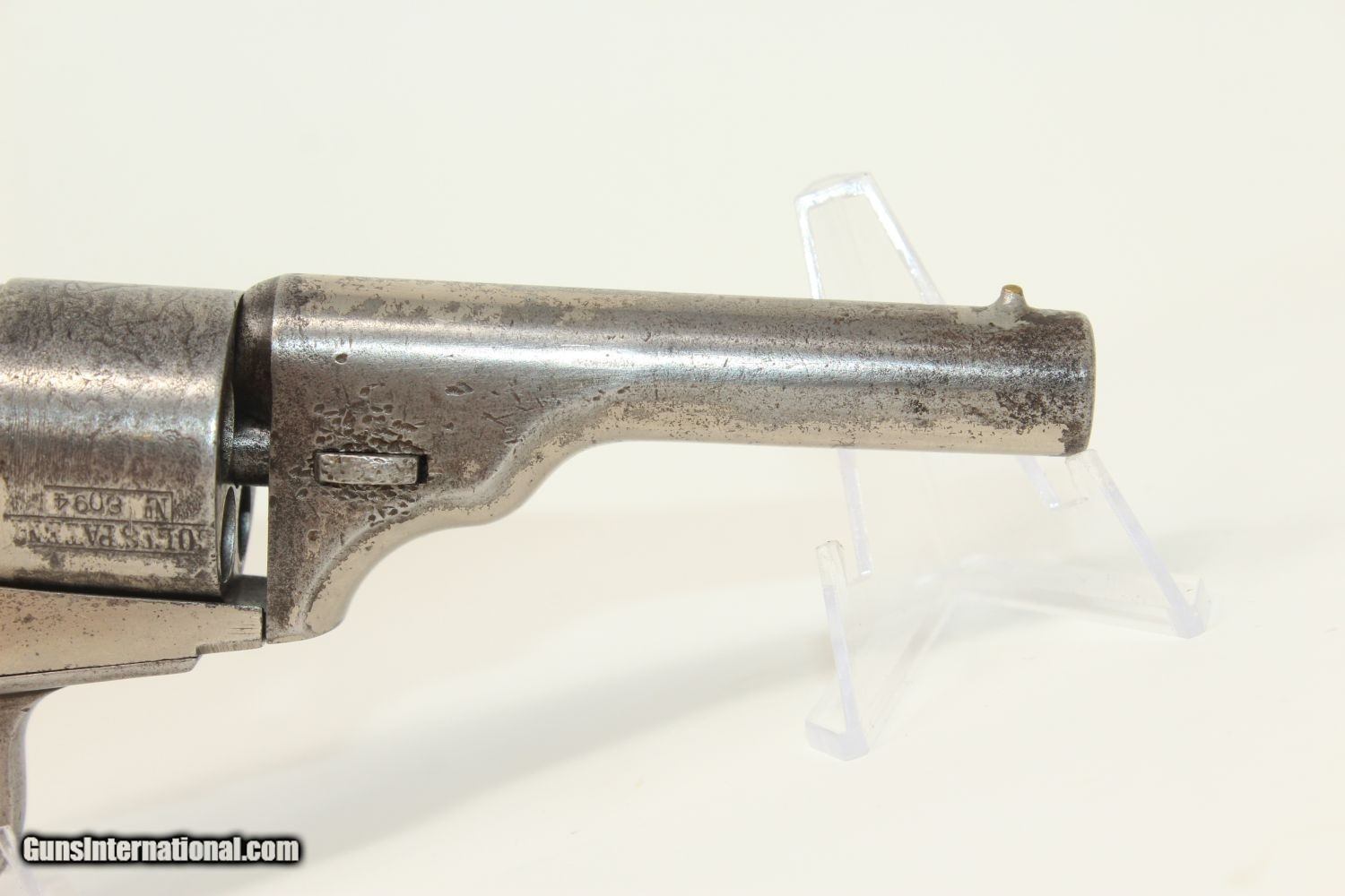 Description: TRANSITIONAL Cartridge Open Top Revolver by COLT 1 of 6500; Nice Round Barrel Pocket Model! Here we present an antique Colt Pocket Model Cartridge Revolver in .38 Colt, made circa 1869 in Hartford, Connecticut. This revolver was originally an 1849 Pocket Model with the frame manufactured in 1869 in .31 caliber. This was a transitional time for firearms development as the Smith & Wesson held Rollin White patent had expired in 1869 and other makers were desperate to get their own versions to market. This was one of Colt’s first and would be a predecessor to the Colt Single Action Army. 6,500 of those were manufactured using converted percussion revolver parts. It still sports the classic cylinder scene of the 1849 Pockets: a stagecoach robbery holdup! This was a great marketing technique as well as a means by which Colt stymied counterfeits. The overall condition is very good. 70% of the nickel finish remains. The markings are clear. The numbers match. The walnut grip is in good condition. The bore is very good with sharp rifling. The action is excellent. Own the original! This is a legitimate antique and not a reproduction. Barrel is 3-½ inches. Caliber: .38 Colt (Centerfire) Overall condition as seen in photos. Very Fast. Very Safe. FREE SHIPPING WORLDWIDE. Delivered directly to your door by express mail! Guaranteed AUTHENTIC & Includes CERTIFICATE OF AUTHENTICITY. ancestryguns $1650 #190755 SOLD Antique: Yes |