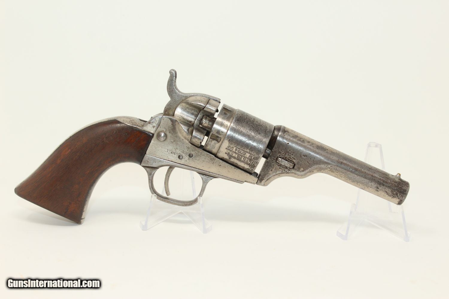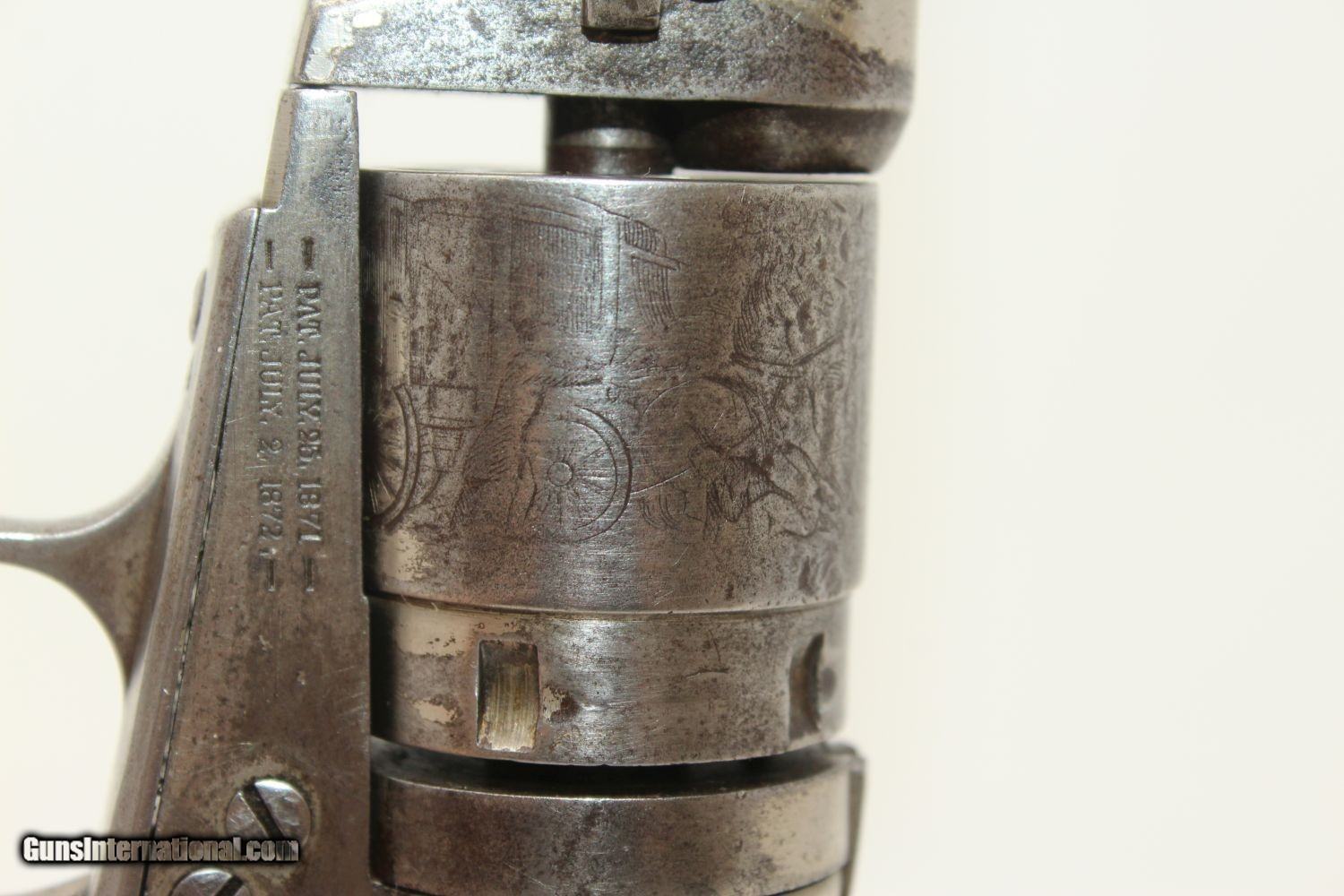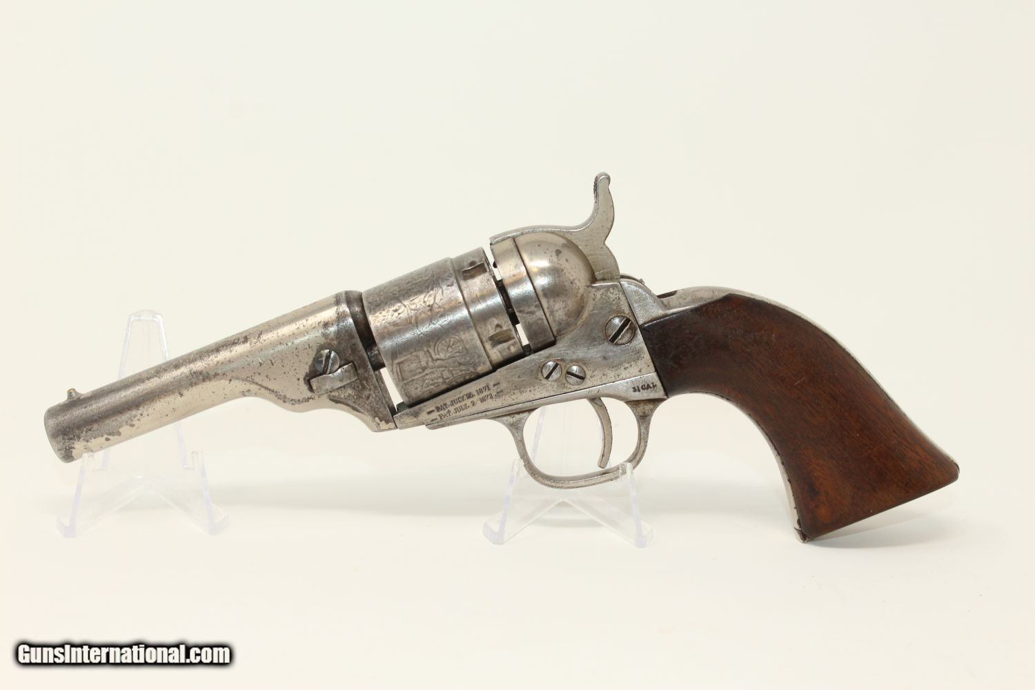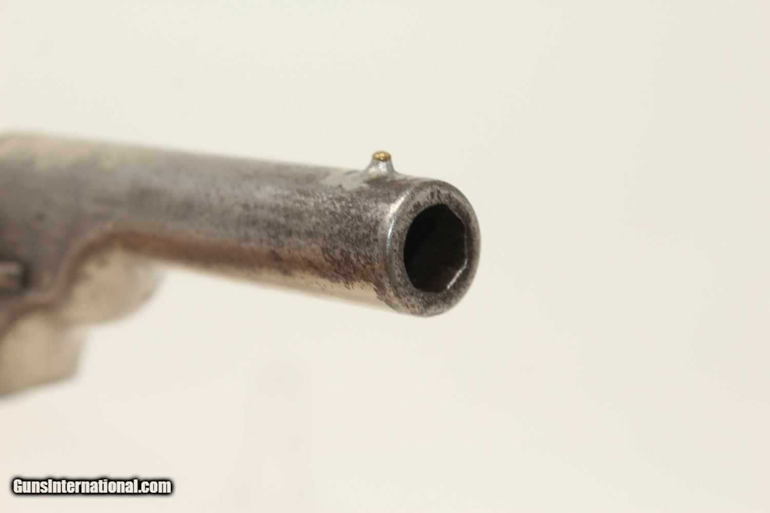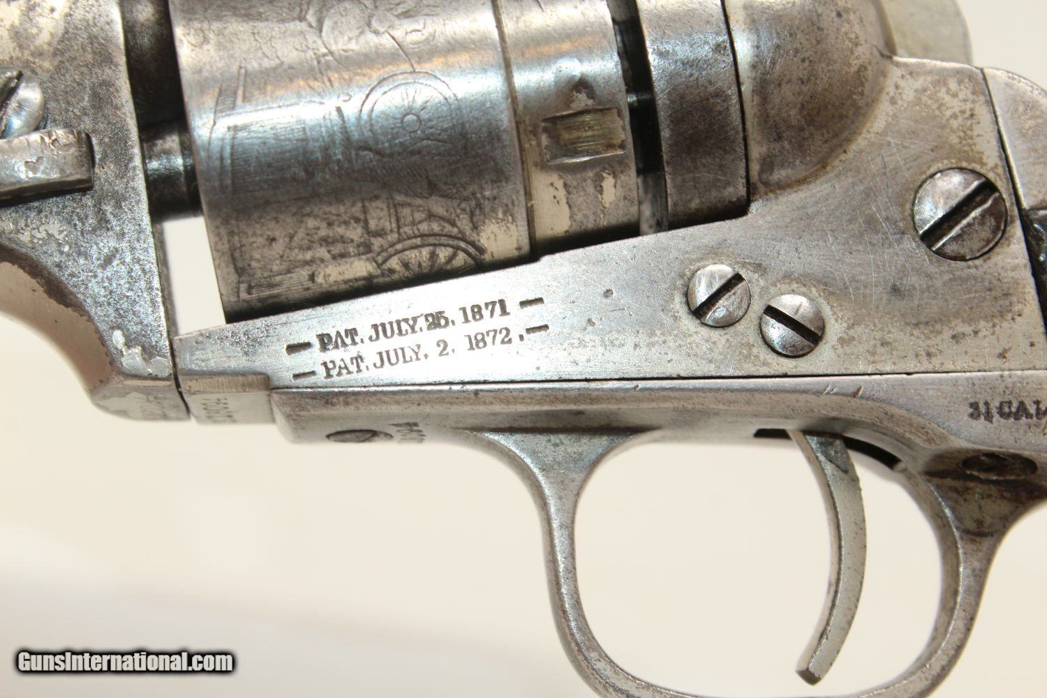 Description: TRANSITIONAL Cartridge Open Top Revolver by COLT 1 of 6500; Nice Round Barrel Pocket Model! Here we present an antique Colt Pocket Model Cartridge Revolver in .38 Colt, made circa 1869 in Hartford, Connecticut. This revolver was originally an 1849 Pocket Model with the frame manufactured in 1869 in .31 caliber. This was a transitional time for firearms development as the Smith & Wesson held Rollin White patent had expired in 1869 and other makers were desperate to get their own versions to market. This was one of Colt’s first and would be a predecessor to the Colt Single Action Army. 6,500 of those were manufactured using converted percussion revolver parts. It still sports the classic cylinder scene of the 1849 Pockets: a stagecoach robbery holdup! This was a great marketing technique as well as a means by which Colt stymied counterfeits. The overall condition is very good. 70% of the nickel finish remains. The markings are clear. The numbers match. The walnut grip is in good condition. The bore is very good with sharp rifling. The action is excellent. Own the original! This is a legitimate antique and not a reproduction. Barrel is 3-½ inches. Caliber: .38 Colt (Centerfire) Overall condition as seen in photos. Very Fast. Very Safe. FREE SHIPPING WORLDWIDE. Delivered directly to your door by express mail! Guaranteed AUTHENTIC & Includes CERTIFICATE OF AUTHENTICITY. ancestryguns $1650 #190755 SOLD Antique: Yes |