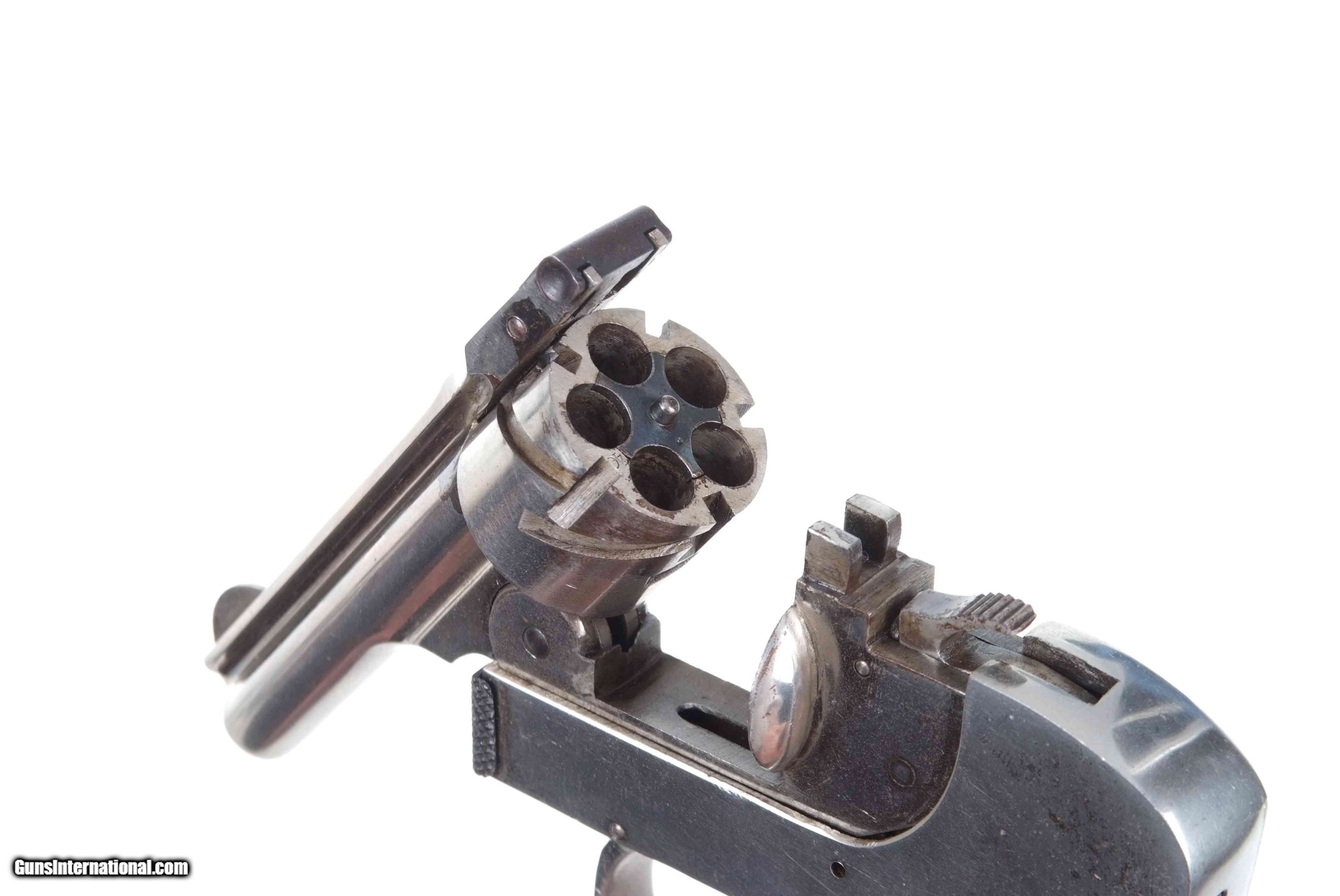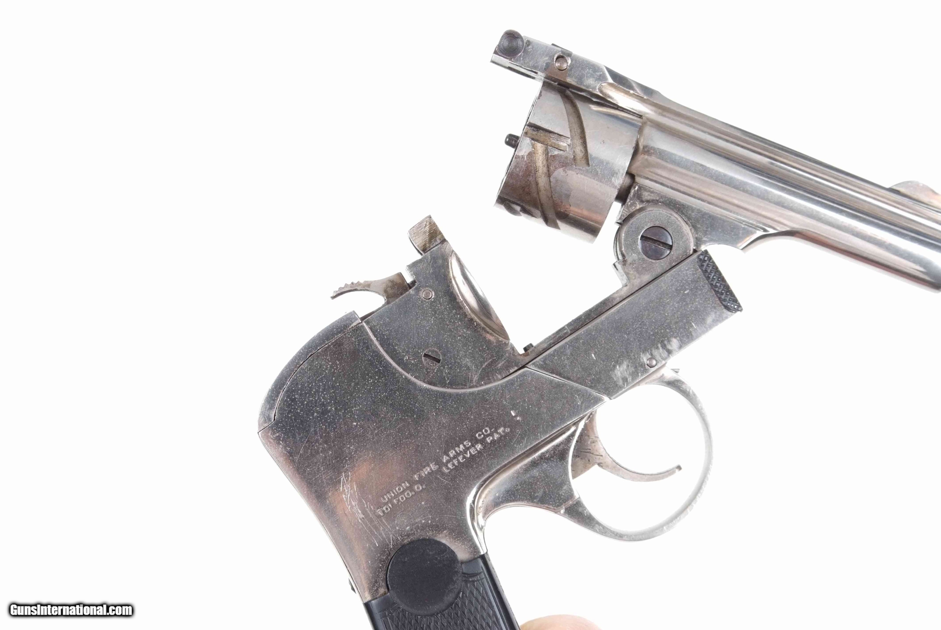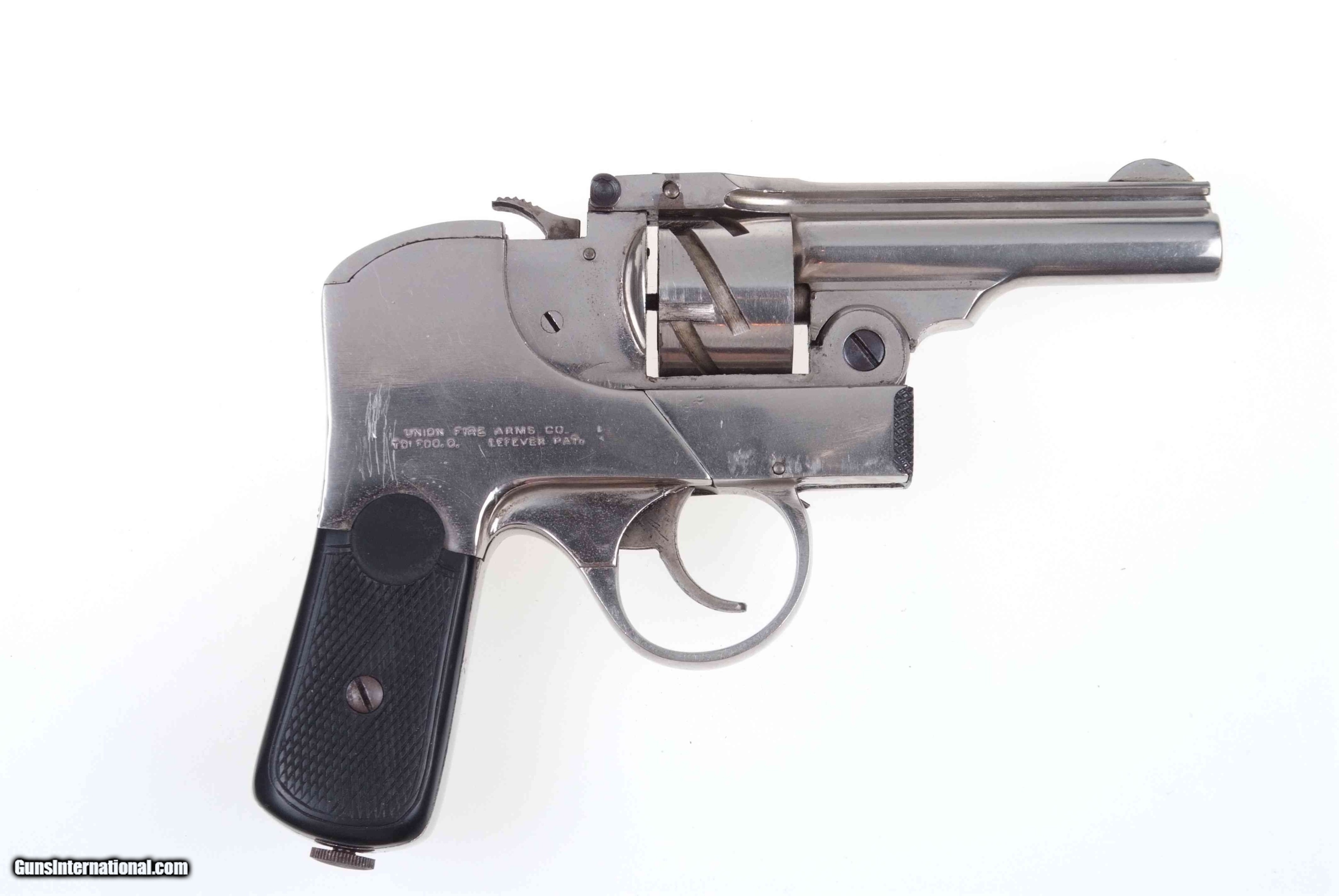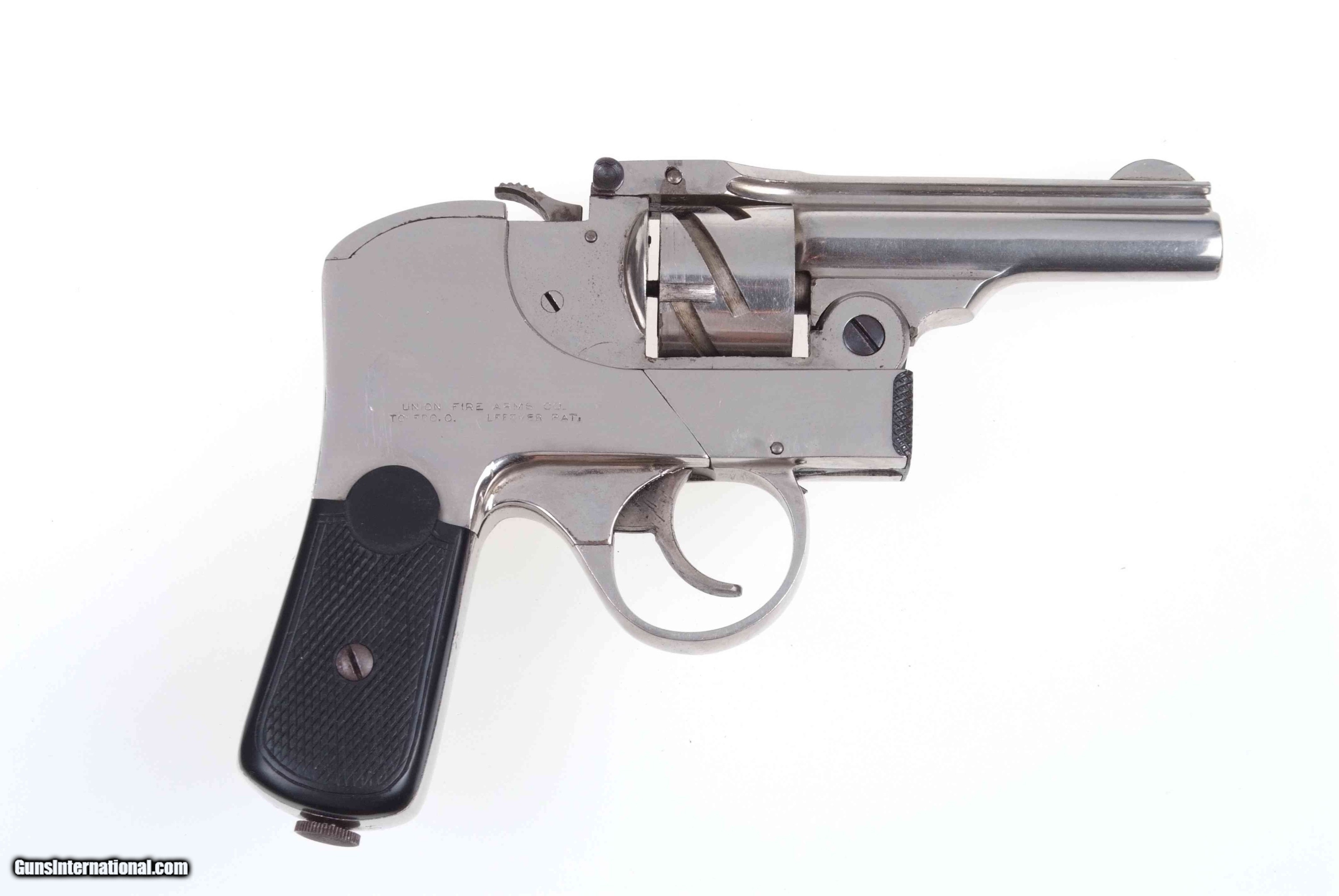 Description: Excellent, all original, Union Fire Arms semi-automatic revolver in .32 S&W, made in Toledo, Ohio, production fewer than 300 units, this one SN: 40. Standard configuration revolver with 2 7/8" barrel, fixed front and rear sights. Top break, SA/DA action. Zig-zag cylinder that can be functioned/rotated by moving top assembly rearward with hammer cocked. Right side of frame marked with manufacturer, location, and "Lefever Pat.". Serial number on base. Factory nickel with small parts fire blued, color case hardened hammer and trigger. Black checkered HR grips. Synopsis: Union Fire Arms Co., Union Semi-Automatic Revolver, .32 S&W, Nickeled. Condition: Excellent, with spots of flaking and a few superficial scratches as photographed. Most noticeable areas of flaking on left side of barrel at the rear, a single patch on cylinder, and a few spots of disturbance around right side of latch pin. Minimal use as reflected by very light case imprint on recoil shield. Mirror bore. Perfect manual mechanics. A super rare revolver, one of very few made to function as a semi-automatic (Webley Fosbery, Zulaica, Mateba 6-Unica). This is one of the best Union semi-automatic revolvers you are likely to encounter. ~~Insured shipping fee of $155; most packages shipped using FedEx 2nd Day.~~ SOLD Antique: Yes Manufacturer: Union Fire Arms Co. Serial Number: 40 Caliber Info: .32 S&W |