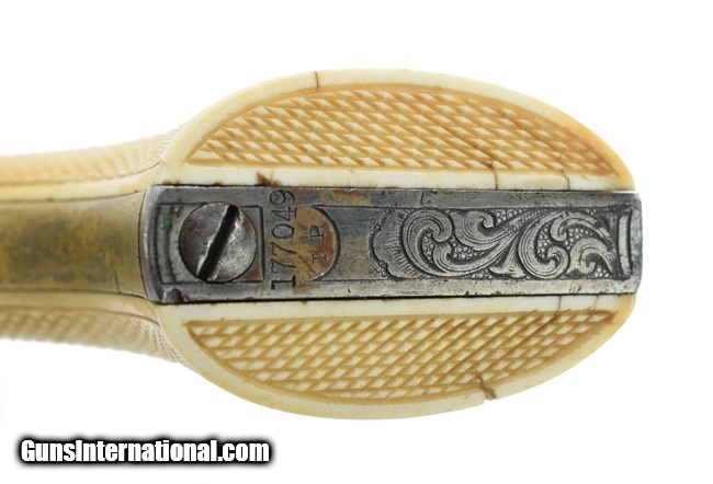 Description: Very Fine Colt 1860 New York Engraved .44 caliber revolver. Made in 1869. Very fine New York Engraved Colt 1860 Army civilian. This gun was originally silver plated with gold lever. The silver is on protected areas. The gold is mostly just on the lever. The engraving is nice and sharp. Very well done. Cylinder scene is excellent. The cylinder still has most of the cylinder pin’s intact. Grips are original checkered ivories that fit like a glove. Very fine Colt 1860 Army! SOLD Antique: Yes |