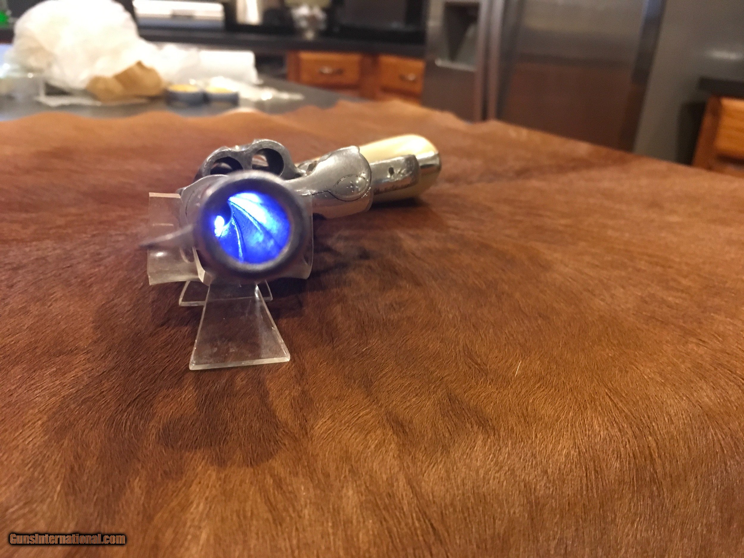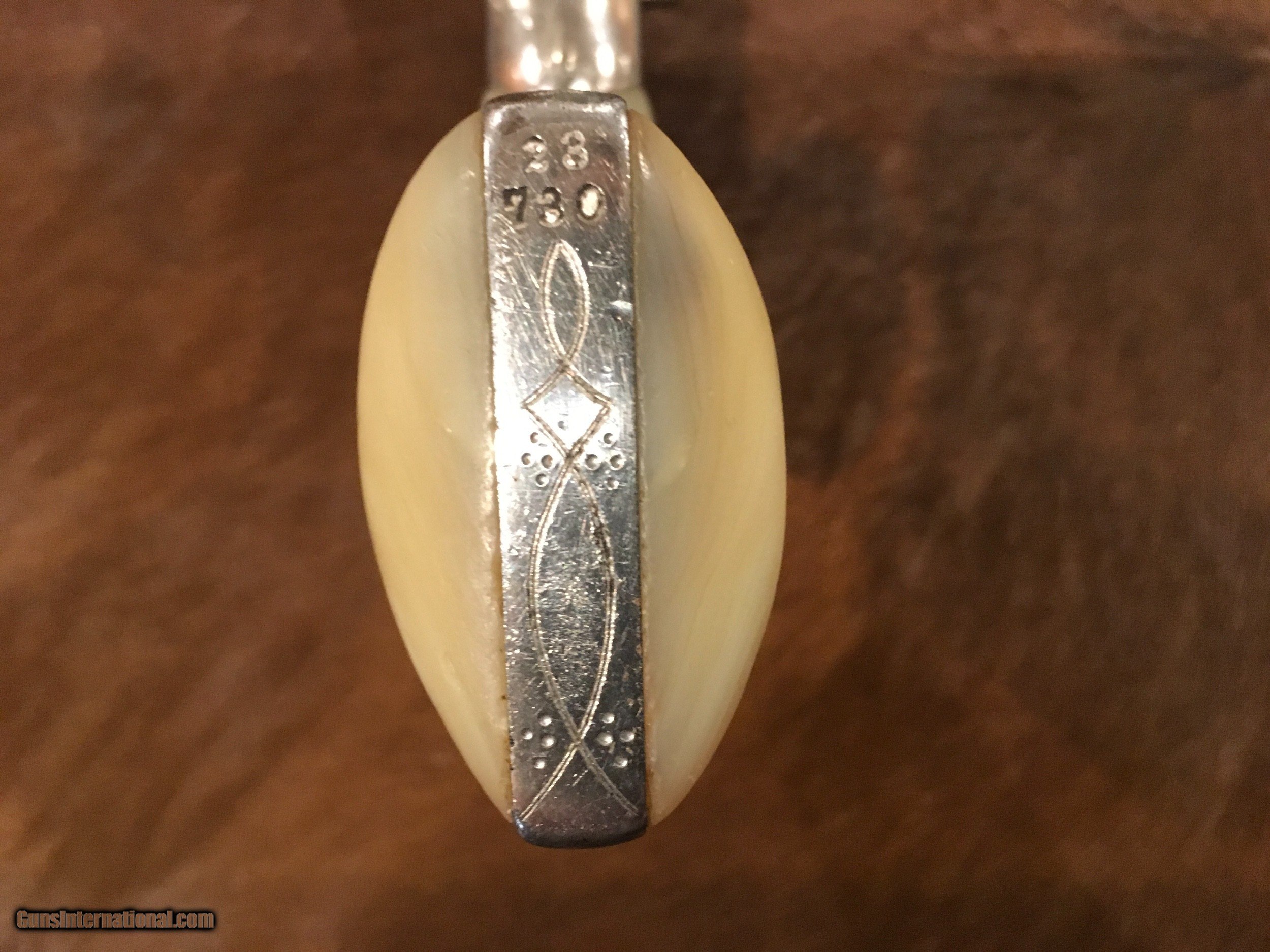 Description: According to the Colt Book Of Engraving by R.L. Wilson, this is one of only 80 factory engraved guns produced in this model. Serial number 23730 is confirmed by the accompanying factory letter as a .38/c, with a 4 1/2” barrel, nickel finish, pearl stocks factory engraved and shipped to Simmons Hardware in St. Louis, MO on January 21, 1893 in a shipment of 2 guns. The engraving is the work of Cuno Helfricht, who was the master engraver at the Colt factory during this period. The factory applied markings are all clear and strong. The cylinder has dings on the edges of some of the flutes. The action is perfect and the bore is very good. The hammer, trigger and most of the screws have bright fire blue on them. The pearl grips fit very well and are not missing any corners. I’ve only seen a couple of factory engraved Colt 1889 Models for sale over many years. Three day inspection privilege with a full refund if returned in same condition, unfired and undamaged. Buyer pays return shipping costs. More photos can be provided upon request. Please email or call with any questions.Free, Insured Shipping direct to your door where allowed by law in the contiguous US states. SOLD Antique: Yes |