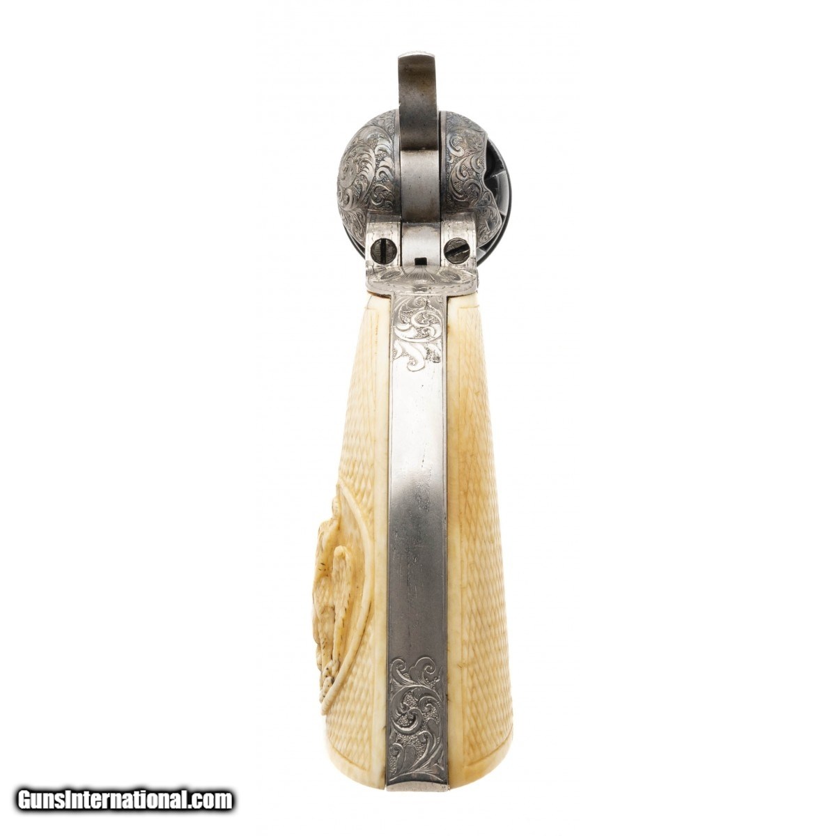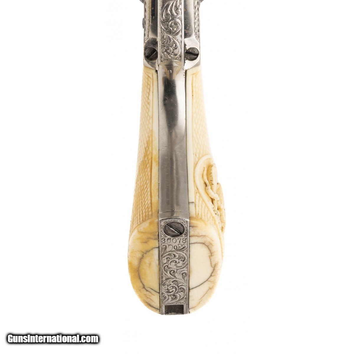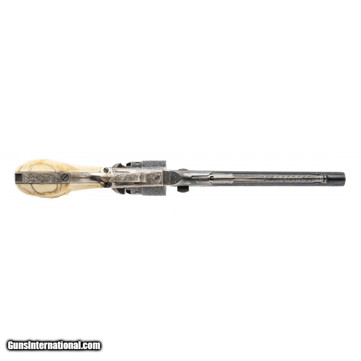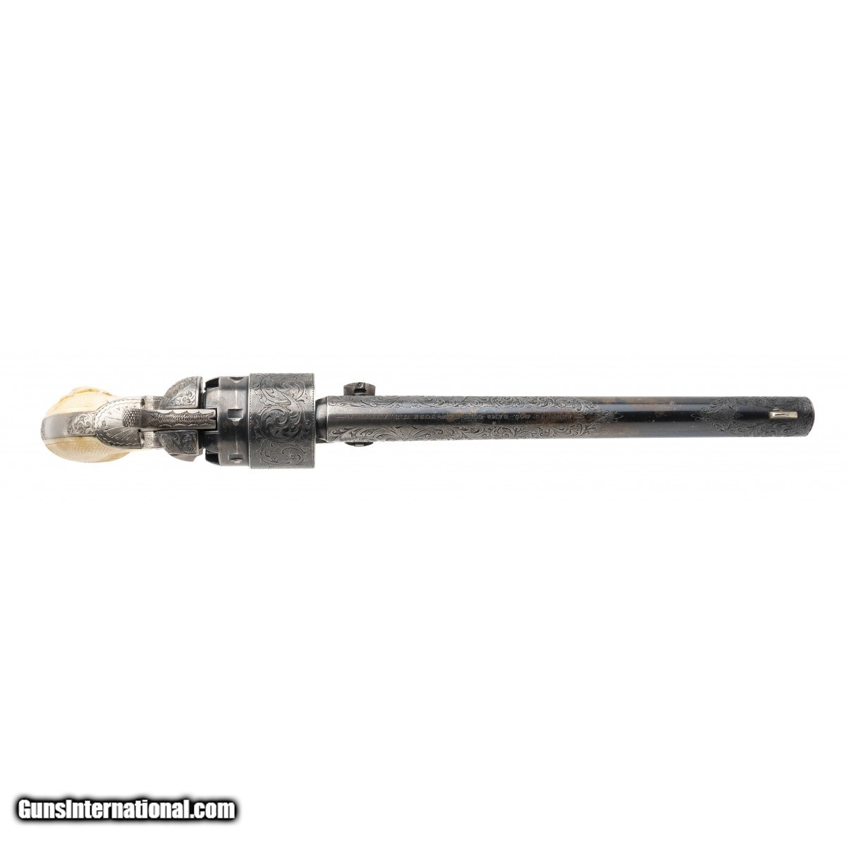 Description: "Serial number 36078. Made in 1862. 44 caliber with an 8" barrel. This gun is in very fine condition with 65% of the period blue on the barrel. The frame is incredible sharp and only shows traces of case colors. The cylinder is very fine and also engraved. The engraving appears to be from a New York shop. The gun was subsequently finished. This gun has beautifully checkered ivory grips with the Mexican eagle on the left hand side. This gun comes with a factory letter. This gun as shipped to Emerson Gaylord who purchased the leather goods operation from Ames and went on to be a giant Government contractor for leather goods among other things. Very fine Identified Engraved Colt 1860 Army! SOLD Antique: Yes |