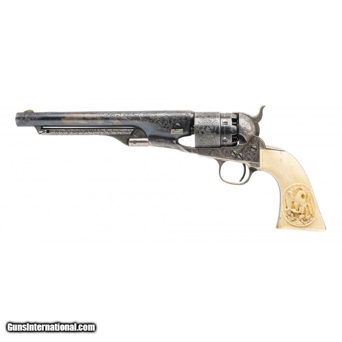 Description: "Serial number 36078. Made in 1862. 44 caliber with an 8" barrel. This gun is in very fine condition with 65% of the period blue on the barrel. The frame is incredible sharp and only shows traces of case colors. The cylinder is very fine and also engraved. The engraving appears to be from a New York shop. The gun was subsequently finished. This gun has beautifully checkered ivory grips with the Mexican eagle on the left hand side. This gun comes with a factory letter. This gun as shipped to Emerson Gaylord who purchased the leather goods operation from Ames and went on to be a giant Government contractor for leather goods among other things. Very fine Identified Engraved Colt 1860 Army! SOLD Antique: Yes |