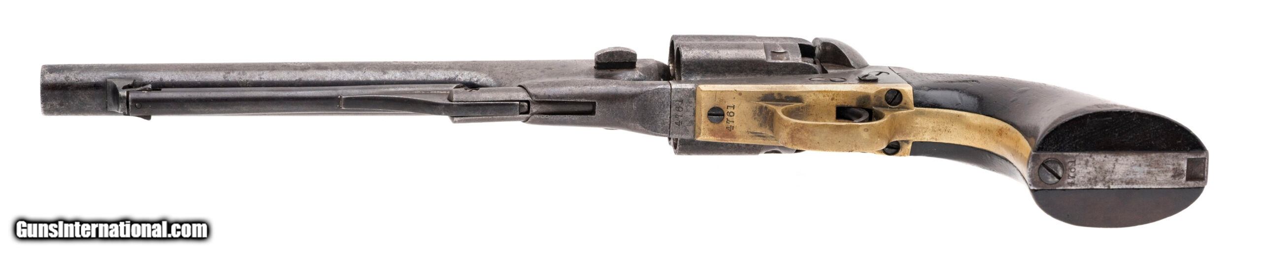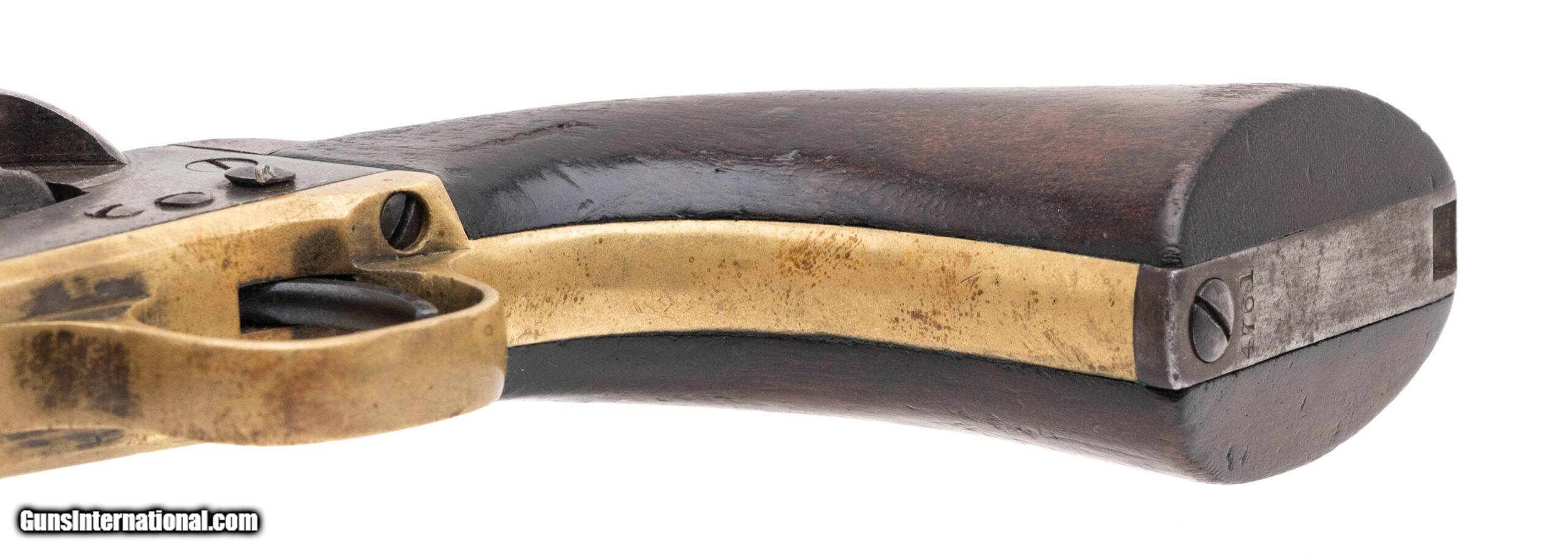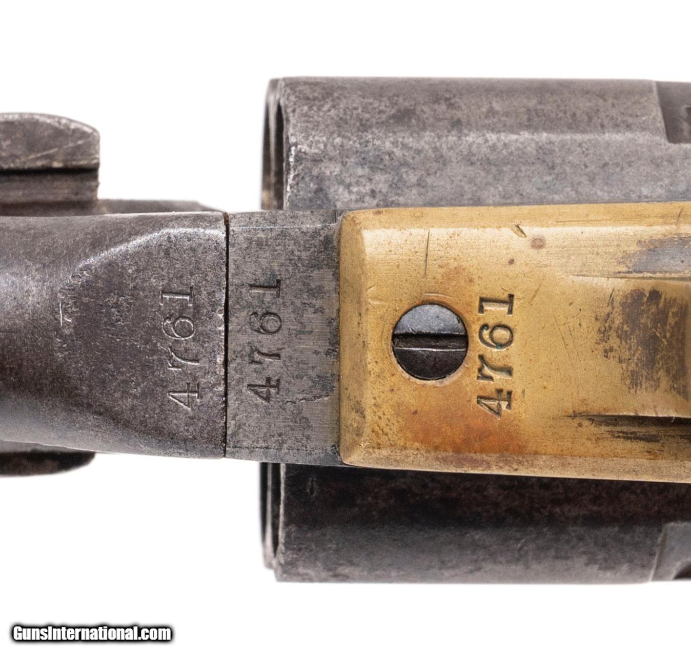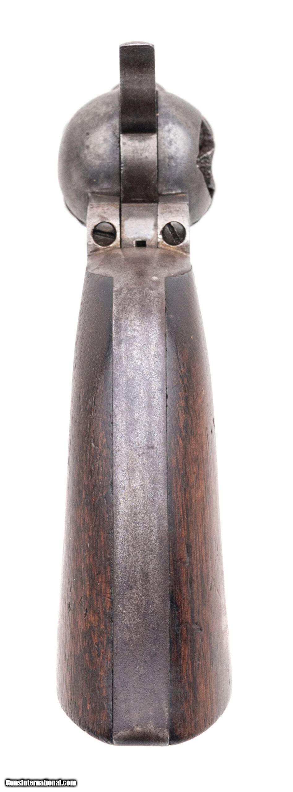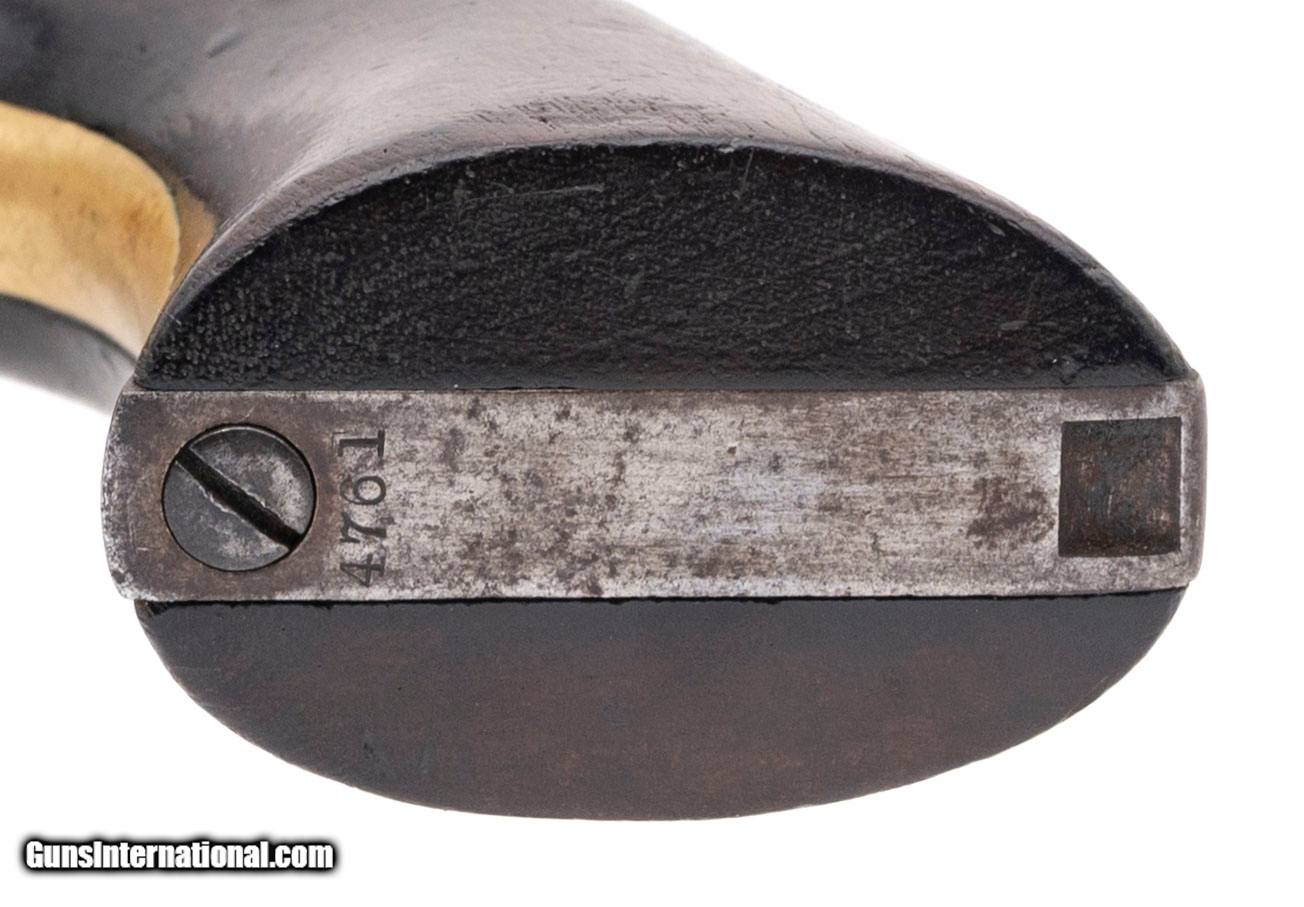 Description: "Serial number 4761. Made in 1861. 44 caliber with an 8" barrel. This is a nice sharp example of a fluted army with a smooth even gray patina throughout. The left hand side of the muzzle has one spot of pitting. The grips are excellent. This gun is pre civil war. This gun is cut for stock and has the four screw frame. Some of these guns have very interesting shipping addressed including Southern purchases. The action is very crisp and indexes perfectly. This is a fine example of a fluted army! Antique: Yes Price: $5,000.00 Contact Seller |