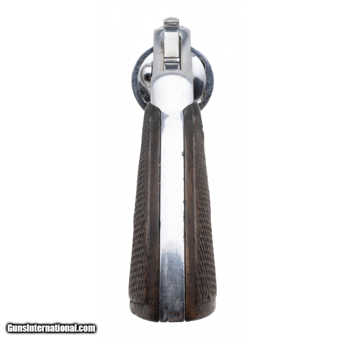 Description: " Serial No. 519828, made in 1925, .32-20, 5"" round barrel. Revolver has been renickled with light surface scratches visible throughout. Bore is good with handsome rifling noted. Brown checkered grips are slightly worn, but remain in good condition. Action indexes correctly with a tight lock up. Consignment SOLD Curio/Relic: Yes |