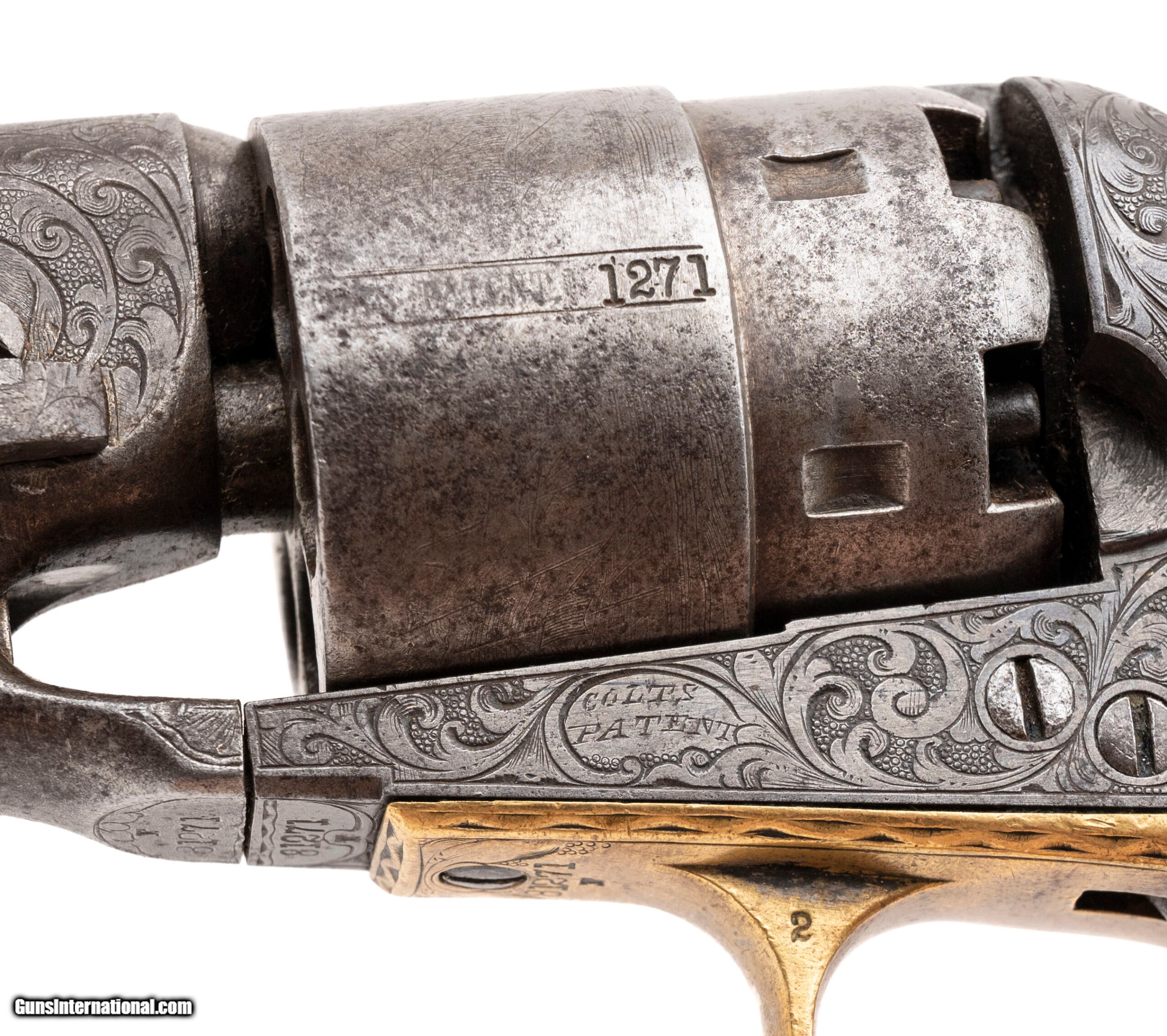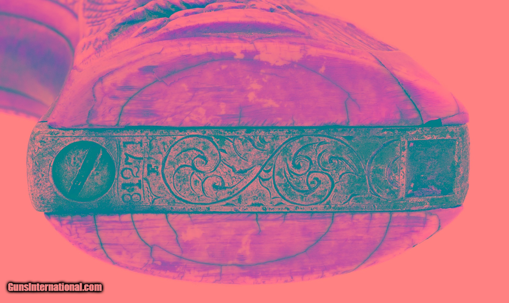 Description: "Serial number 81271. Made in 1862. 44 caliber with an 8" barrel. This is a Gustave young factory engraved piece. The metal has a dark gray patina with some spots of light pitting. The engrave is all nice and sharp. Good cylinder scene remains. This gun is all matching. The grips are checkered, carved ivory with the Mexican eagle and snake. The grips are repaired on the left hand side. The back strap is inscribed with the initials “FLG" Very fine civil war era Factory Engraved Colt 1860 Army! SOLD Antique: Yes |