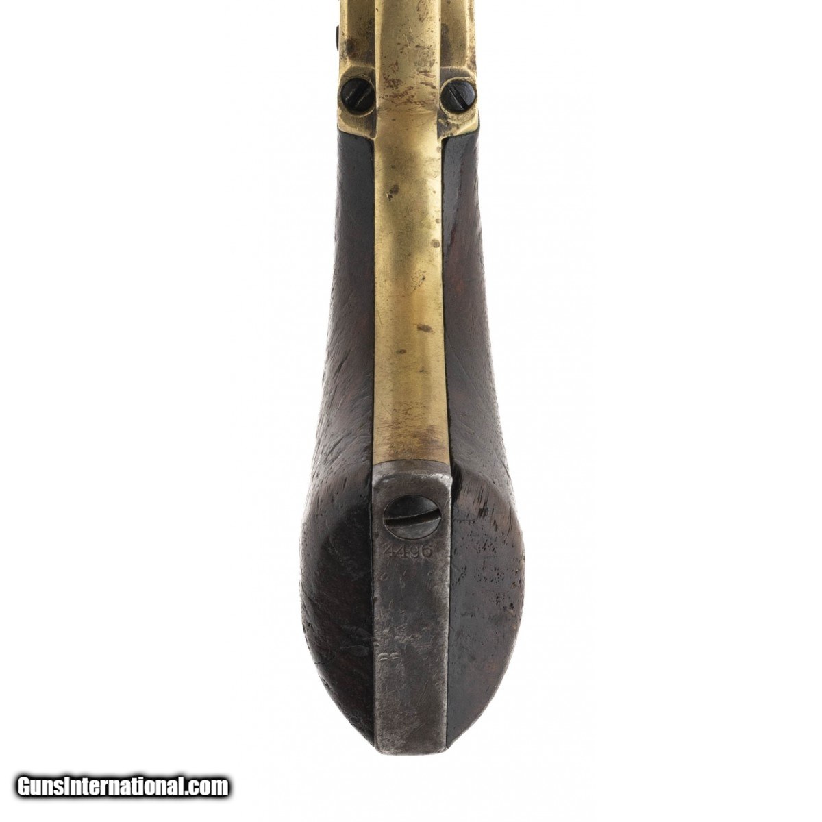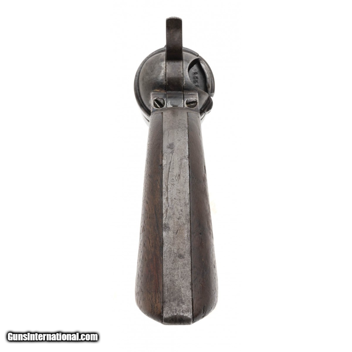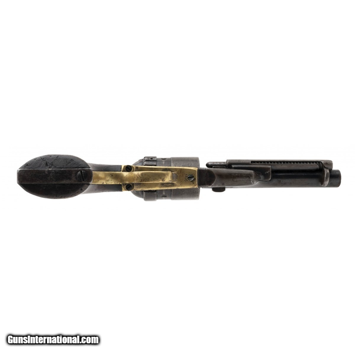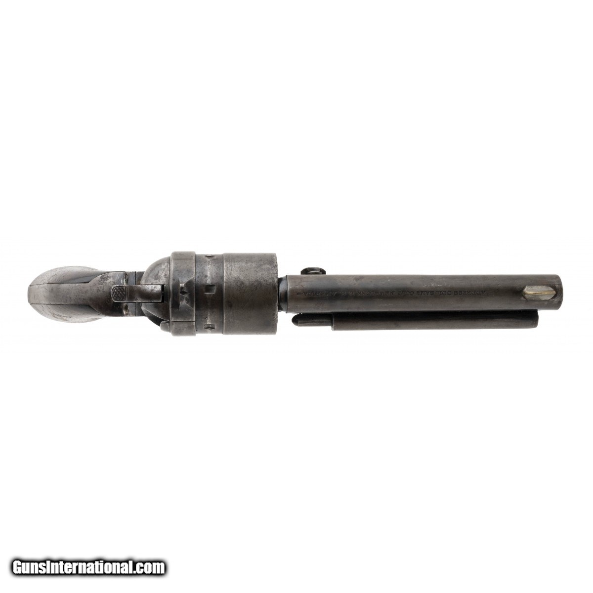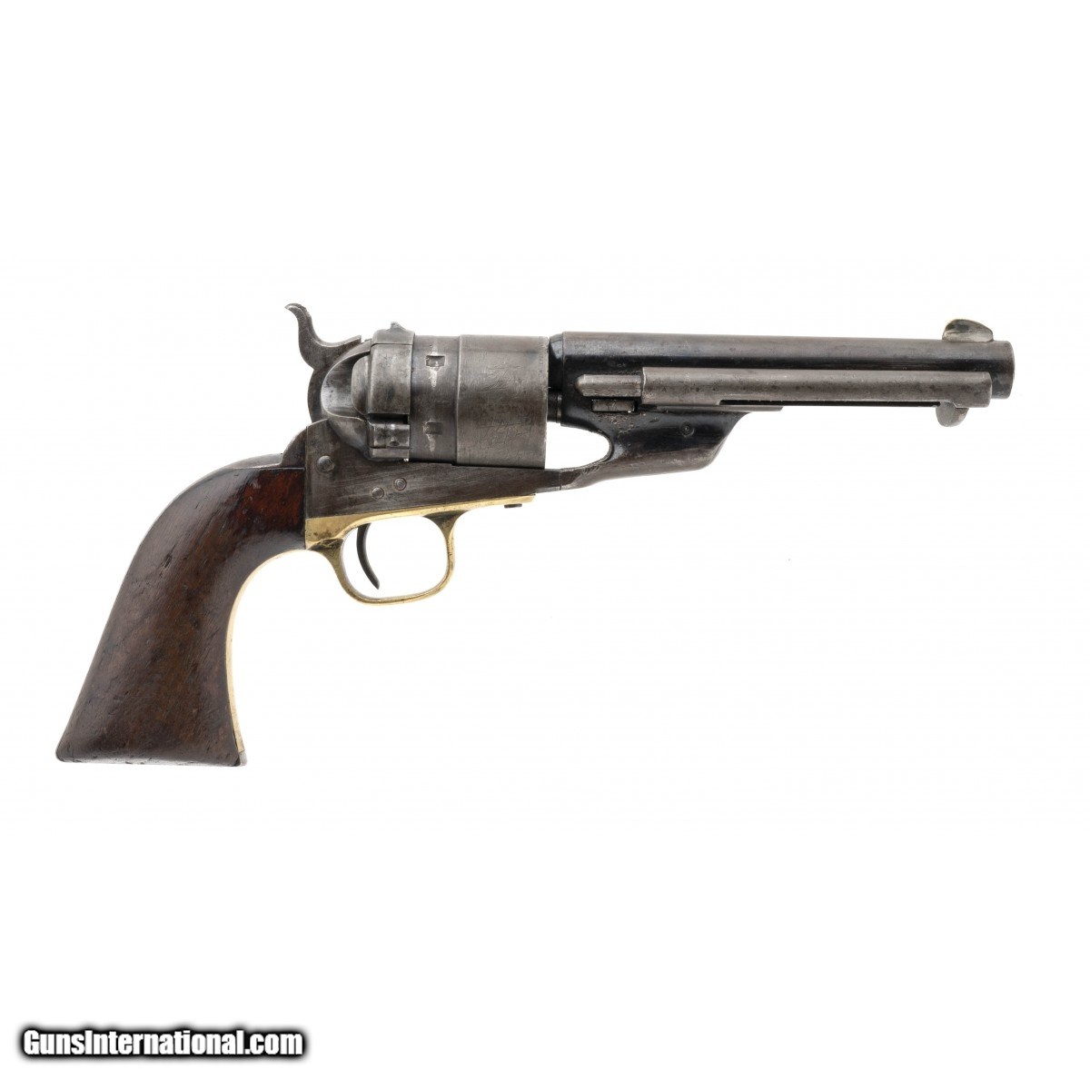 Description: " Serial No. 4496, circa 1871-1873, .44 CF, 5.4"" round barrel. Unique cut down, first serial number range Richards Conversion 6-shot revolver. Barrel is marked ""-ADDRESS COL.SAML COLT NEW-YORK U.S. AMERICA-"". Left side of trigger guard has the 1871/1872 patent dates. Left shoulder of trigger guard strap is stamped ""44CAL"". Serial numbers are matching, rolled engraved cylinder scene is crisp with ""Engaged 16 May 1843"" stamped along the forward edge. Metal is mostly a grey patina with 30% original blue visible in protected areas. Grips so heavy wear with very light traces of varnish left. Action functions correctly with a tight lock up. SOLD Antique: Yes |