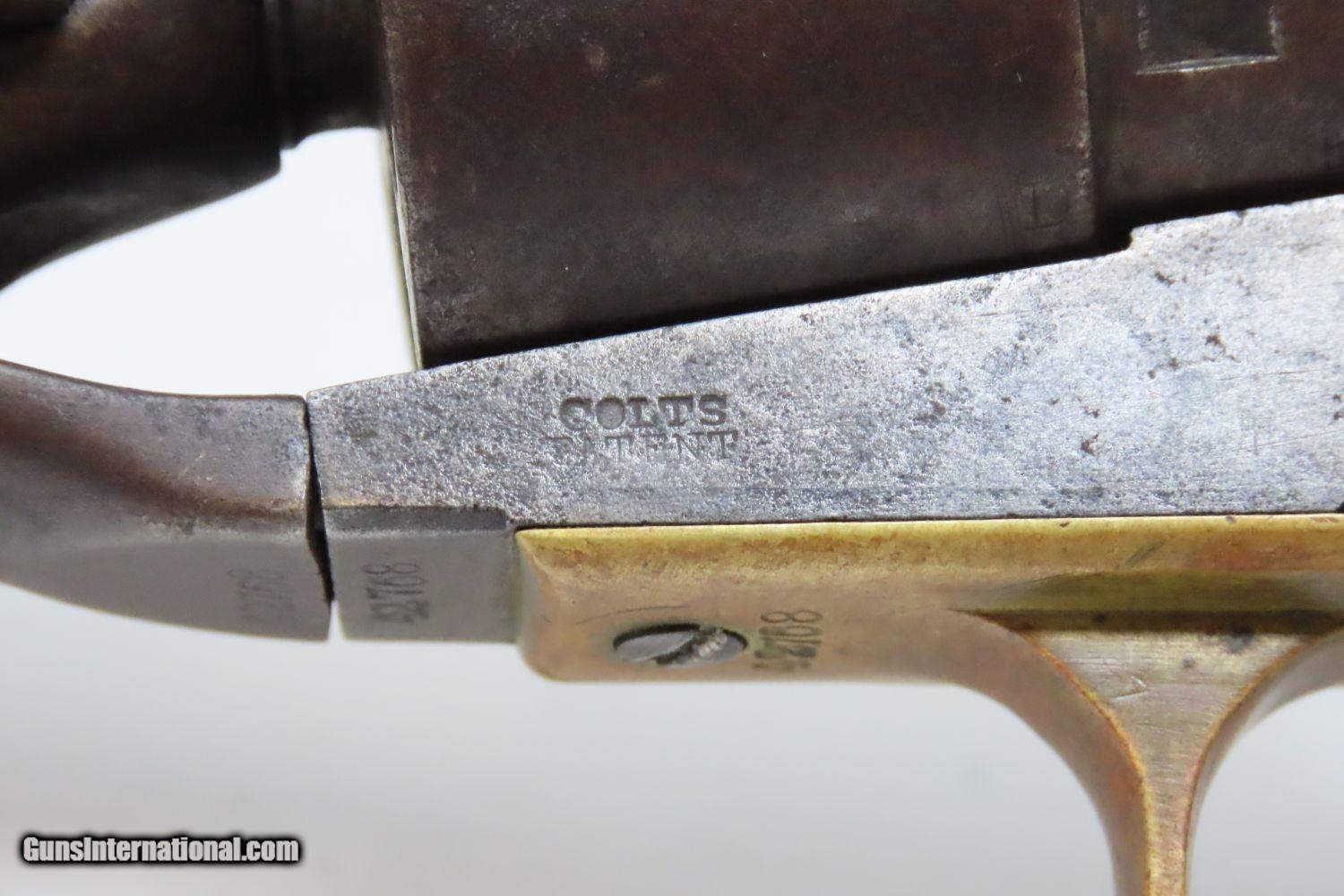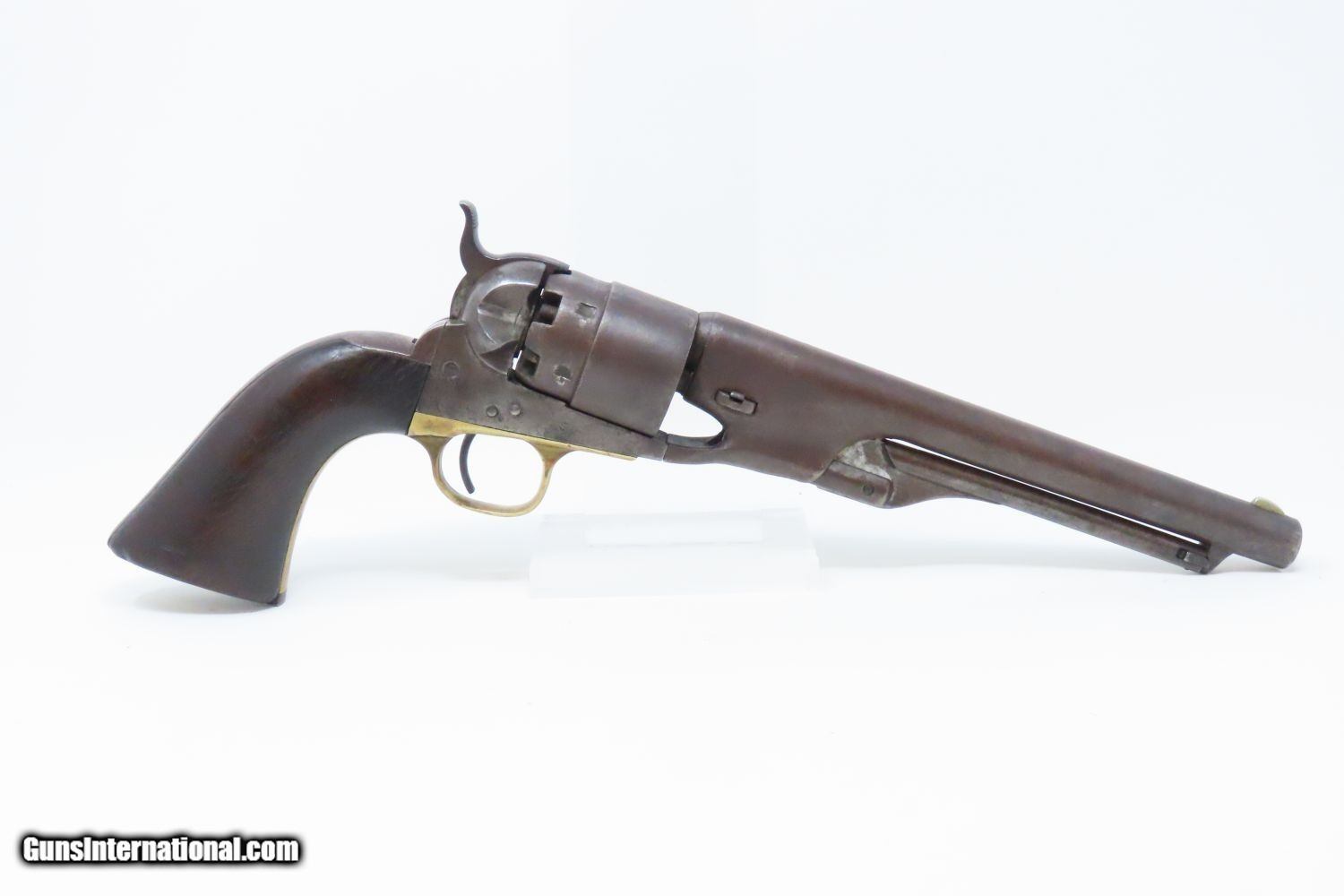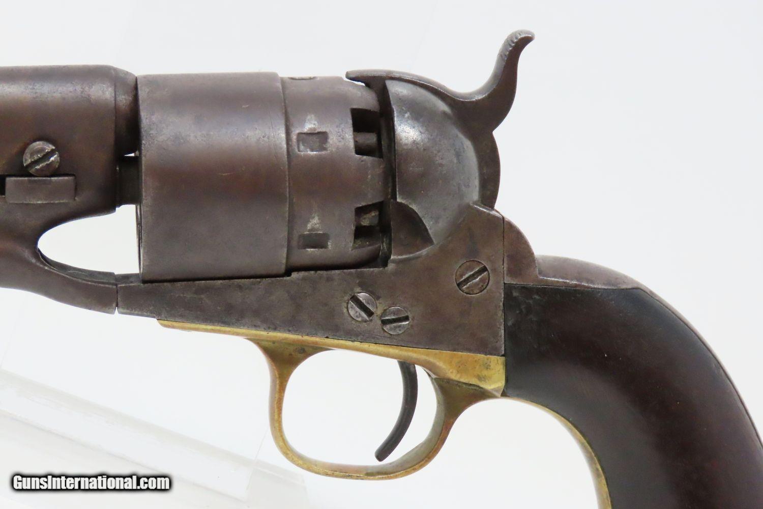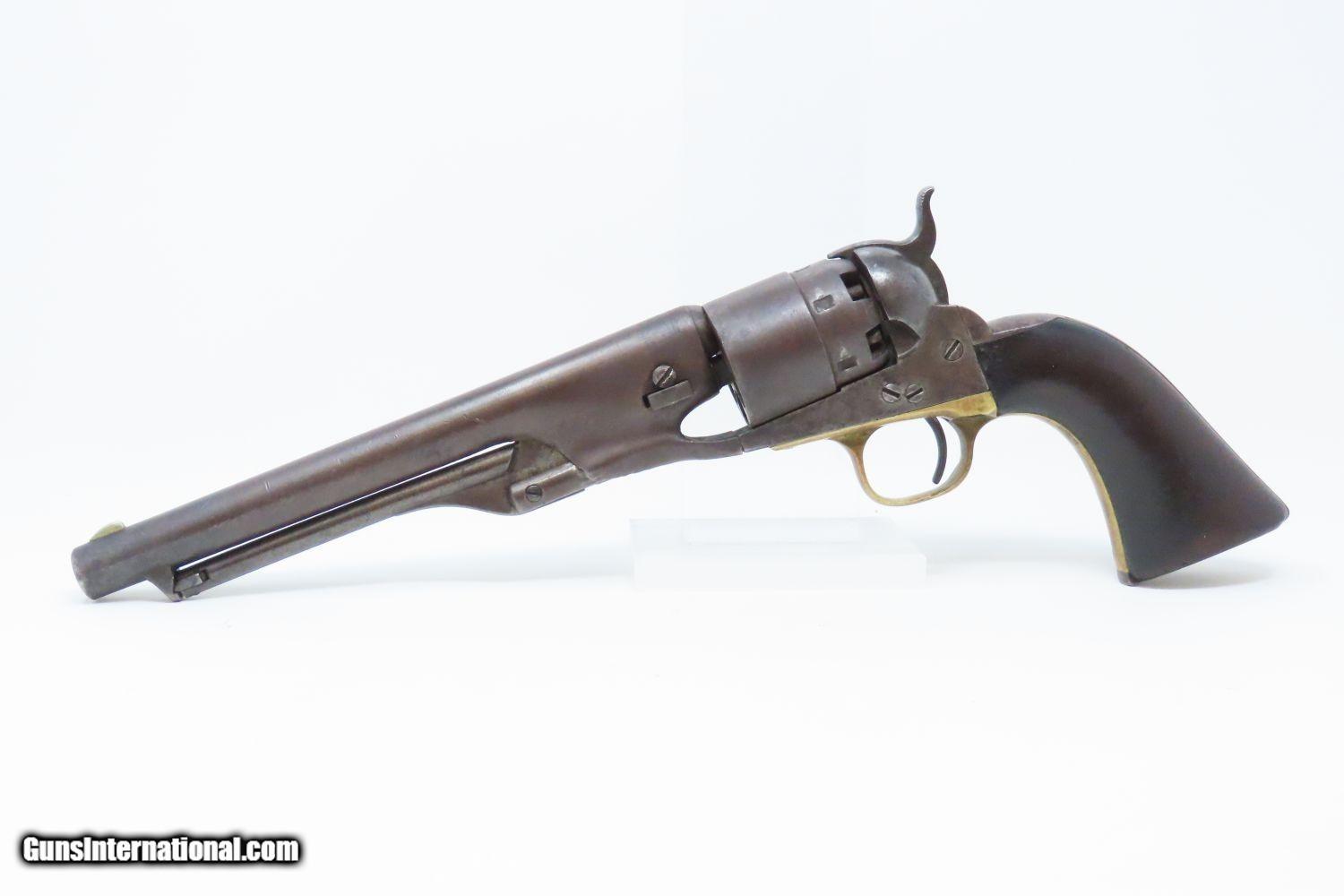 Description: 1862 mfr. CIVIL WAR COLT Model 1860 ARMY .44 Caliber Percussion REVOLVER Iconic Revolver Used Beyond the Civil War into the WILD WEST! Here we present an antique Colt U.S. Model 1860 Army Percussion Revolver, made in 1862 in Hartford, Connecticut. The 1860 Army was the single most used pistol of the American Civil War. Over 200,000 were made from 1860 to 1873, and 156,000 of those were made by the end of the war in 1865. These were excellent sidearms for officers, cavalry, infantry, and artillery troops. The 1860 Army was Samuel Colt’s finest achievement to that point, having finally developed a large caliber revolver that weighed about 2 lbs. 10 oz. to the famous Dragoon’s 4 lbs. 4 oz., and was adopted en masse by the U.S. government with huge contracts. The revolver was well balanced in hand and had a long enough barrel to be effective when utilized as a carbine with the attachable shoulder stock. This revolver represented unprecedented firepower from a handgun in the field at the time and was especially suited to Cavalry. The Confederacy, lacking in manufacturing capabilities though they were, managed to produce limited numbers of copies, and battlefield pickups of the 1860 Army were highly coveted. The 1860 Army went on to serve the U.S. military even after the Civil War and into the Indian Wars, until production of Colt’s 1873 Single Action Army created new waves in the revolver market, and again achieved great success in the military and commercial markets. The overall condition is very good. Smooth, even, brown patina. Strong and tight action. Nice bore with clear rifling. The grip is in good shape with expected wear. The bottom of the grip was carved out on either side for use with a lanyard, something that would prevent the loss of the gun while on a horse. Numbers match. A Colt 1860 Army Revolver from 1862 in “attic” condition! Own the original! This is a legitimate antique and not a reproduction. Barrel is 8 inches. Caliber: .44 Percussion Overall condition as seen in photos. Very Fast. Very Safe. FREE SHIPPING WORLDWIDE. Delivered directly to your door by express mail! Guaranteed AUTHENTIC & Includes CERTIFICATE OF AUTHENTICITY. ancestryguns $3465 #210569 SOLD Antique: Yes |
