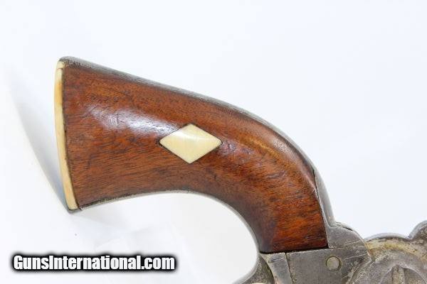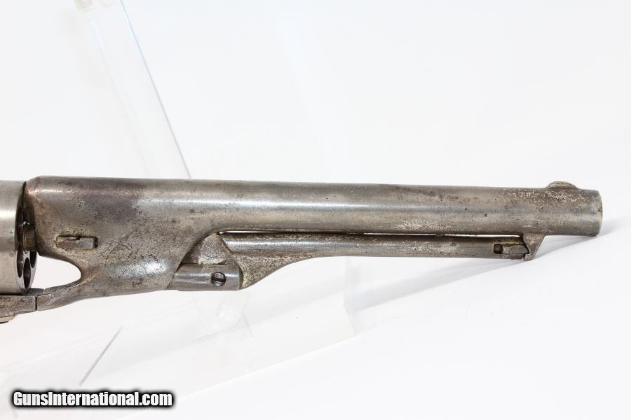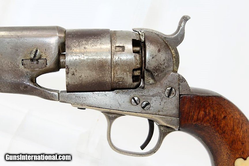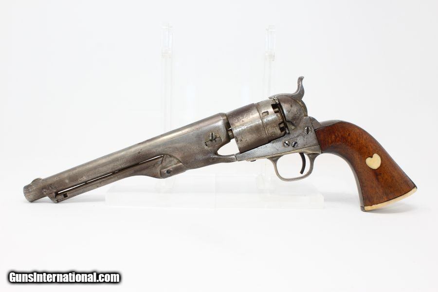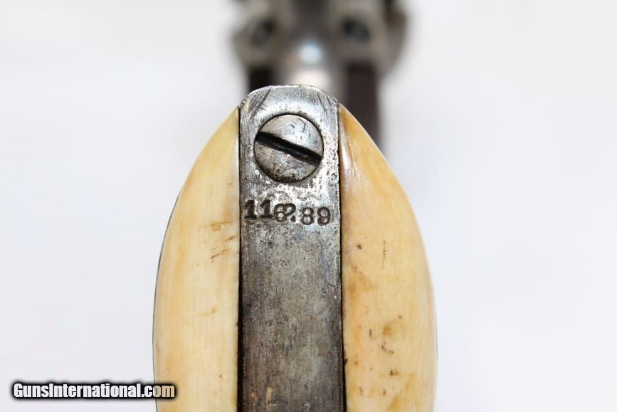 Description: CIVIL WAR Antique COLT 1860 ARMY .44 Revolver With Neat Ivory Embellished Grips! Here we present an antique Colt Model 1860 Army Percussion Revolver, made in 1863 in Hartford, Connecticut, in the middle of the Civil War. The 1860 Army was the single most used pistol of the American Civil War. Over 200,000 were made from 1860 to 1873, and 156,000 of those were made by the end of the war in 1865. These were excellent sidearms for officers, cavalry, infantry, and artillery troops. The 1860 Army was Samuel Colt’s finest achievement to that point, having finally developed a large caliber revolver that weighed about 2 lbs. 10 oz. to the famous Dragoon’s 4 lbs. 4 oz., and was adopted en masse by the U.S. government with huge contracts. The revolver was well balanced in hand and had a long enough barrel to be effective when utilized as a carbine with the attachable shoulder stock. This revolver represented unprecedented firepower from a handgun in the field at the time and was especially suited to Cavalry. The Confederacy, lacking in manufacturing capabilities though they were, managed to produce limited numbers of copies, and battlefield pickups of the 1860 Army were highly coveted. The 1860 Army went on to serve the U.S. military even after the Civil War and into the Indian Wars, until production of Colt’s 1873 Single Action Army created new waves in the revolver market, and again achieved great success in the military and commercial markets. This one has been there and done that! This one went on to get nickel finished after the war and saw so much use that much of that is gone. It also got some really fabulous ivory inlays on the grip, a great example of folk art. Regardless of use, this revolver remains mechanically sharp and a great gun altogether. The overall condition is very good. The markings are clear. Grips are in great shape. The bore is in good shape with sharp rifling. The action is excellent. If you want an example of a Colt 1860 Army made during the Civil War that has tons of character and has been there and done that, this is it! Own the original! This is a legitimate antique and not a reproduction. Barrel is 8 inches. Caliber: .44 Overall condition as seen in photos. Very Fast. Very Safe. FREE SHIPPING WORLDWIDE. Delivered directly to your door by express mail! Guaranteed AUTHENTIC & Includes CERTIFICATE OF AUTHENTICITY. ancestryguns $1995 #8356 SOLD Antique: Yes |