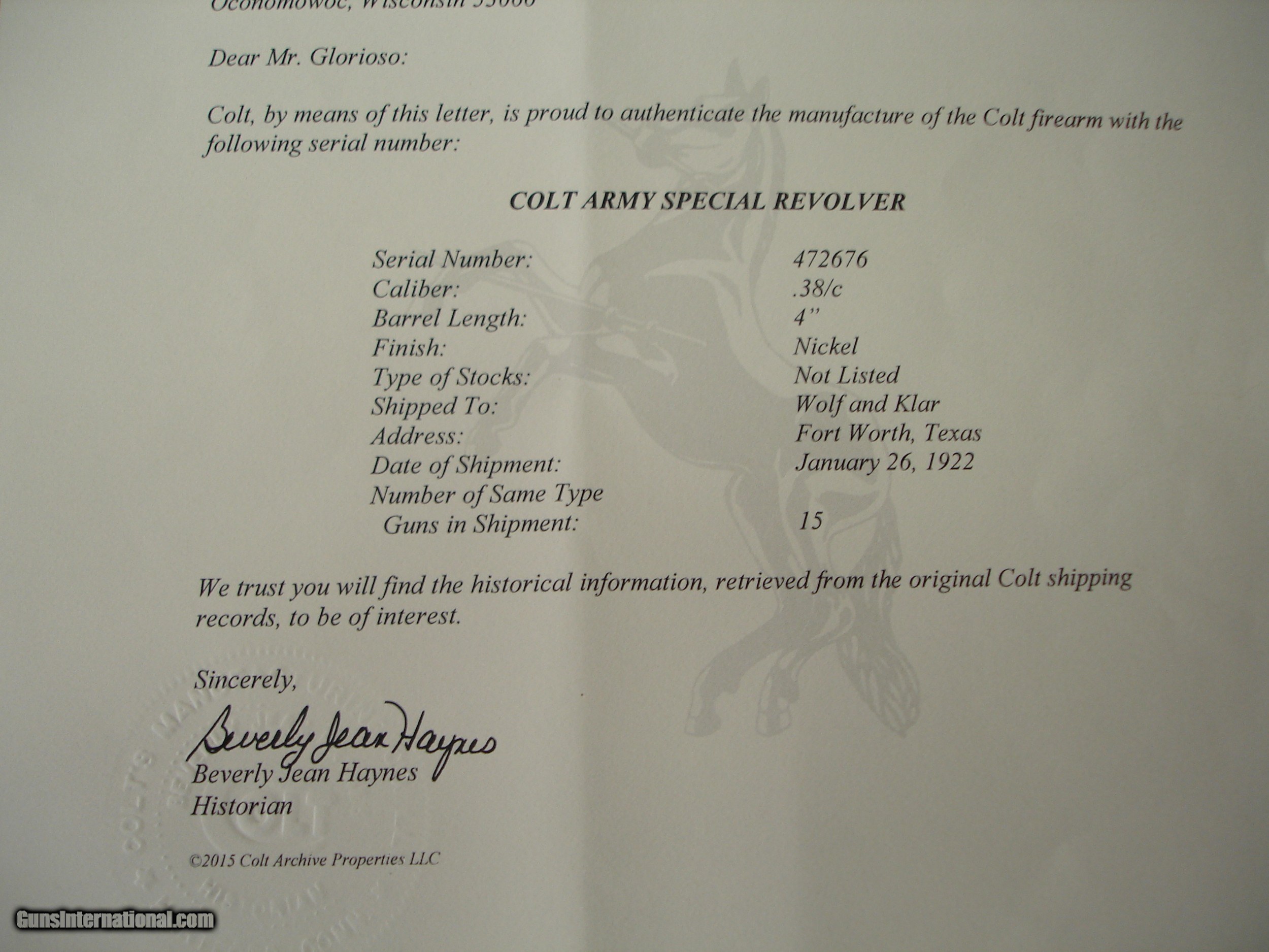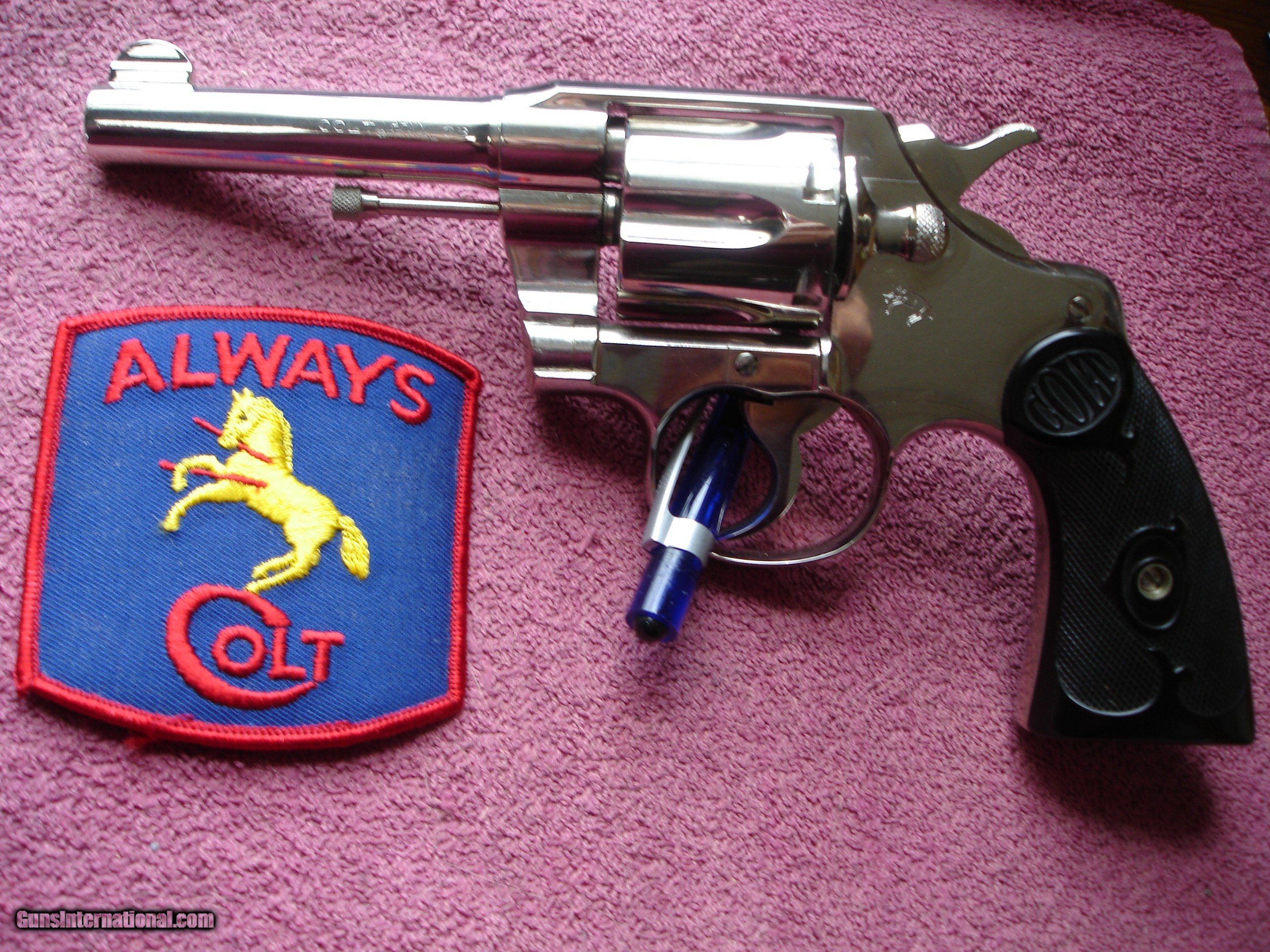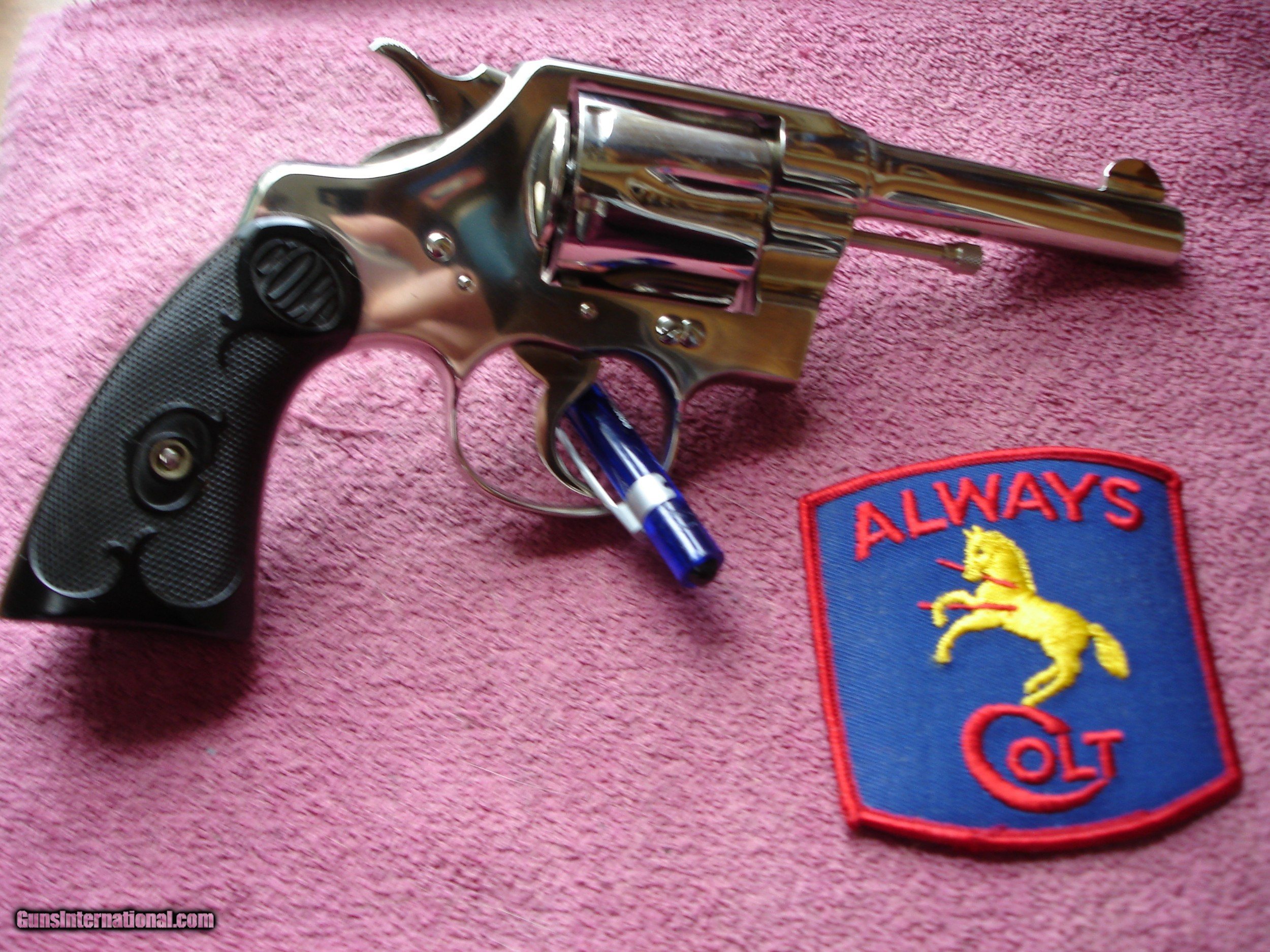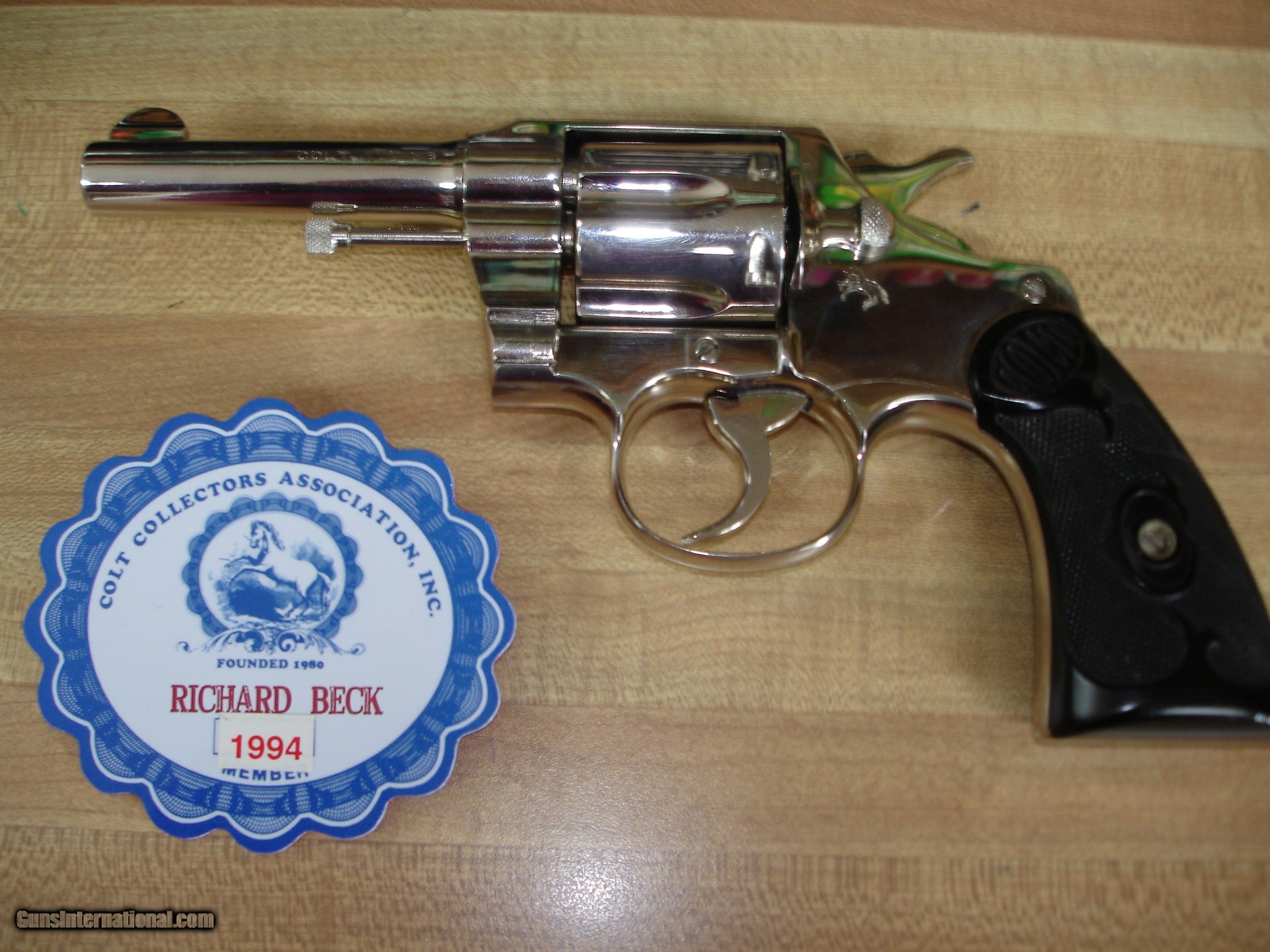 Description: Out of my long time collection I have for sale A Beautiful Pre-War Bright Nickel Army Special. D/A Revolver in .38 Special. This Gem was Shipped on 1-26-1922 Colt Factory Lettered. Bright Nickel Factory finish. 4" BBl. Mint Bore, appears to have been fired very little. Beautiful Mint Fleur-de-lis pattern hard rubber stocks. Numbered to the revolver. Weight is 31.9oz. What a Great 99,year old addition for your collection. Perferct to fire and enjoy. SER# 47276 $1399.00 Shipping & Insurance to your FFL $35.00 C&R is also Fine Sold: Pending SOLD Curio/Relic: Yes |