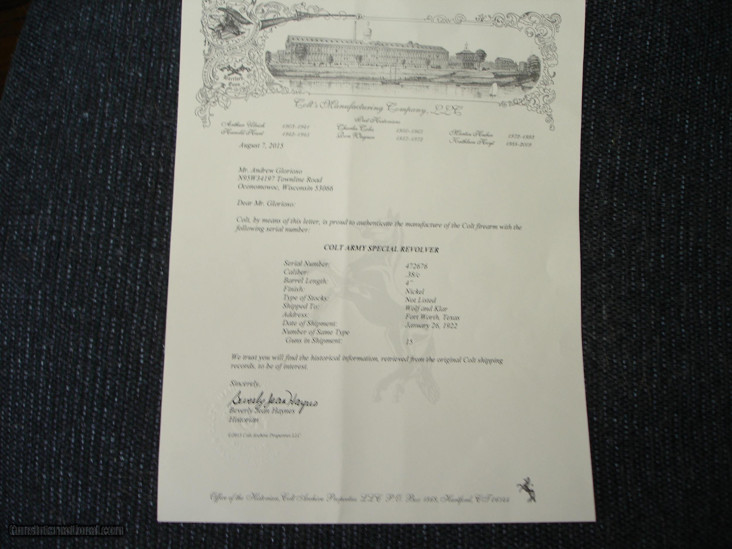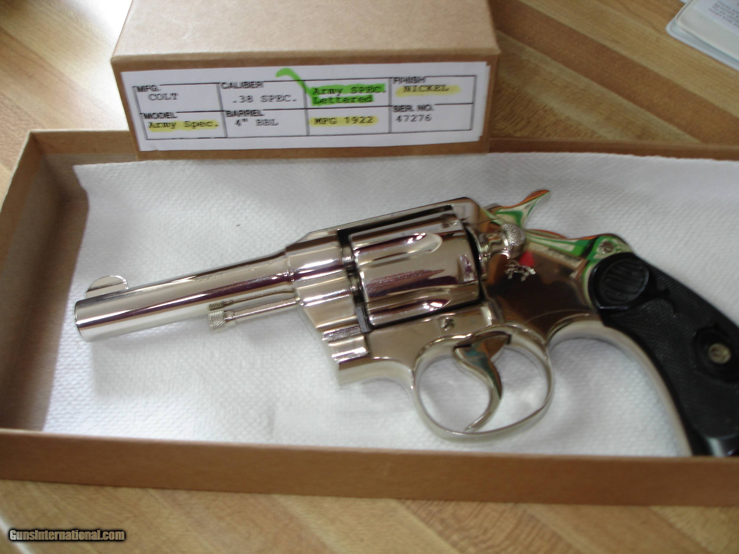 Colt Army Spec. Pre War .38 Spec. Bright Nickel MFG 1-26-1922 Colt Letter 4" BBl. Black Hard Rubber Stocks Near.Mint