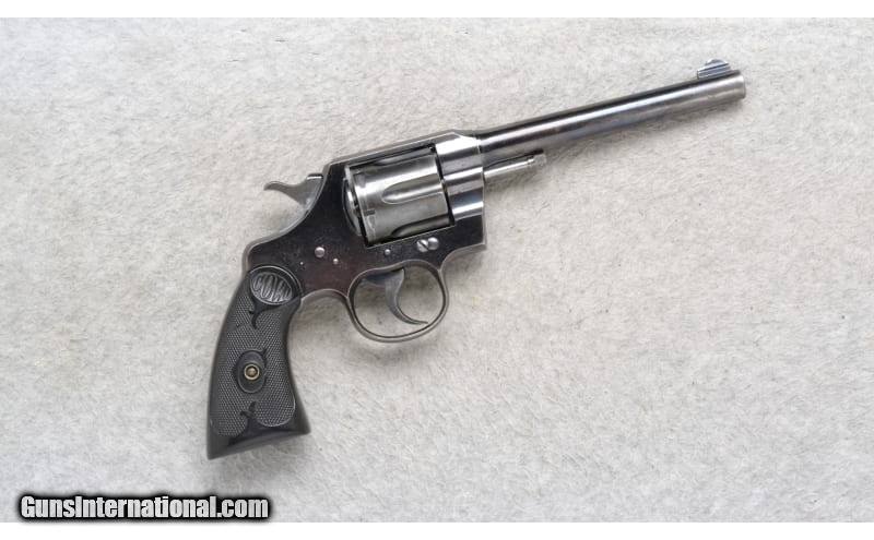 Description: This Colt Model Army Special is a 6 shot double action revolver in .32-20 WCF Cal. It has a 6 inch barrel. A blade front sight and an integral notch rear sight. The grip is a checkered hard black plastic with Colt. The left side grip has a chip missing. .32-20 WCF SOLD Chambers: 6 shot. Metal Condition: "Fair. Has some blue wear, freckling and minor handling marks. Wood Condition: Black plastic left side grip has a piece missing. Bore Condition: Very Good. Barrels: 6 inch. Triggers: SA/DA Weight: 38 oz. Sights: Blade front. Integral notch rear. Item Location: Richfield, WI |