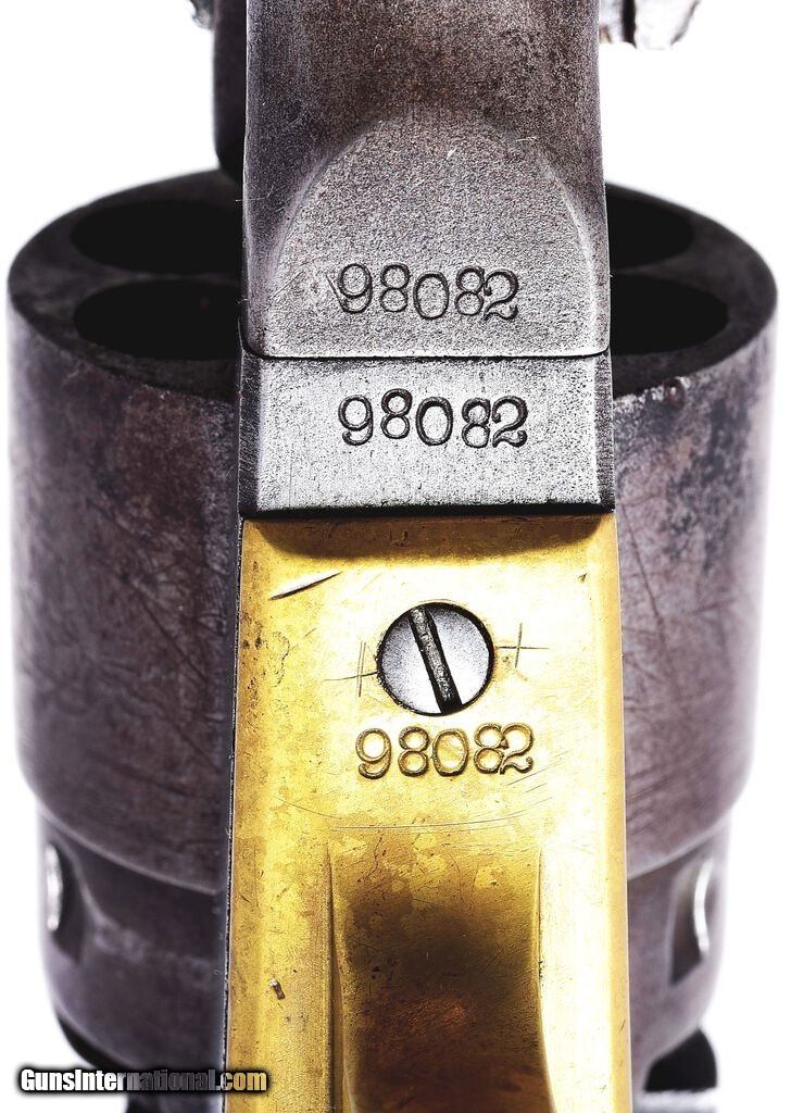 Description: IN HAND NOW!....COLT MODEL 1860 ARMY PERCUSSION REVOLVER...1863 Mfg...Civil War......LAYAWAY?....Classic .44 caliber sidearm of the American Civil War. This example manufactured in 1863. Standard 8" round barrel, New York Address, German silver blade front sight, v-notch rear sight cut into hammer, and rebated 6-shot percussion cylinder with naval engagement scene. "W" inspector stamp fount on cylinder and barrel assembly. Recoil shield is cut for shoulder stock with matching steel back strap. Oil finished smooth walnut grips with faint inspector cartouches. CONDITION: Very good. Overall dove gray patina with some older oxidation spots. Brass bright but starting to mellow. Markings clear with cylinder scene largely visible. Grips good with some impressions. Very good bore with crisp rifling and some light oxidation. Crisp mechanics. Matching complete or partial numbers observed on frame, barrel assembly, trigger guard, back strap, cylinder, cylinder arbor, wedge...S/H $25. 2nd firearm ships FREE with this one!......Thanks, Greg 64-67 SOLD Antique: Yes Handgun Caliber: .44 Manufacturer: Colt Model: Army Serial Number: 98082 |