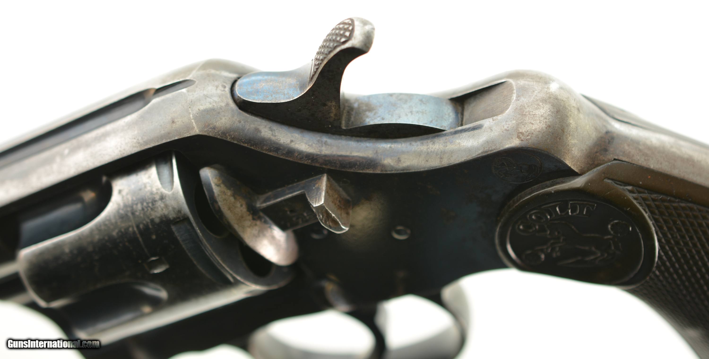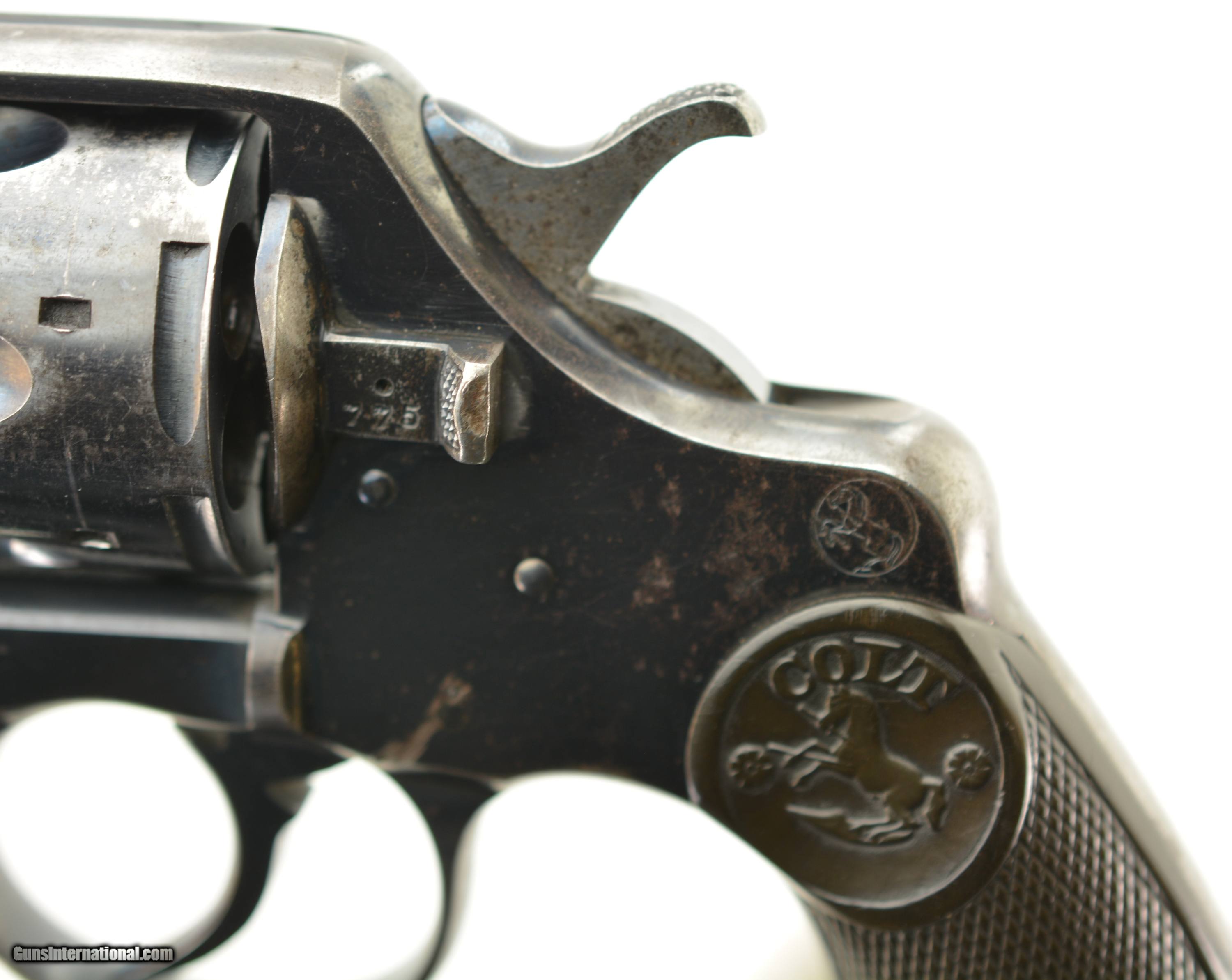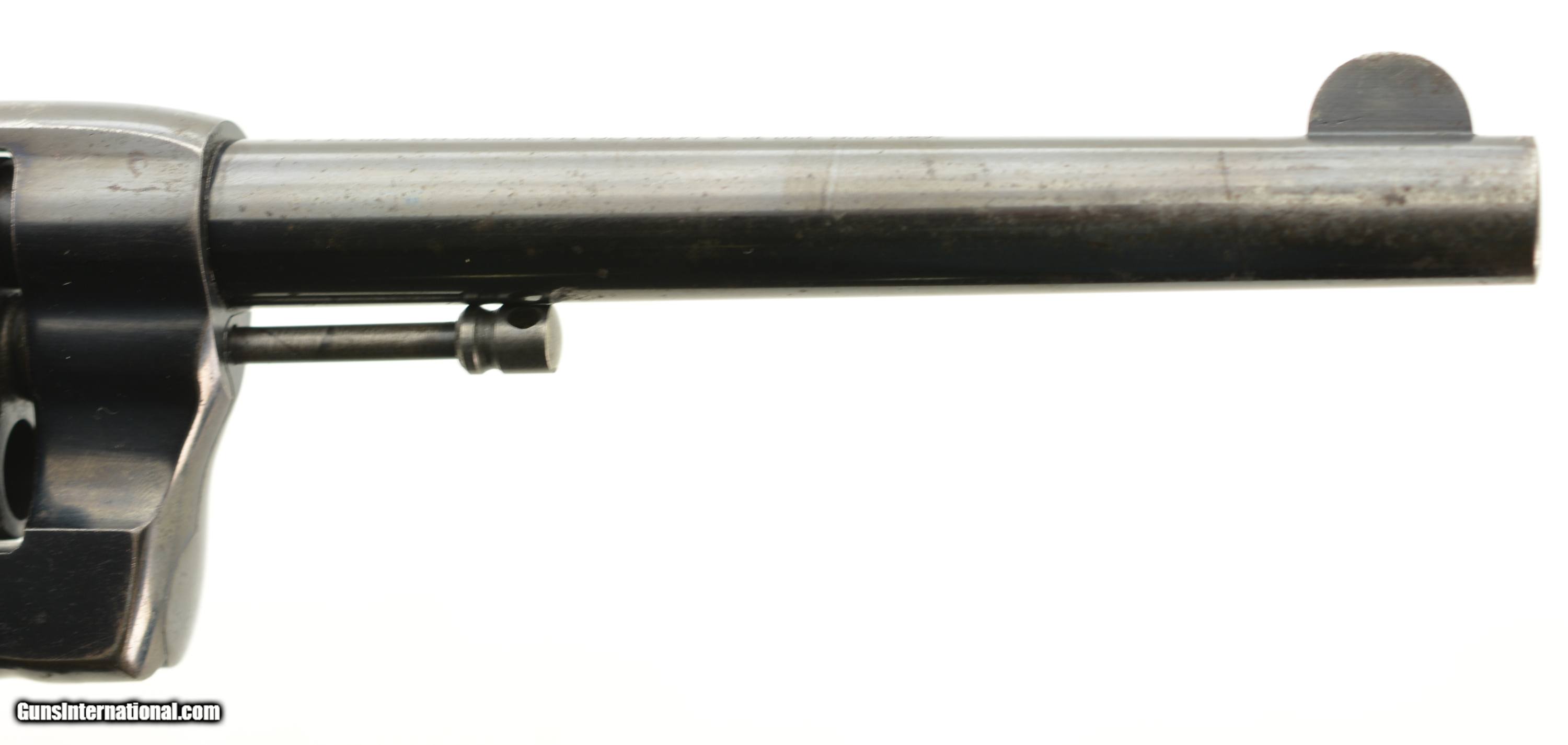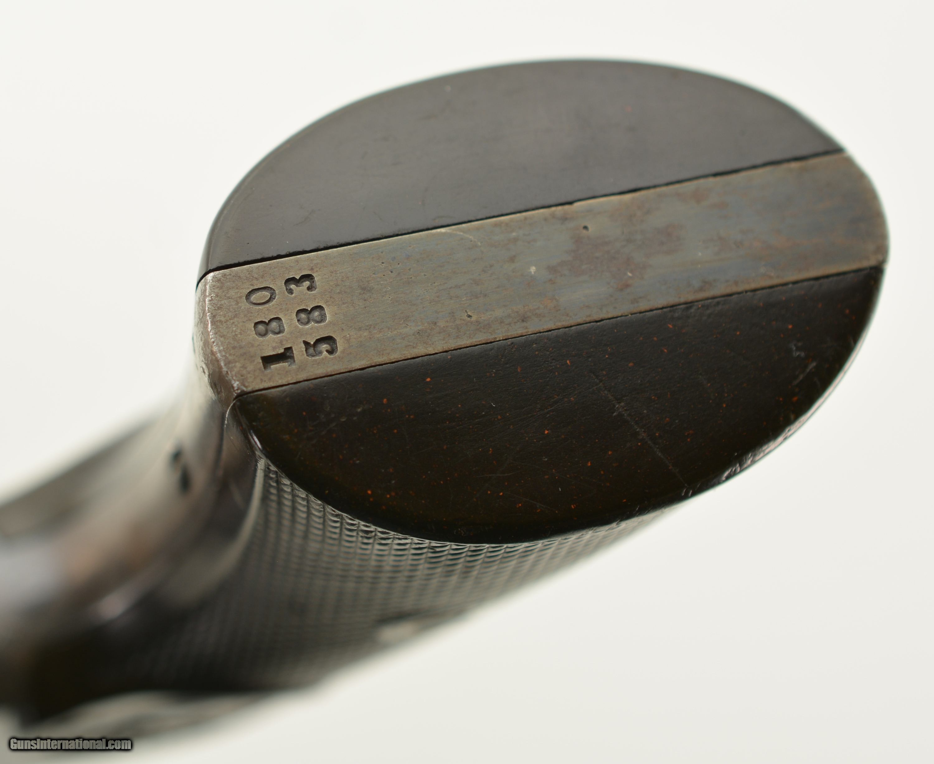 Description: Serial #180583, .41 Colt, 6" barrel with a fine, bright bore that has a small amount of freckling within the grooves. The metal surfaces of this handsome, 1902-manufactured revolver retain about 80-85% of the original blue with some moderate silvering and fading along the high and projecting edges. Some handling marks are also present, and there are a few areas of pinprick pitting and specks of mild surface oxidation. The trigger still retains lots of original fire blue, while the hammer has thinning fire blue remaining along the spine, with light freckling on the otherwise bright sides. The checkered hard rubber factory grips are assembly numbered to the gun and they rate near excellent with only a few handling marks, and some flattening of the points. There is a factory rework mark on the cylinder under the extractor, and the action is fully functional, with a good lock-up. This is a fine example of a Model 1902 Colt overall. FFL or C&R SOLD Curio/Relic: Yes Manufacturer: Colt Model: 1902 Serial Number: 180583 Caliber Info: .38 Gauge Info: .38 |