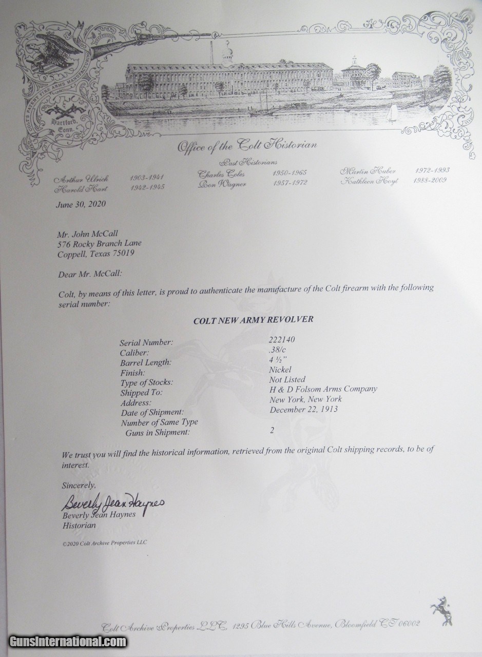 COLT NEW ARMY MODEL REVOLVER from COLLECTING TEXAS - .38 CALIBER – MADE 1913 – FACTORY LETTER – ANTIQUE by CALIBER & DESIGN