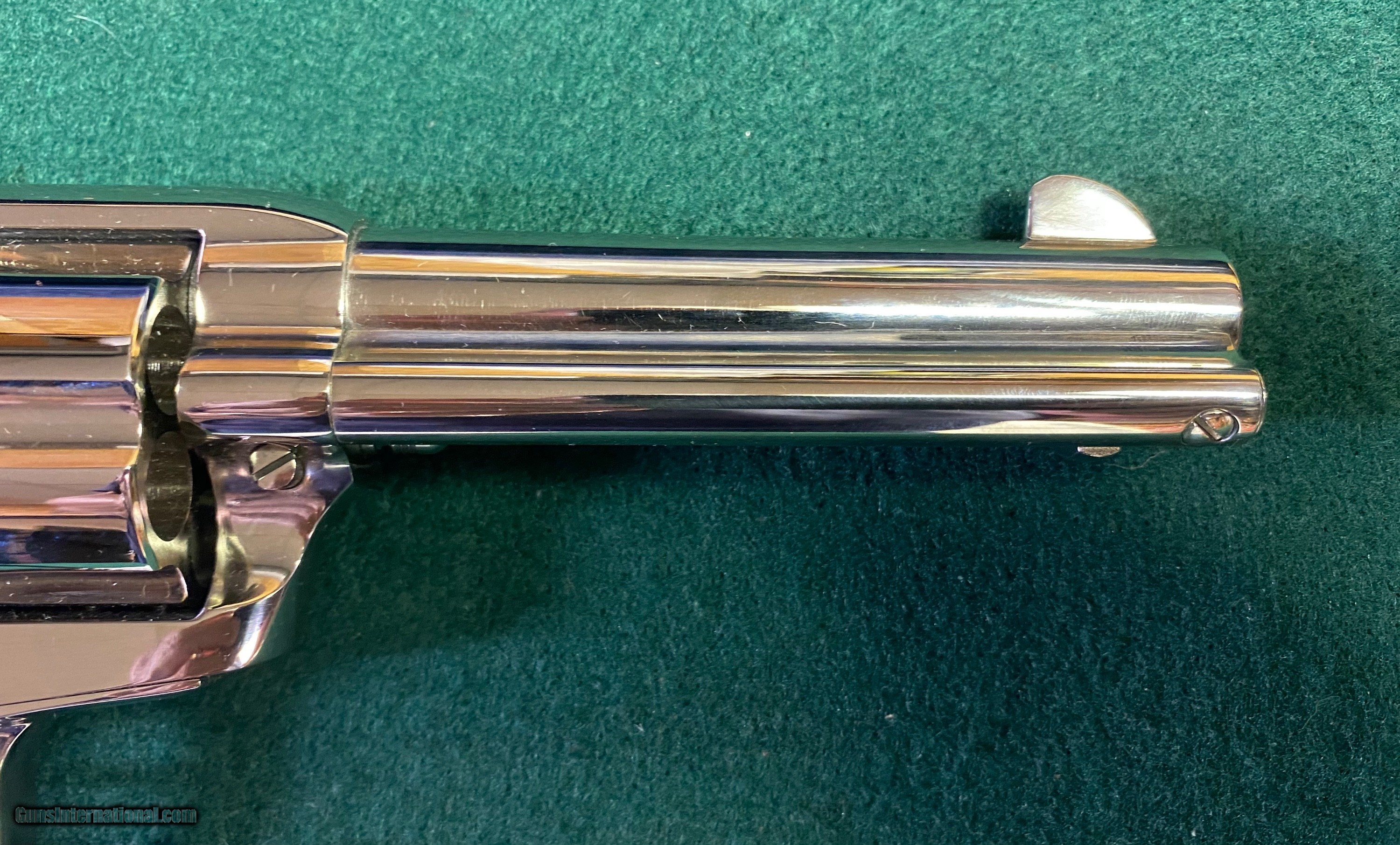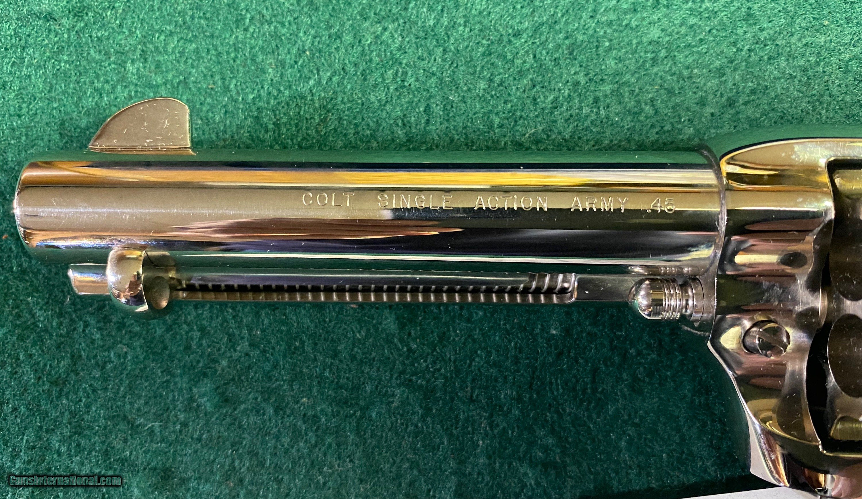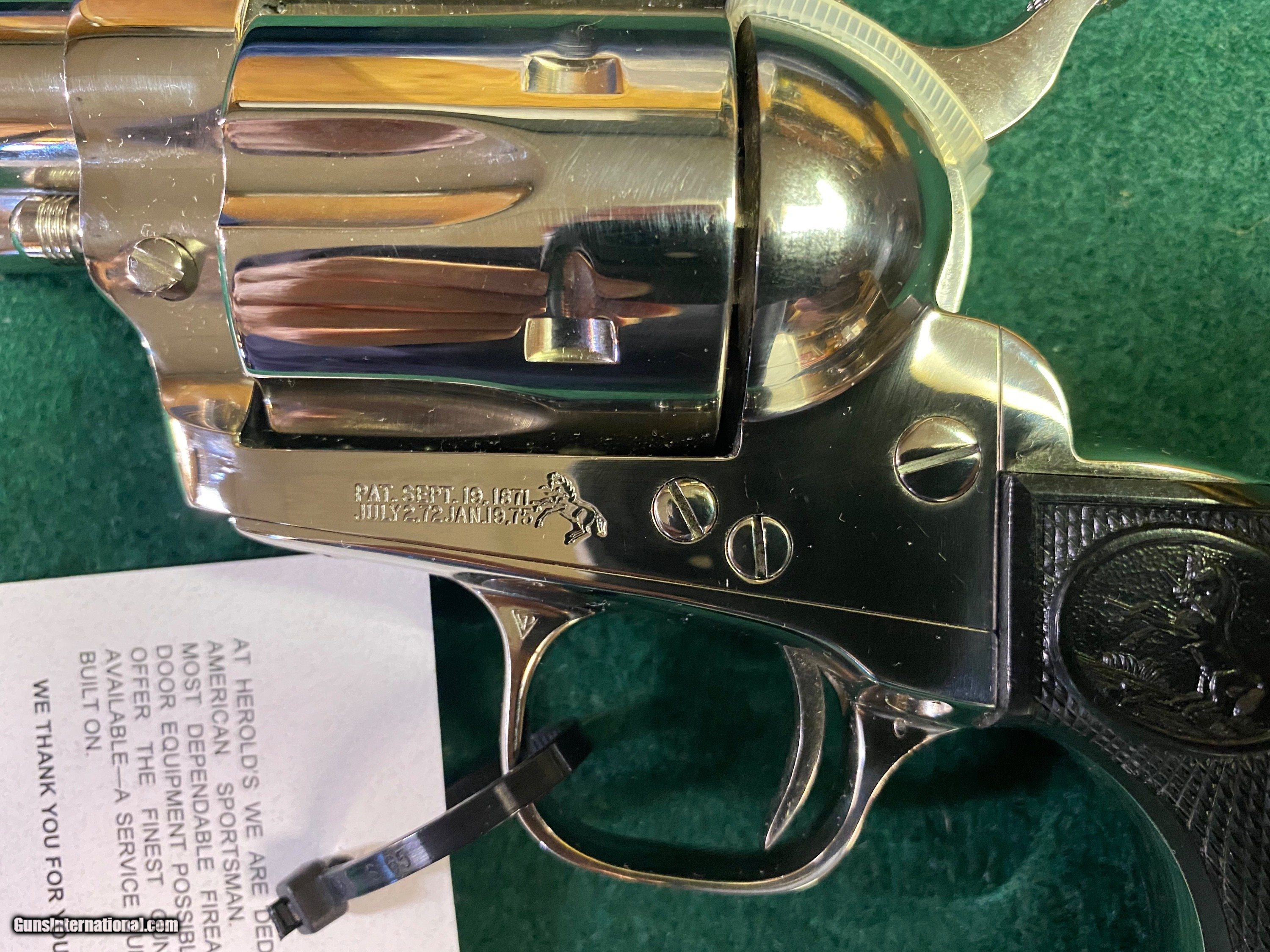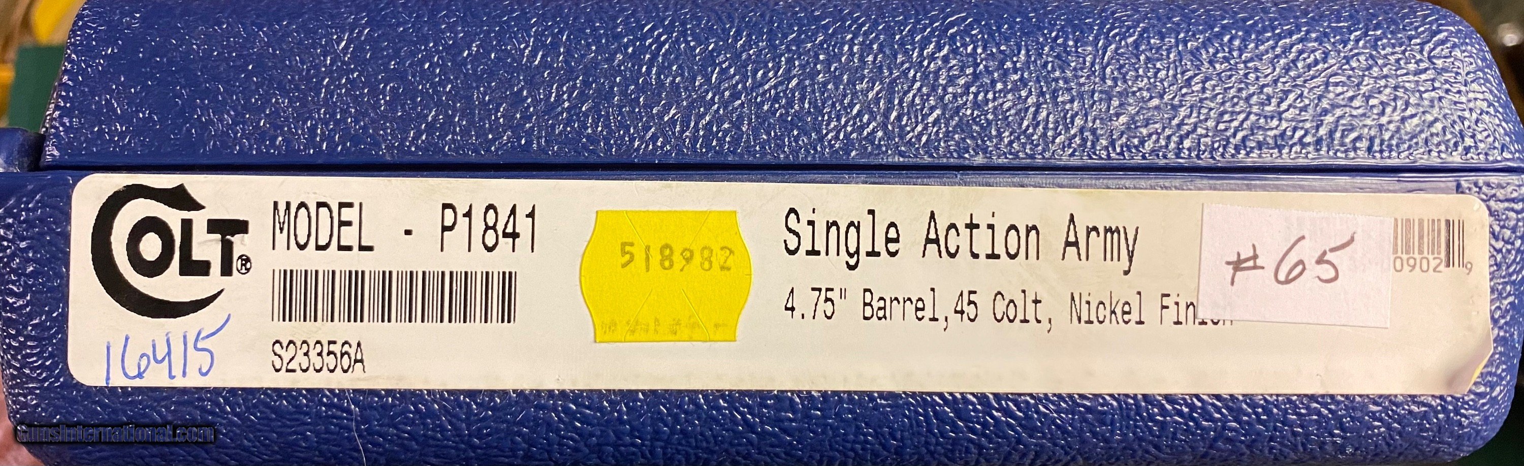Description: Yet another jewel of a Colt Single Action Army revolver has arrived at our shop on consignment. This time it's a third generation SAA that comes with the box and is "As-New". Caliber is .45LC w/a 4 3/4" barrel. Has a zip tie around the hammer so that cylinder won't rotate and leave a dragline. (This item can be considered new old stock) Please see pictures for more details. We reserve the right to sell this item at our retail location until an offer is placed on Guns International. Once funds are received for this item, it is removed from our sales floor. $3150 + $30 for shipping. Business hours are Tuesday through Saturday, 9 AM to 5 PM. Closed on Sunday and Monday. Credit cards are welcome with a 4% fee. Personal checks are also accepted, however we do not ship the item until your check clears our bank. Stop on by and see our wide selection of vintage and modern firearms at George Herold's Gun Shoppe located in Waynesboro, Pa. George and Denise welcome you to the shop. SOLD Handgun Caliber: .45 Colt Manufacturer: Colt Model: Single Action Army Serial Number: S2335xx Barrel Length: 4 3/4” Condition: As new w/box |