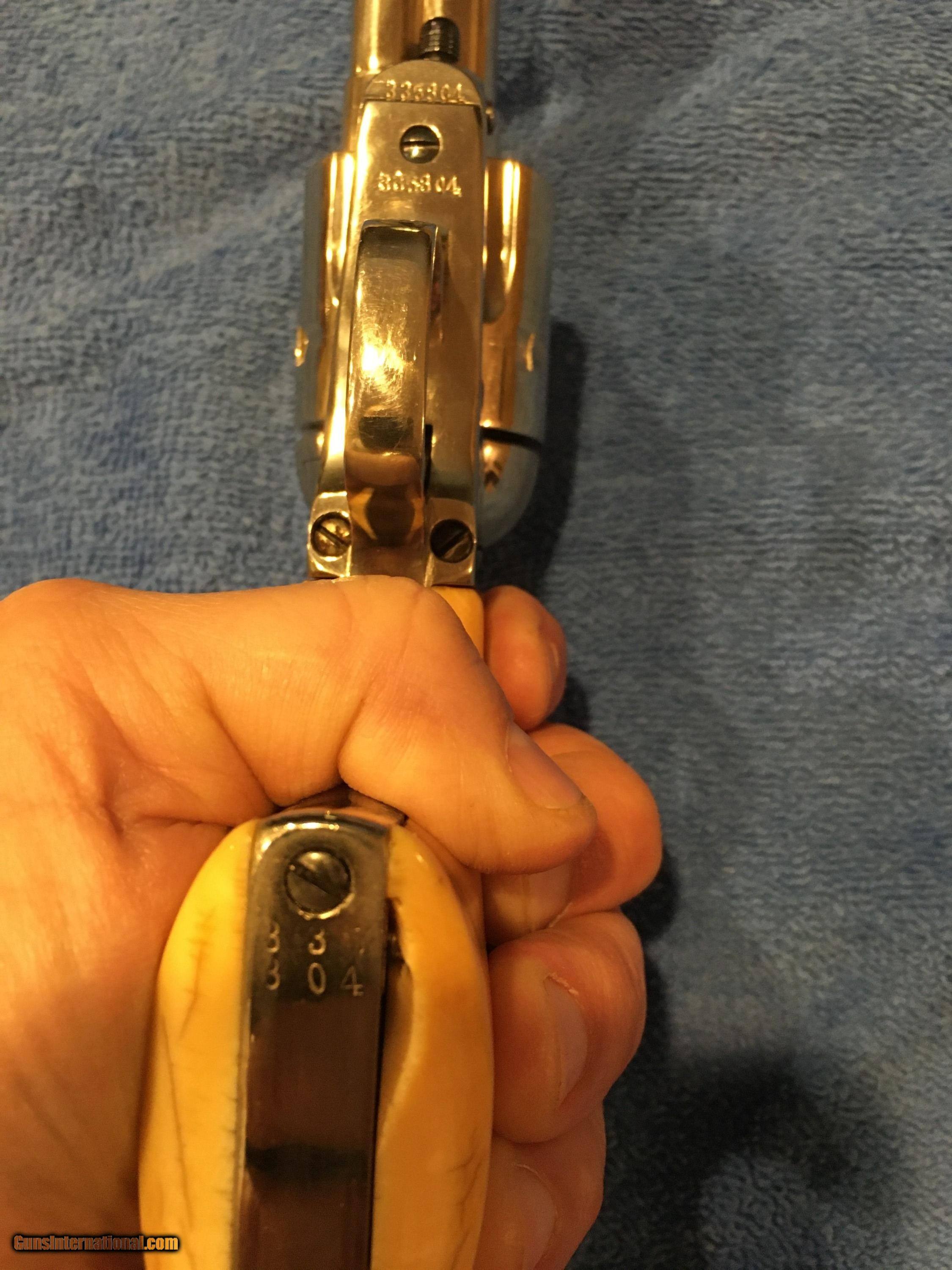 Description: SOLD Colt, single action army built in 1917. This revolver letters as a 5 1/2" blue finish .45 caliber. It is now a 7 1/2" nickel plated 44 Special. It has gorgeous original Colt Ivory grips. Pistol is in good shape for a 100+ years old. Colt has been in my family collection for over 50 years. $1,800 OBO. Personal or Cashiers checks accepted. Buyer pays all shipping and insurance costs. Check must clear prior to shipping pistol. Call 478 290-7502 for questions. SOLD SOLD Curio/Relic: Yes |