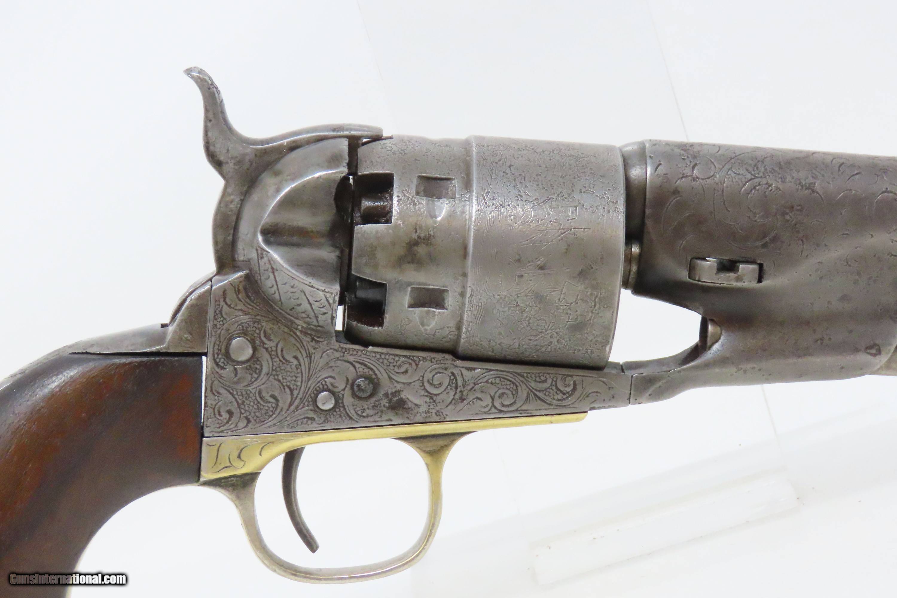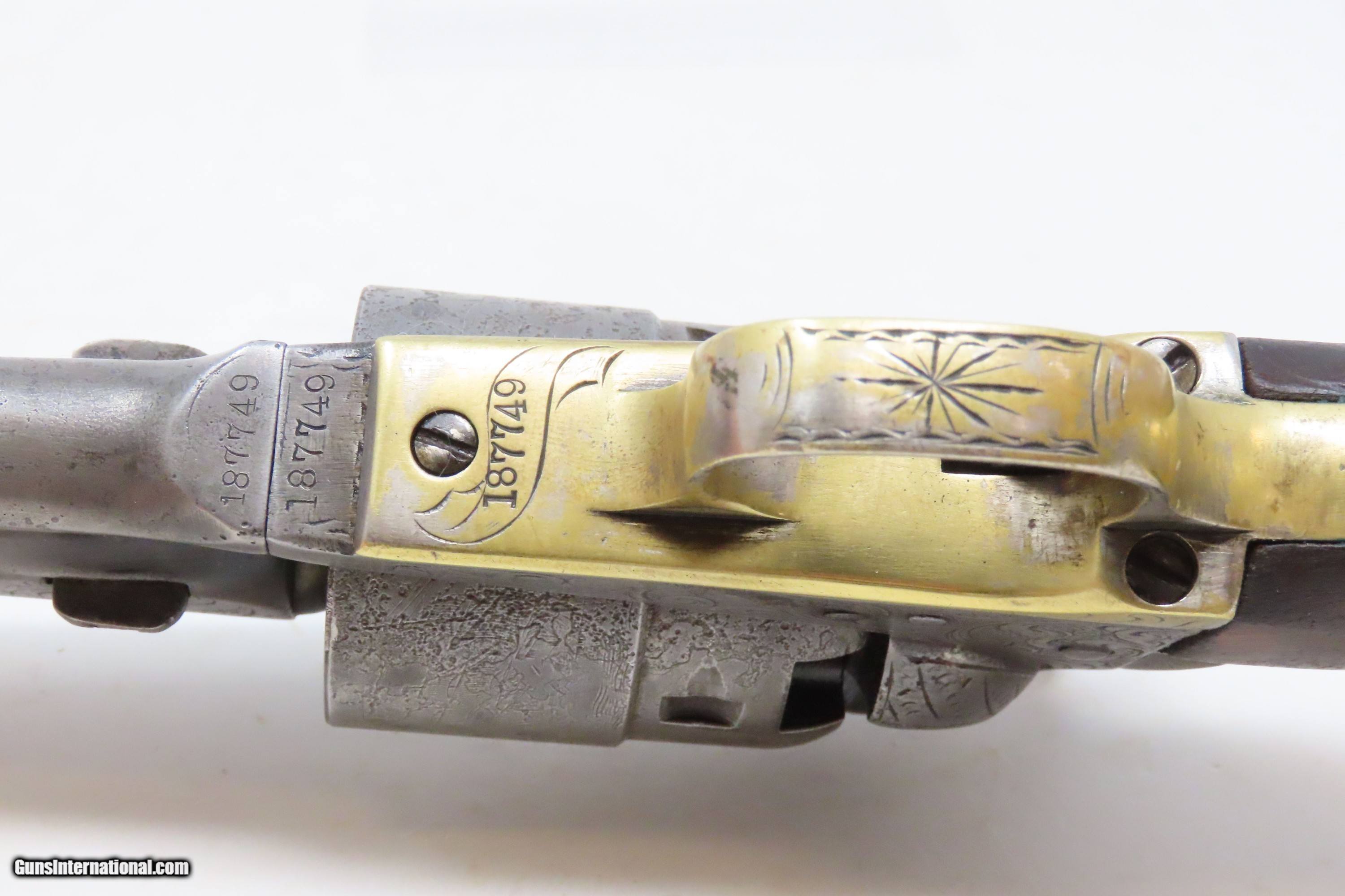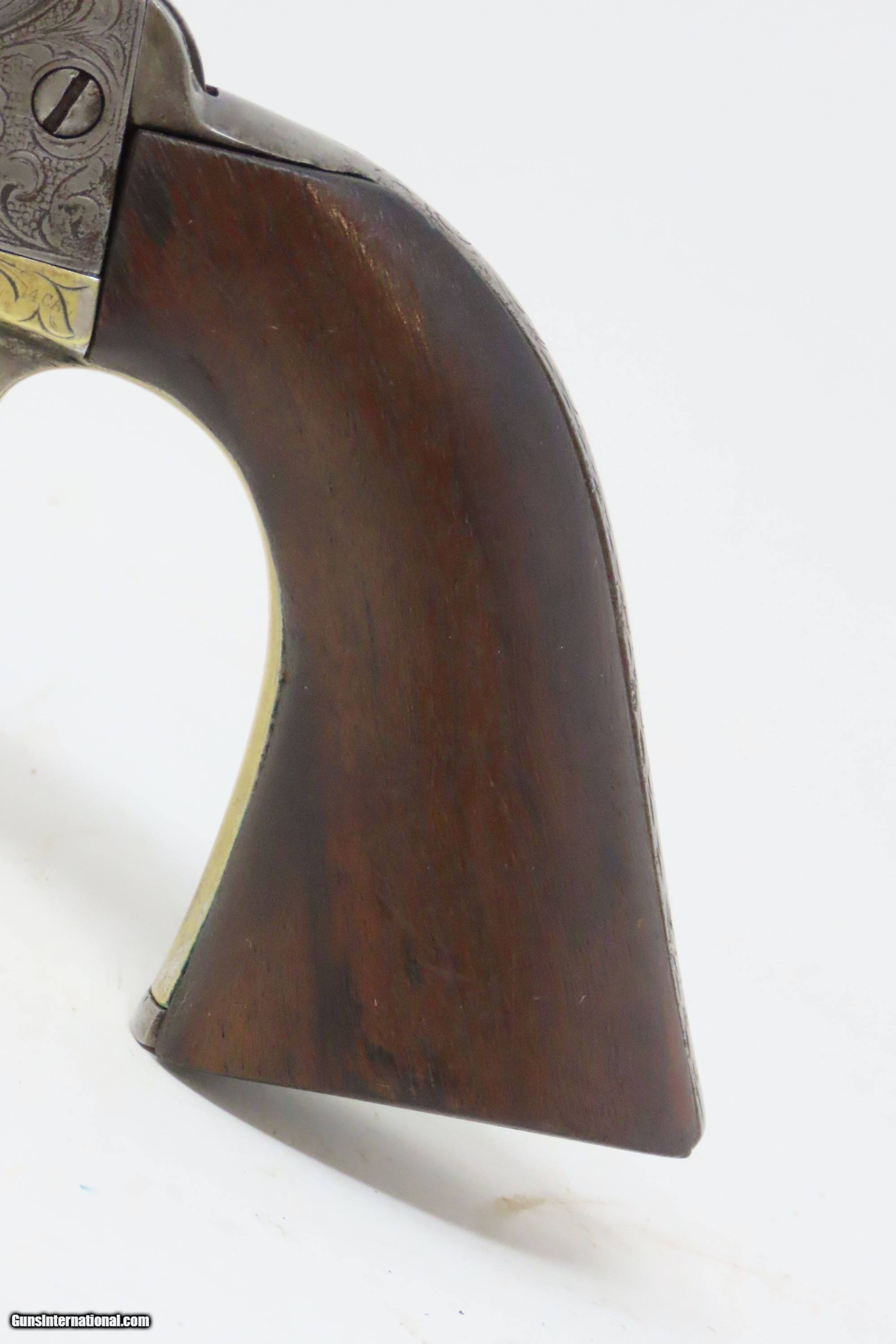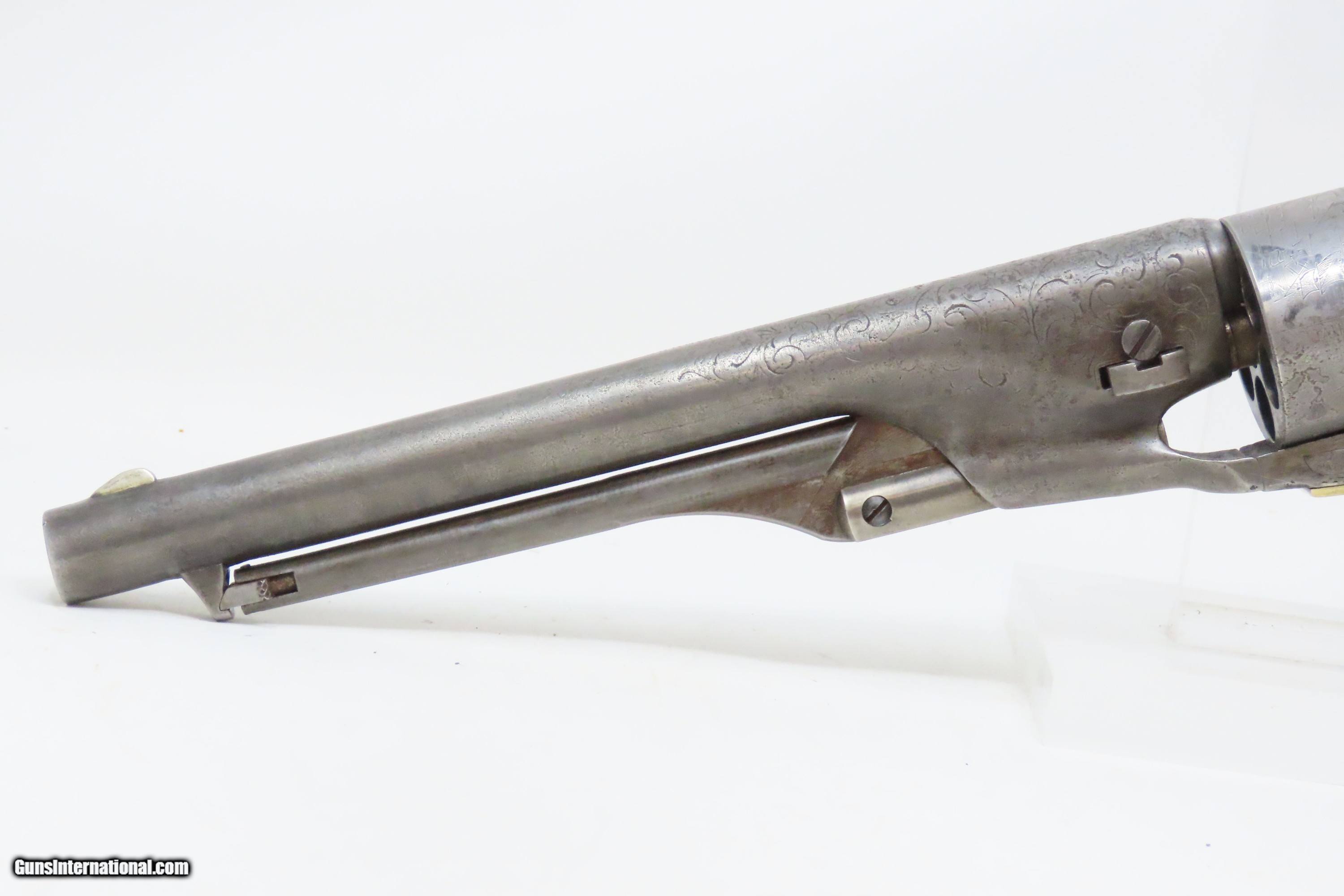 Description: ENGRAVED Antique Model 1860 COLT ARMY .44 Percussion “WILD WEST” Revolver ICONIC Revolver Used in WESTWARD EXPANSION Here we present an antique Engraved Colt Model 1860 Army Percussion Revolver, made in 1870 in Hartford, Connecticut. The 1860 Army was the single most used pistol of the American Civil War. Over 200,000 were made from 1860 to 1873, and 156,000 of those were made by the end of the war in 1865. These were excellent sidearms for officers, cavalry, infantry, and artillery troops. The 1860 Army was Samuel Colt’s finest achievement to that point, having finally developed a large caliber revolver that weighed about 2 lbs. 10 oz. to the famous Dragoon’s 4 lbs. 4 oz., and was adopted en masse by the U.S. government with huge contracts. The revolver was well balanced in hand and had a long enough barrel to be effective when utilized as a carbine with the attachable shoulder stock. This revolver represented unprecedented firepower from a handgun in the field at the time and was especially suited to Cavalry. The Confederacy, lacking in manufacturing capabilities though they were, managed to produce limited numbers of copies, and battlefield pickups of the 1860 Army were highly coveted. The 1860 Army went on to serve the U.S. military even after the Civil War and into the Indian Wars, until production of Colt’s 1873 Single Action Army created new waves in the revolver market, and again achieved great success in the military and commercial markets. The overall condition is good. This one has some old engraving and a partial refinish. The numbers match with the exception of the unnumbered barrel wedge. The cylinder is a replacement that has been renumbered. The action (hammer/trigger) is strong, though the muzzle must be pointed down for the cylinder to index due to a weak handspring. The bore is in very good condition with strong rifling. The grip is solid. Own the original! This is a legitimate antique and not a reproduction. Barrel is 8 inches. Caliber: .44 Percussion Overall condition as seen in photos. Very Fast. Very Safe. FREE SHIPPING WORLDWIDE. Delivered directly to your door by express mail! Guaranteed AUTHENTIC & Includes CERTIFICATE OF AUTHENTICITY. ancestryguns $3500 #233067 SOLD Antique: Yes |