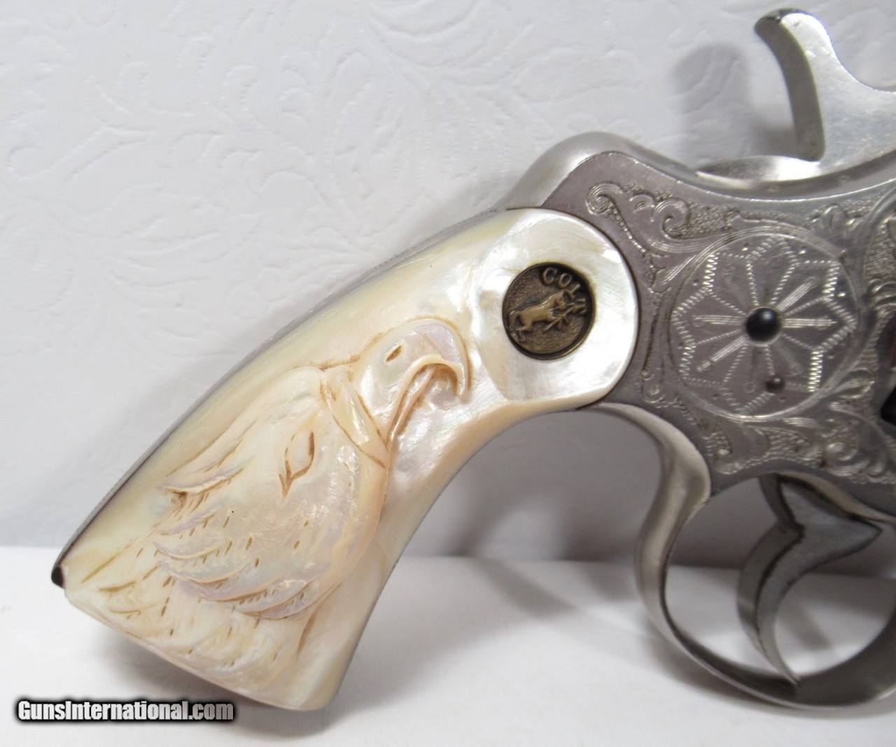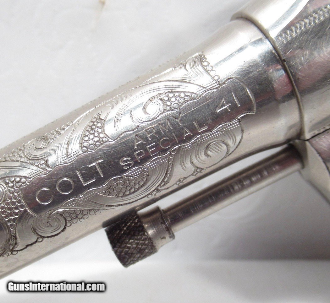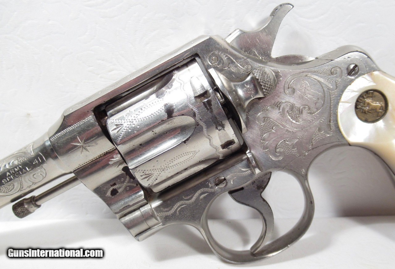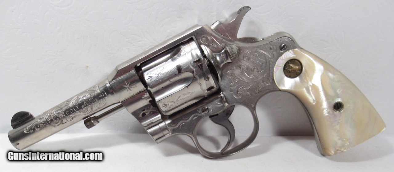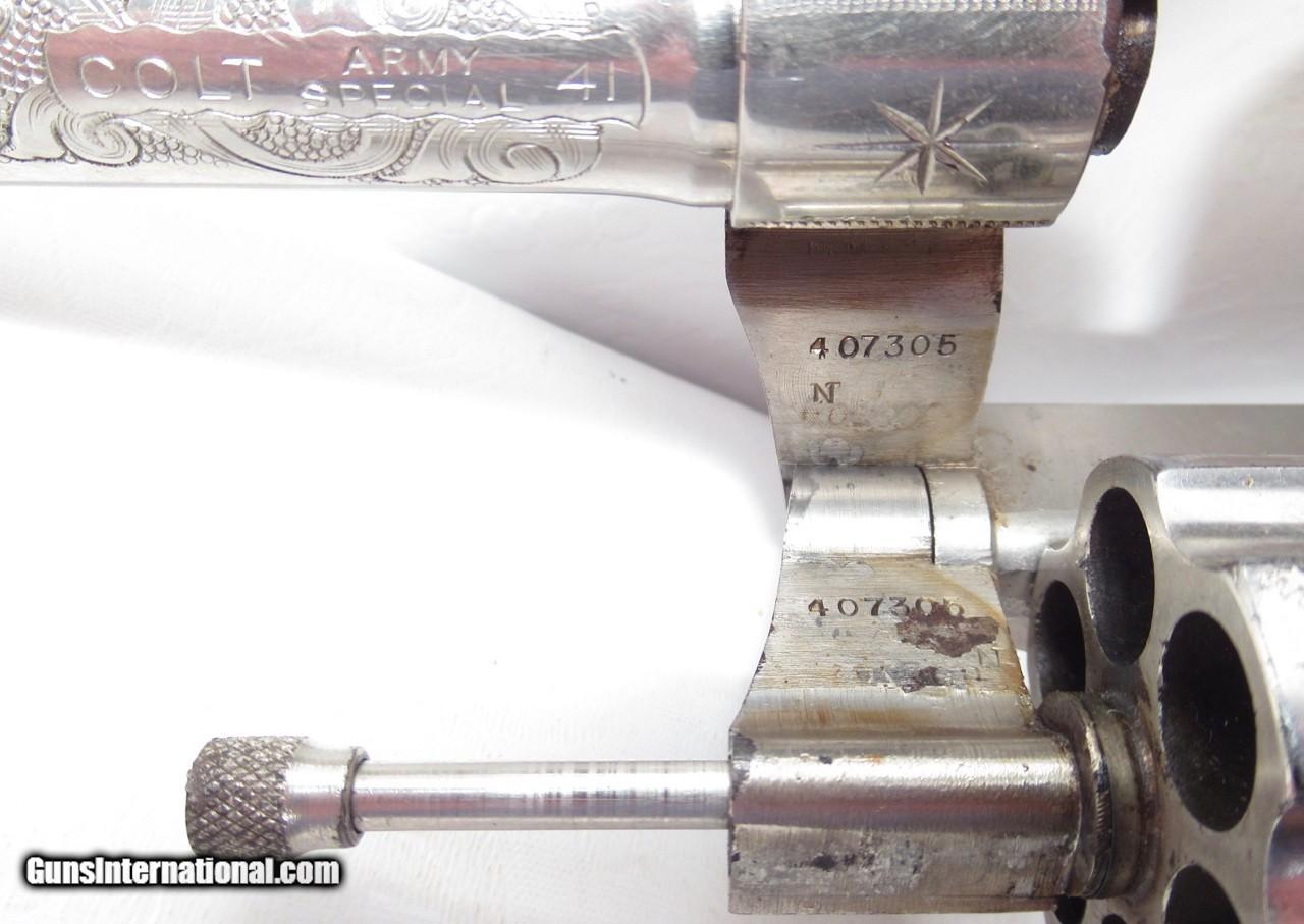 Description: Colt Army Special Revolver; Serial No. 407305; 41 Cal.; 4” Barrel; Nickel Factory Level 3 Engraved with name “M. M. Villareal” on Backstrap; Pearl Grips with Carved Eagle Motif; Shipped to W.M. Villareal in 1915; Beautiful Colt with Most of the Original Nickel Present; Beautiful Deep Dish Medallion Factory Grips with Carved Eagle; Right Grip has small chip missing; Left Grip has small Pro-Repair; Prefect Action; Great Bore with minor flaws; Note: When I got this revolver, Inscription on Backstrap had been removed – I had it Professionally Restored; See All Photos for Condition; No Texts. Call or Email Only; PERSONAL PROPERTY of Harold Wieser; return policy: three days inspection from the date the item is received; full refund of shipping both ways ONLY IF THE ITEM IS MISREPRESENTED. SOLD Manufacturer: Colt Model: Army Serial Number: 407305 |