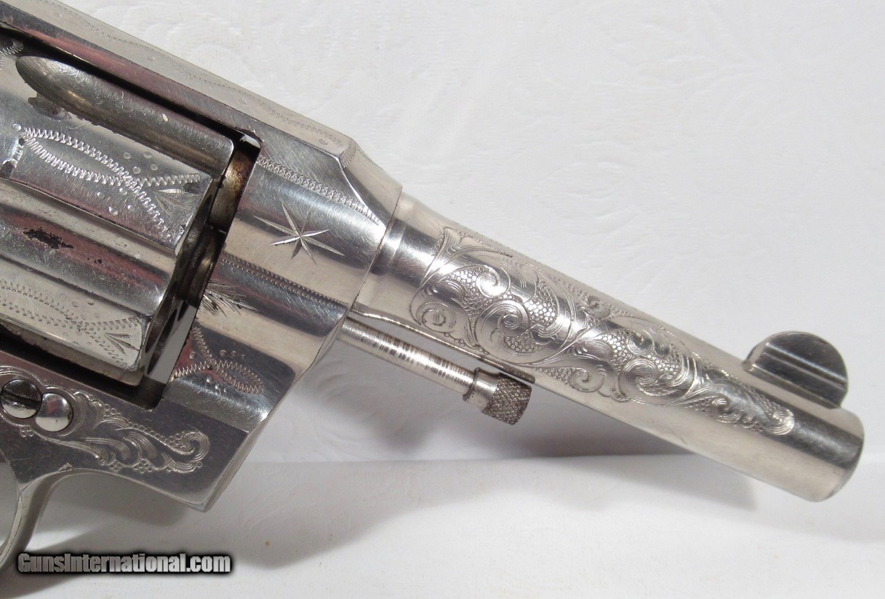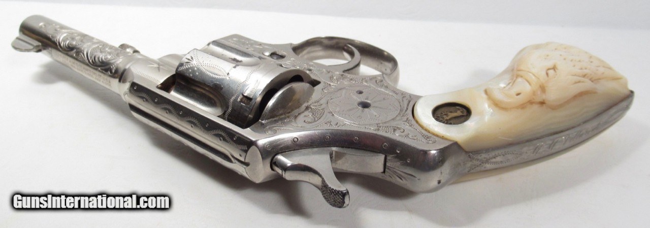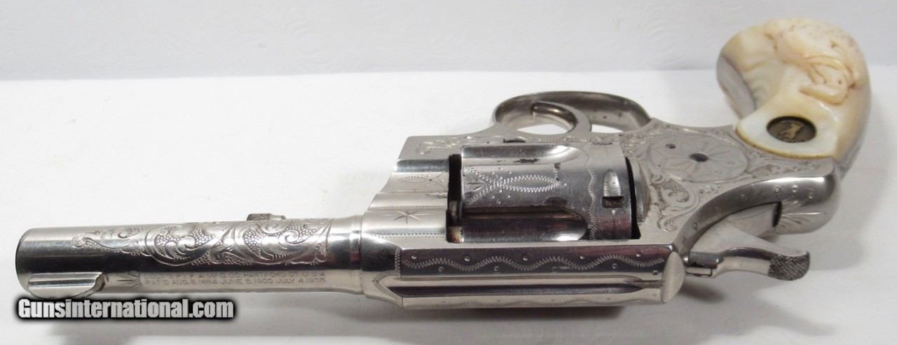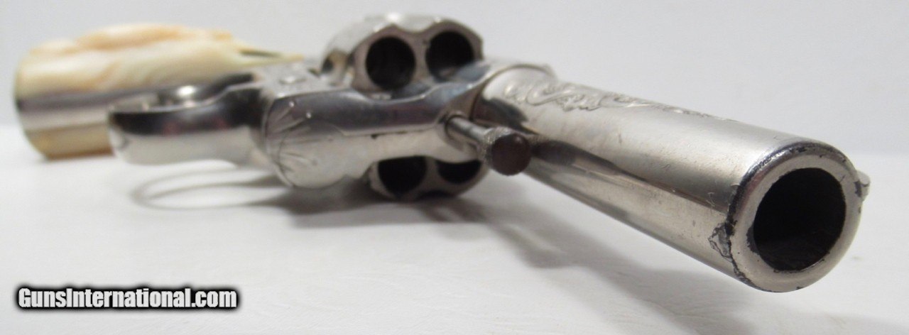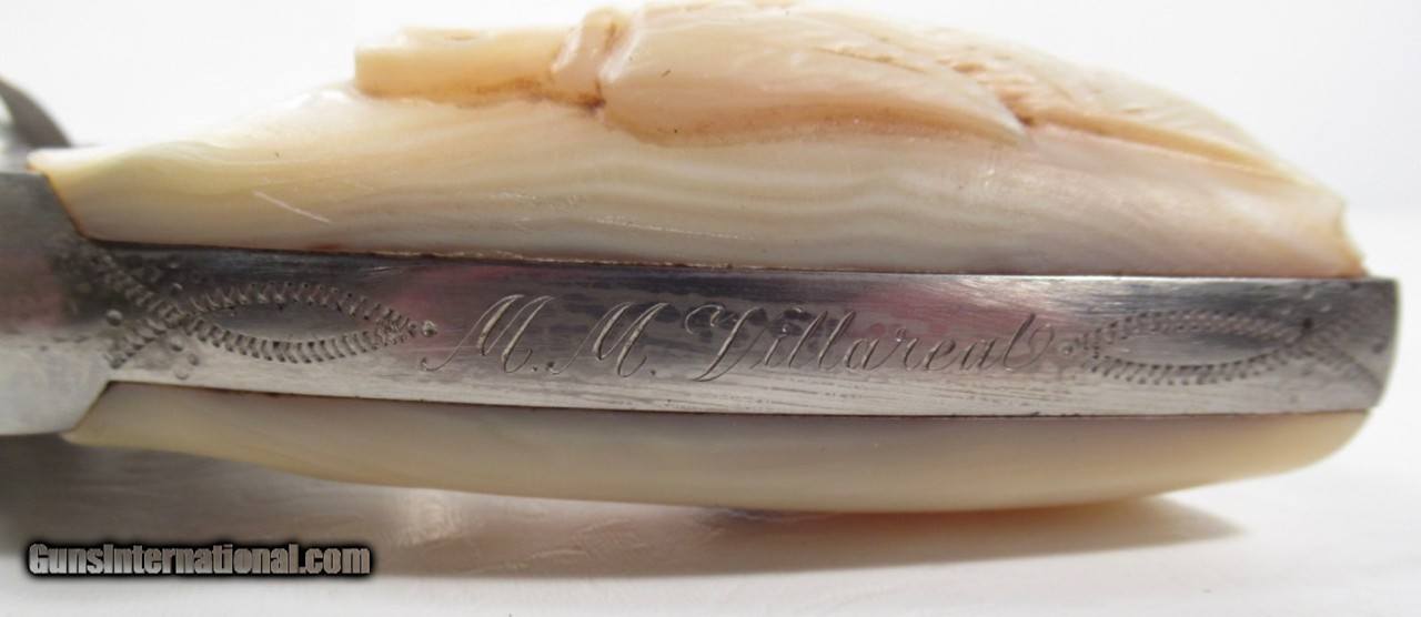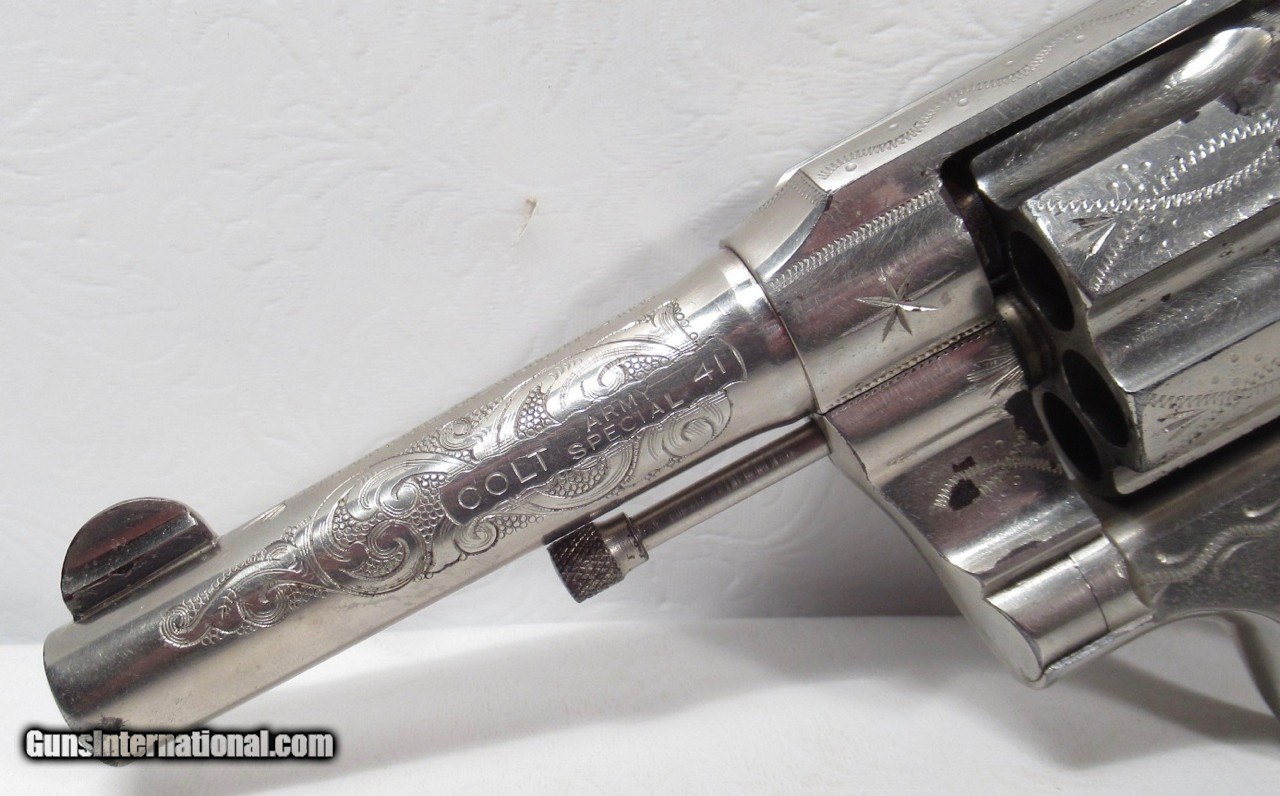 Description: Colt Army Special Revolver; Serial No. 407305; 41 Cal.; 4” Barrel; Nickel Factory Level 3 Engraved with name “M. M. Villareal” on Backstrap; Pearl Grips with Carved Eagle Motif; Shipped to W.M. Villareal in 1915; Beautiful Colt with Most of the Original Nickel Present; Beautiful Deep Dish Medallion Factory Grips with Carved Eagle; Right Grip has small chip missing; Left Grip has small Pro-Repair; Prefect Action; Great Bore with minor flaws; Note: When I got this revolver, Inscription on Backstrap had been removed – I had it Professionally Restored; See All Photos for Condition; No Texts. Call or Email Only; PERSONAL PROPERTY of Harold Wieser; return policy: three days inspection from the date the item is received; full refund of shipping both ways ONLY IF THE ITEM IS MISREPRESENTED. SOLD Manufacturer: Colt Model: Army Serial Number: 407305 |