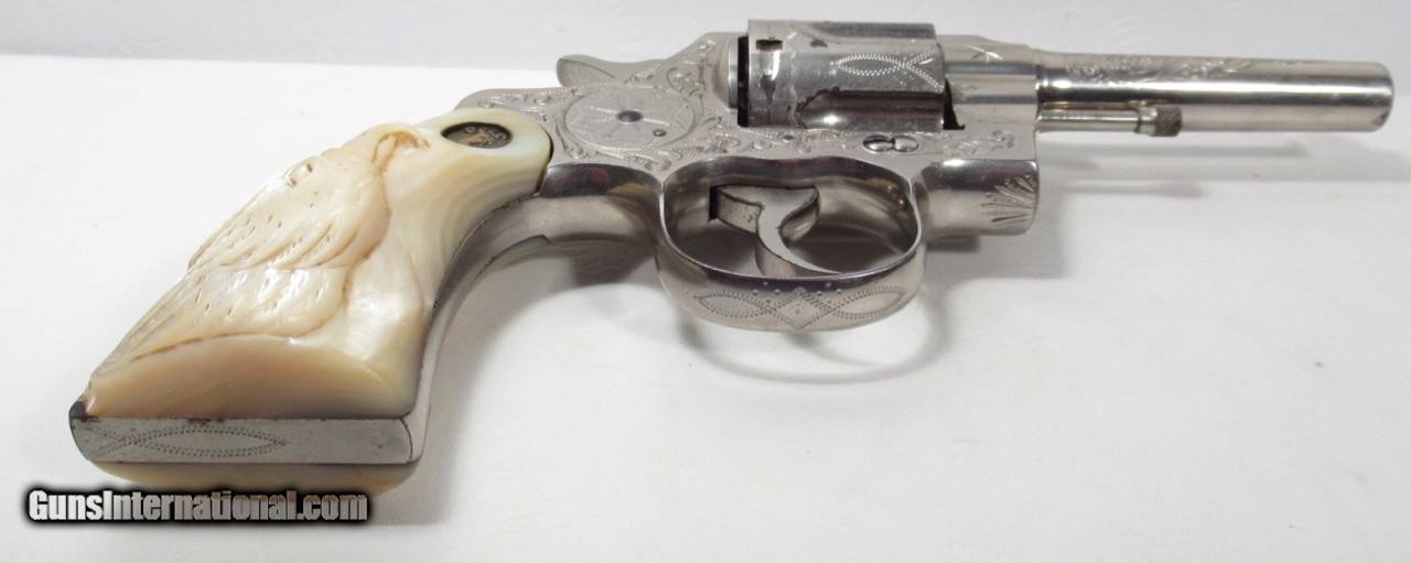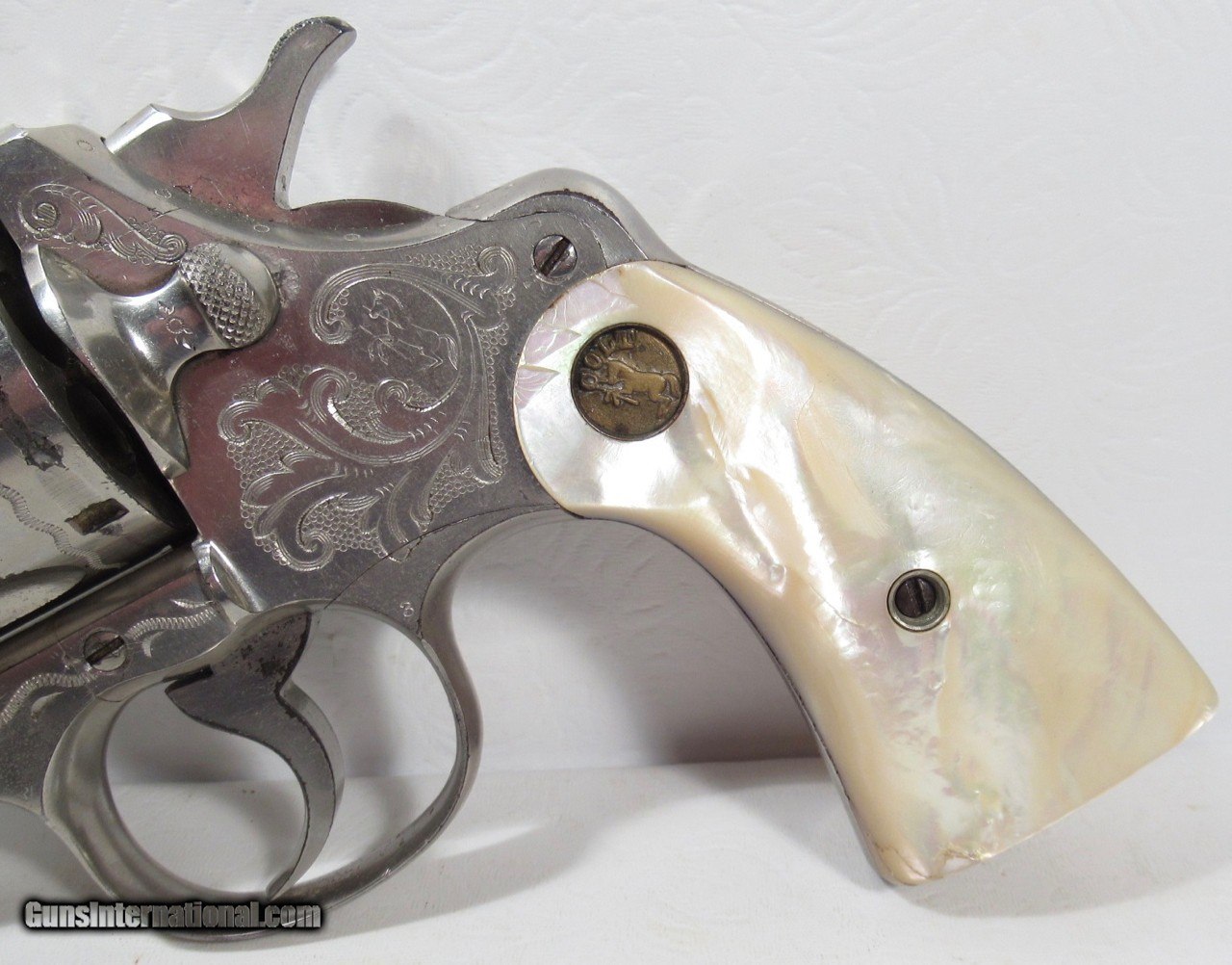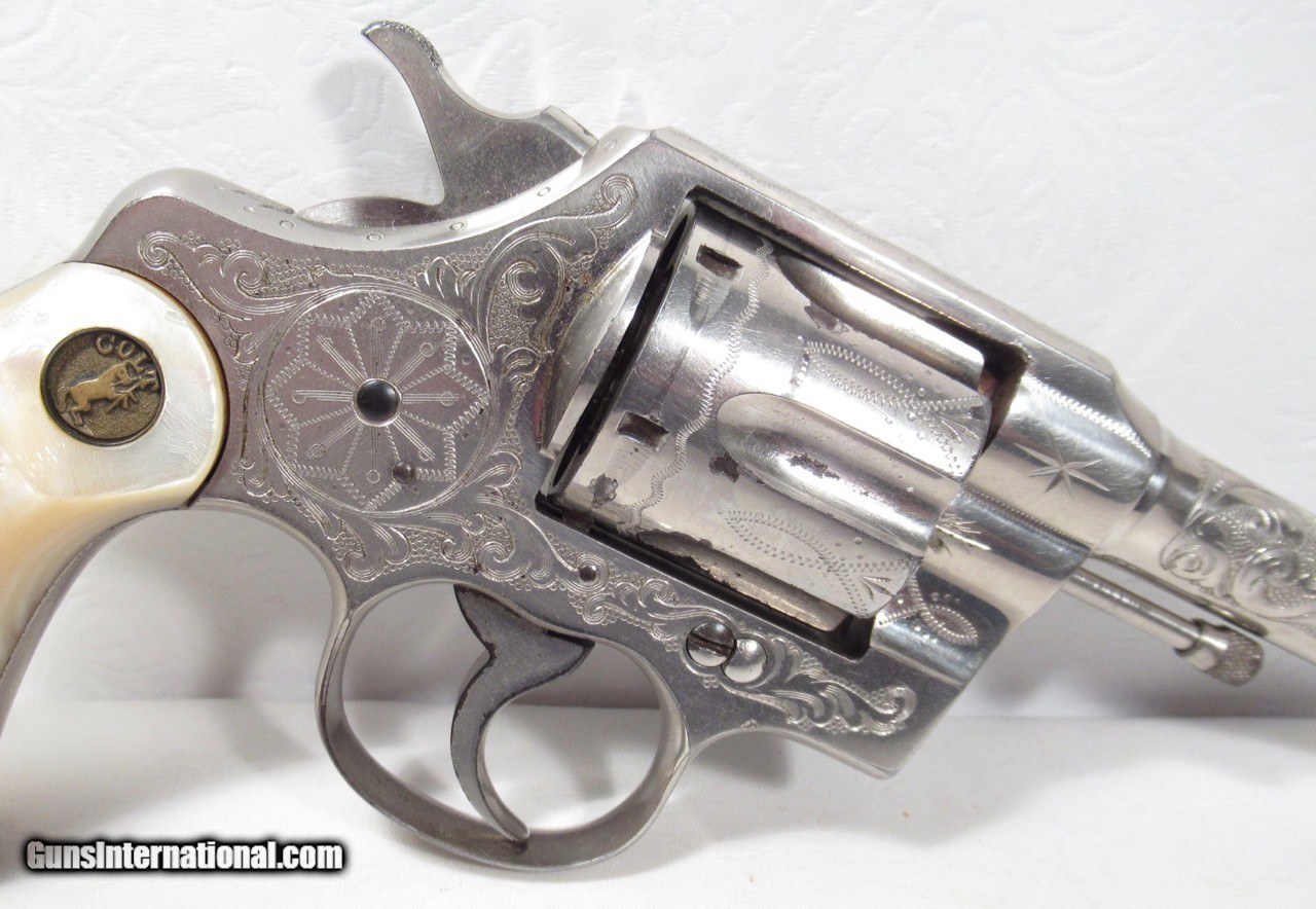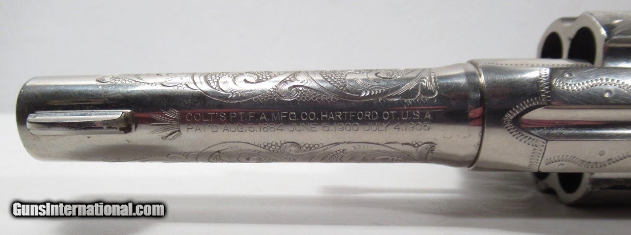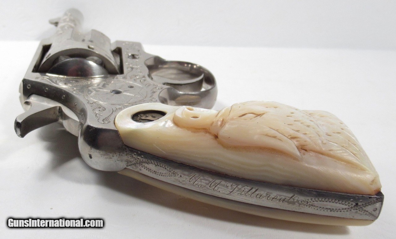 Description: Colt Army Special Revolver; Serial No. 407305; 41 Cal.; 4” Barrel; Nickel Factory Level 3 Engraved with name “M. M. Villareal” on Backstrap; Pearl Grips with Carved Eagle Motif; Shipped to W.M. Villareal in 1915; Beautiful Colt with Most of the Original Nickel Present; Beautiful Deep Dish Medallion Factory Grips with Carved Eagle; Right Grip has small chip missing; Left Grip has small Pro-Repair; Prefect Action; Great Bore with minor flaws; Note: When I got this revolver, Inscription on Backstrap had been removed – I had it Professionally Restored; See All Photos for Condition; No Texts. Call or Email Only; PERSONAL PROPERTY of Harold Wieser; Price: $8,775 + $45 S&H Via FedEx Express; Price includes insured shipping; return policy: three days inspection from the date the item is received; full refund of shipping both ways ONLY IF THE ITEM IS MISREPRESENTED. SOLD Manufacturer: Colt Model: Army Special Serial Number: 407305 |
