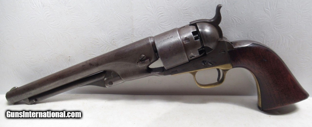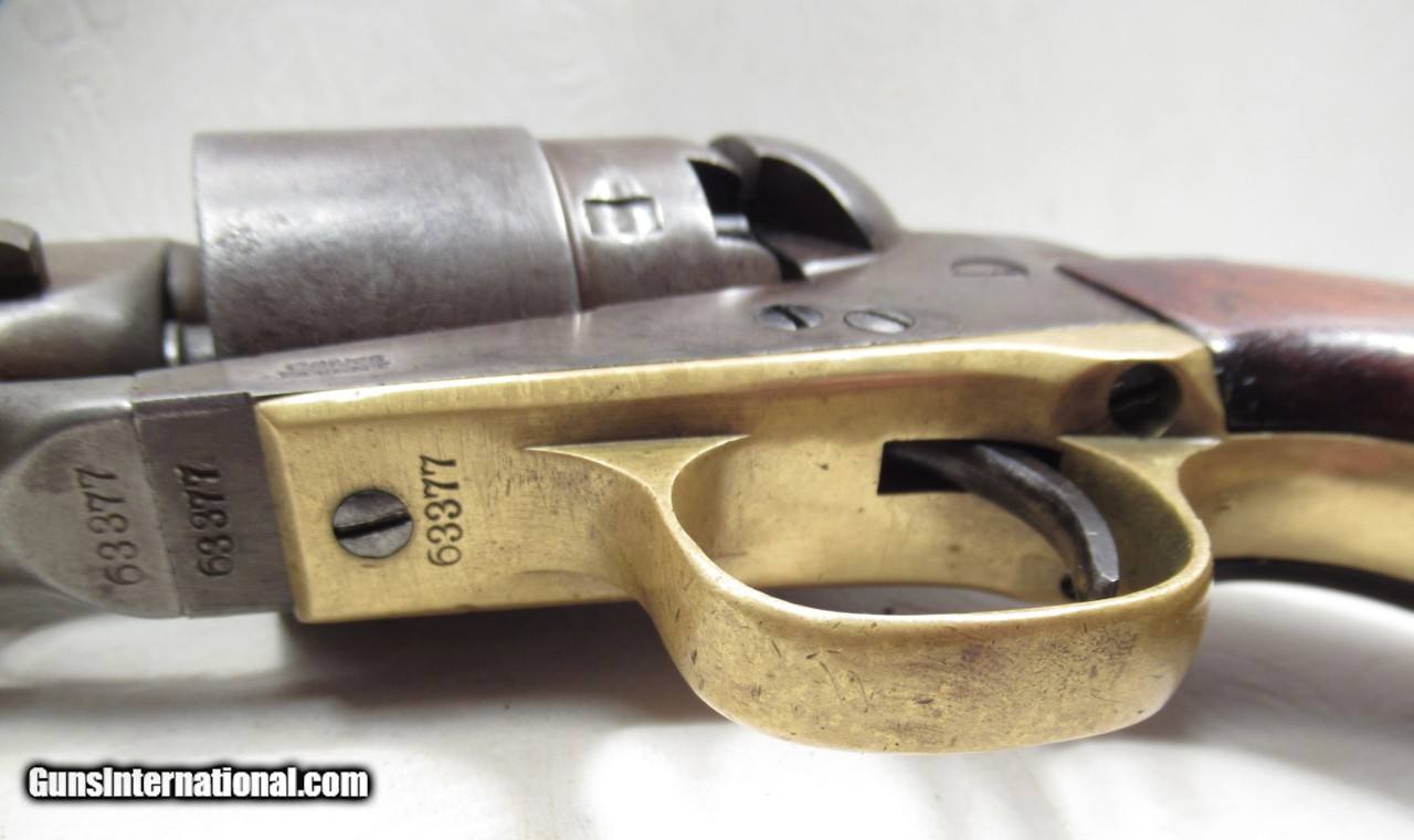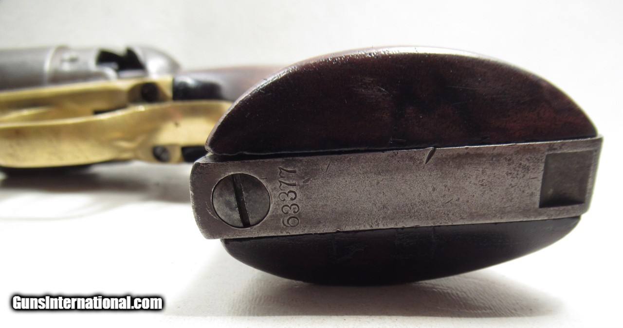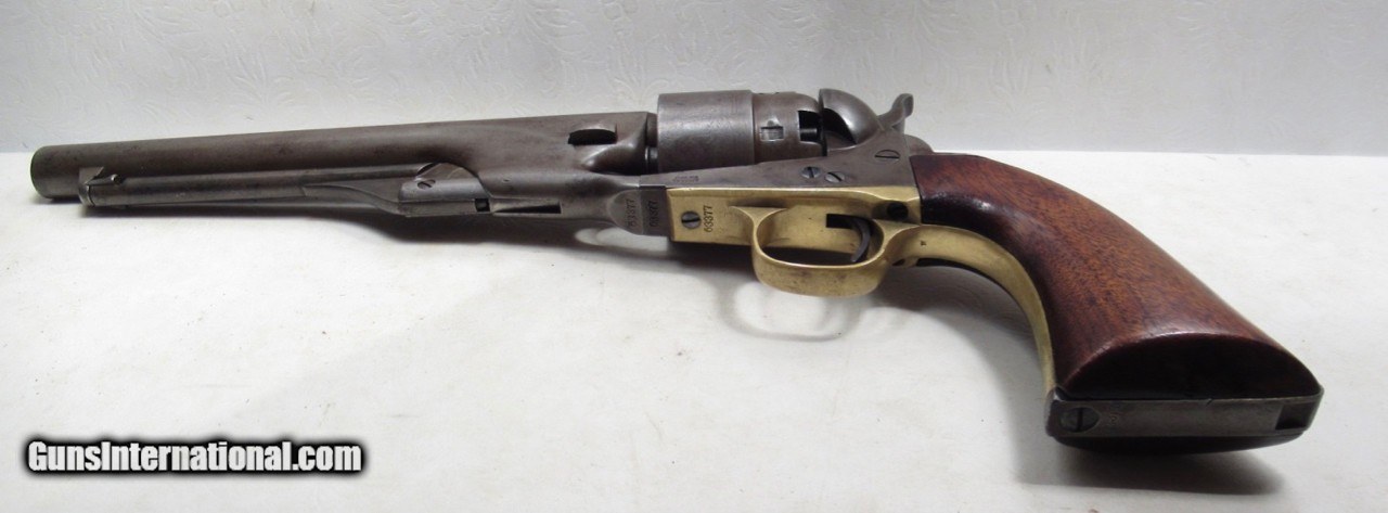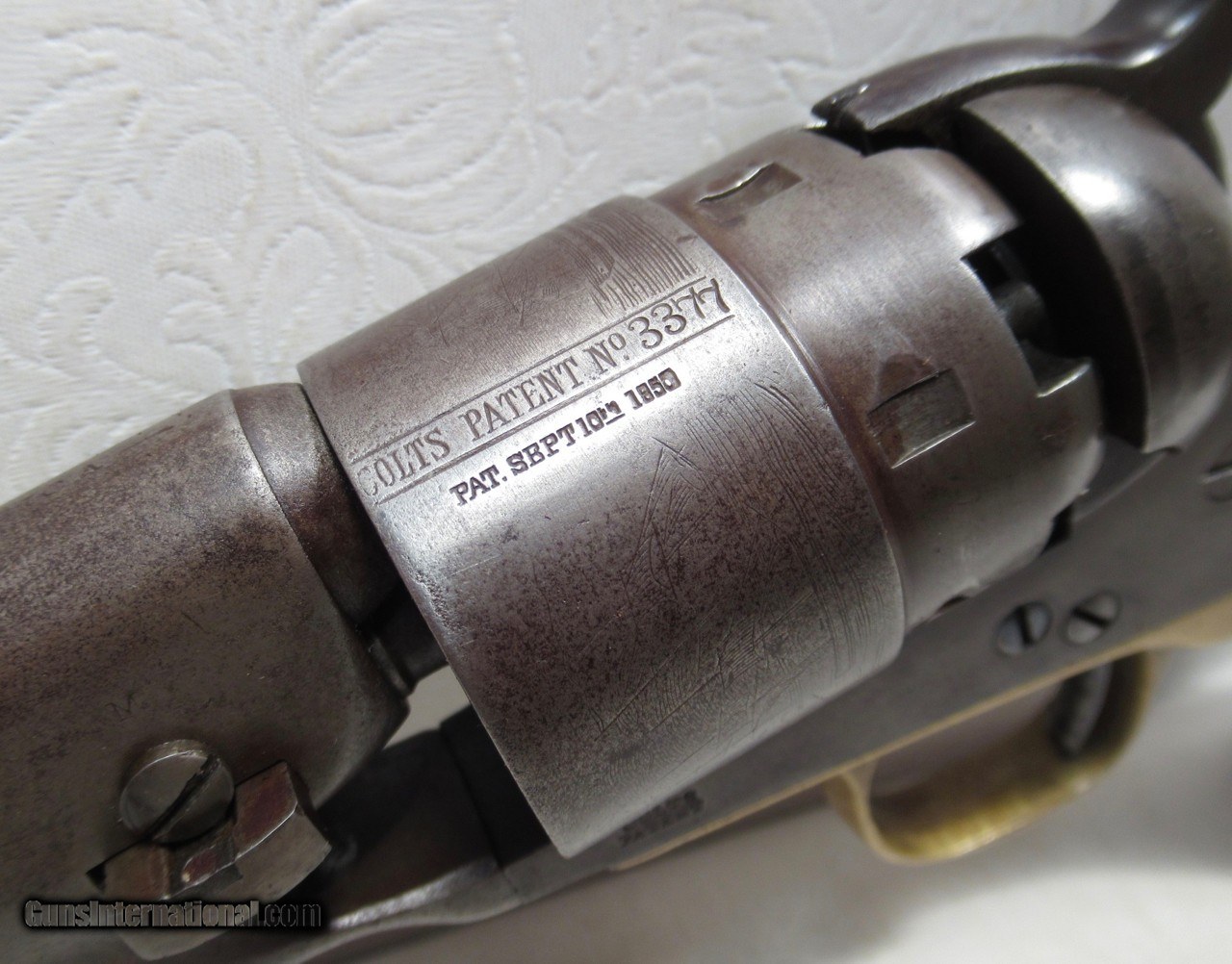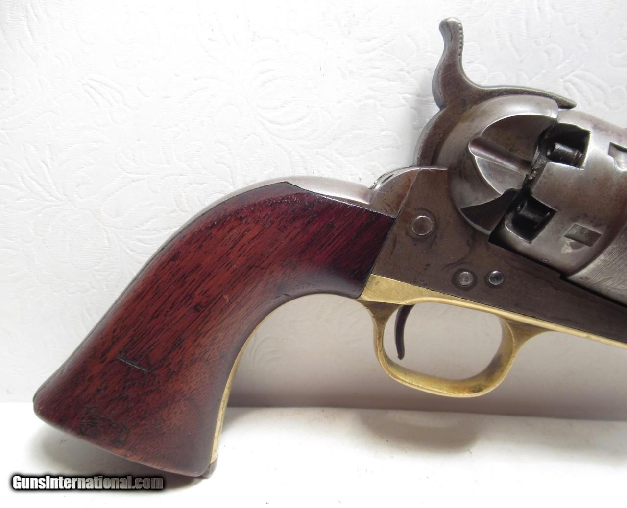 Description: Colt Model 1860 Army Percussion Revolver; Serial No. 63377; Made 1862; Civil War Used Revolver with Original US Belt and Holster; .44 Caliber with 8” Barrel; Smooth Uncleaned Metal Finish; Good Cylinder Scene; Nice Walnut Grips; Good Action and Very Strong Bore with moderate chattering; All Numbers Match except Wedge Numbered 9033; Note: Marked Belt has been shortened to 40” L.O.A.; Nice 162 Year-Old Civil War Era Colt Army Model Revolver with Original Gun Rig; See All Photos for Condition; No Texts; Call (254)541-5765 or Email Only; PERSONAL PROPERTY of Harold Wieser; NOTICE: We Do Not Do Any Consignments - All Items Listed are Owned by Us - NO SALES to New Jersey or New York City - Antiques Only to Massachusetts and California; Price: $3,975 + $45 S&H Via USPS PRIORITY MAIL; Payment Address: Harold Wieser - 1466 U.S. Hwy 77 - Rosebud, TX 76570; SEND PAYMENTS VIA USPS PRIORITY MAIL; BEWARE of SCAMS!!! – DO NOT SEND MONEY or CORRESPONDENTS ELECTRONICALLY UNLESS YOU HAVE SPOKEN to HAROLD WIESER FIRST! 254-541-5765 SOLD Antique: Yes Manufacturer: Colt Model: 1860 Army Serial Number: 63377 |