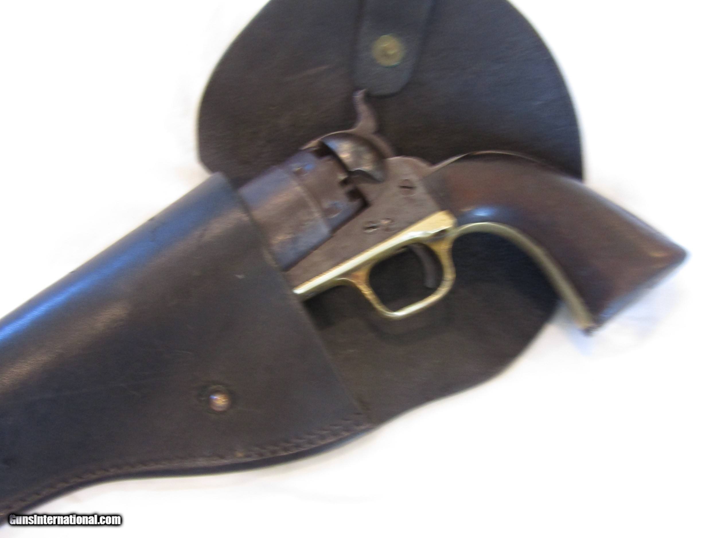 Description: This orginal colt model 1860 army has all matching number. The action works smoothly, with dark original patina. The ram used for seating the ball has been replaced ,as maybe the back strap, but easy finds and replacement for a purest. This has the original low numbers so surely used in the Civil WAR since it was made in 1862 according to the numbers. There are tiny holesin the bottom of the grip effect nothing . 859-533-5445 This colt also has an outstanding repo, leather holster that will go with the gun. 859-533-5445 SOLD Antique: Yes Manufacturer: samuel colt Caliber Info: 44 Condition: good Metal Condition: good Bore Condition: good Barrels: marked samuel colt new york america Engraving: navy scene on cylinder |