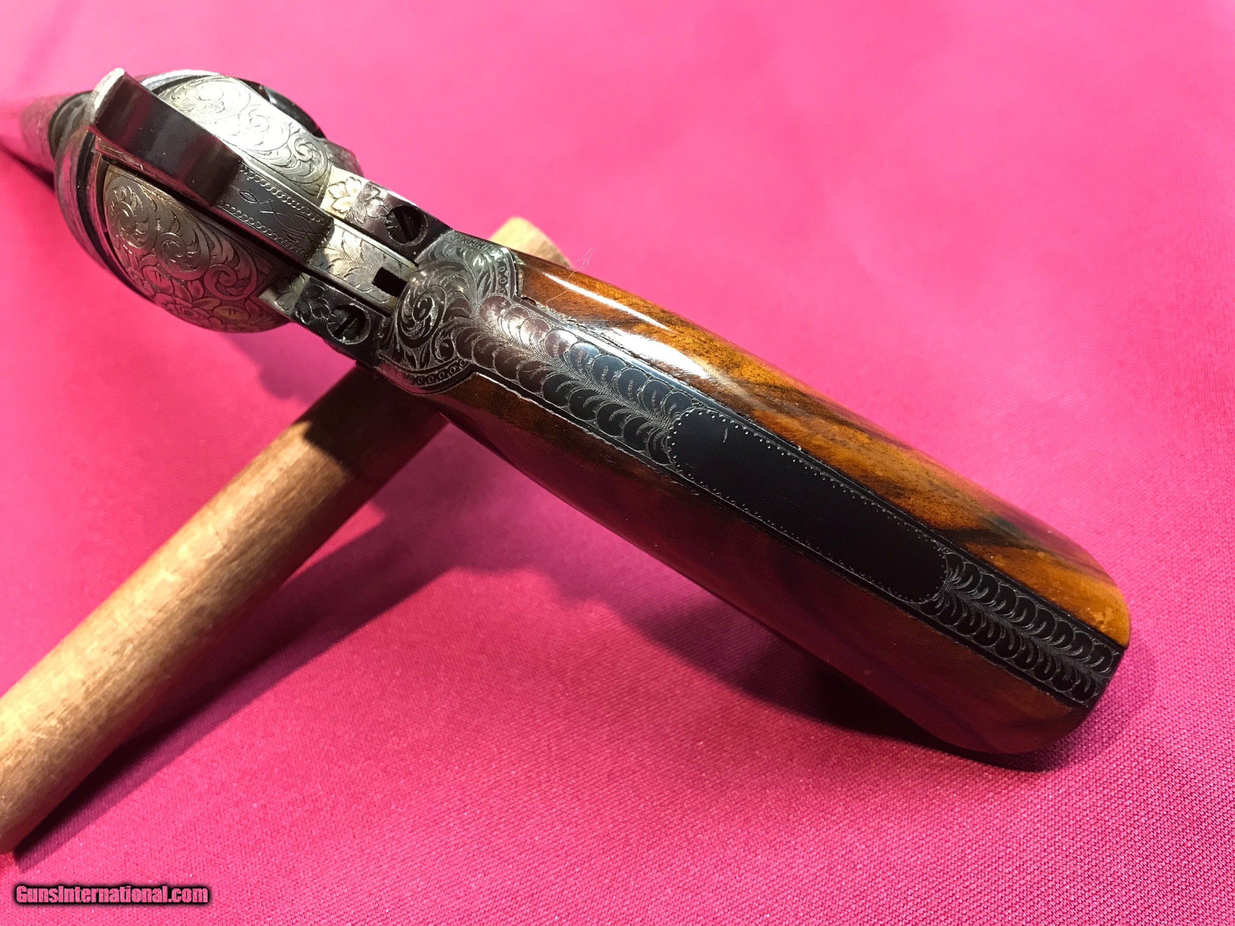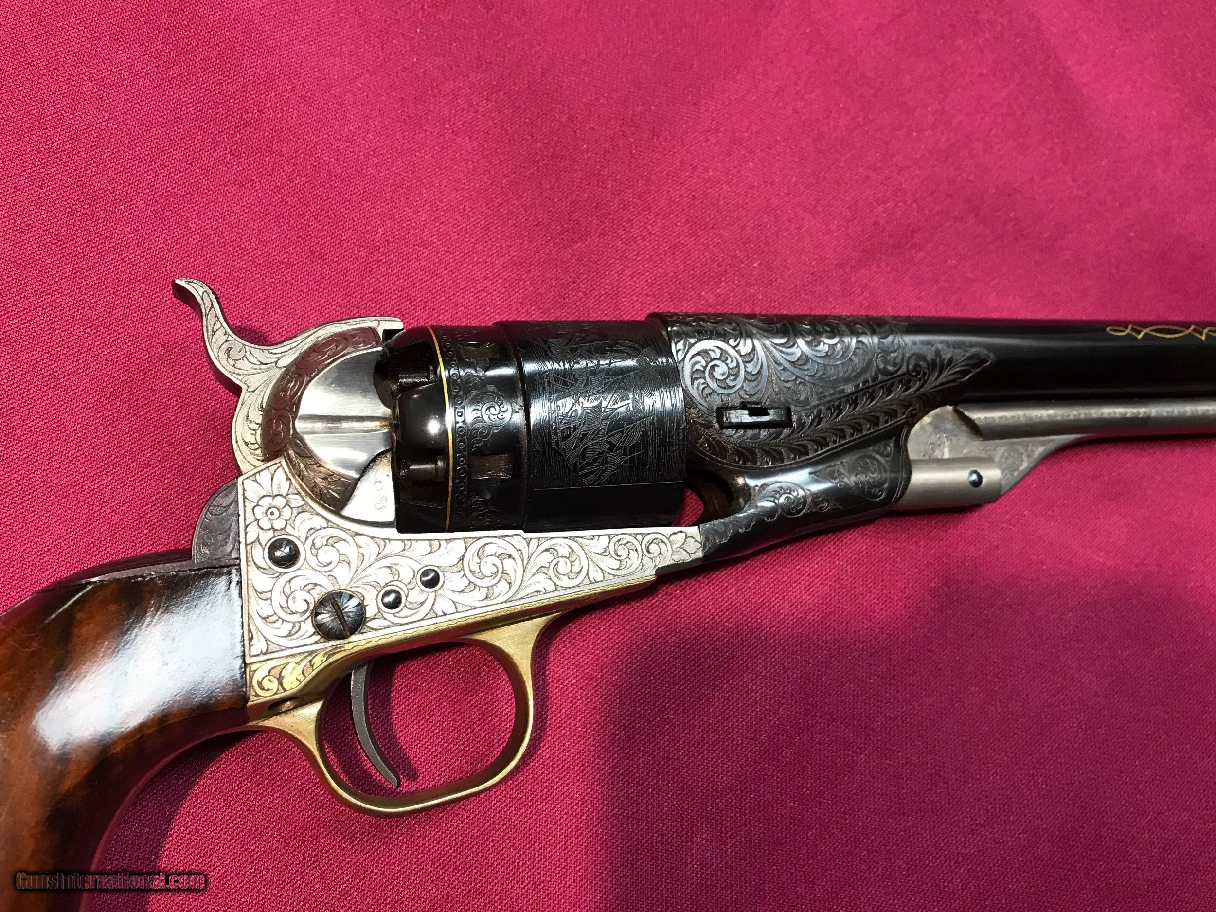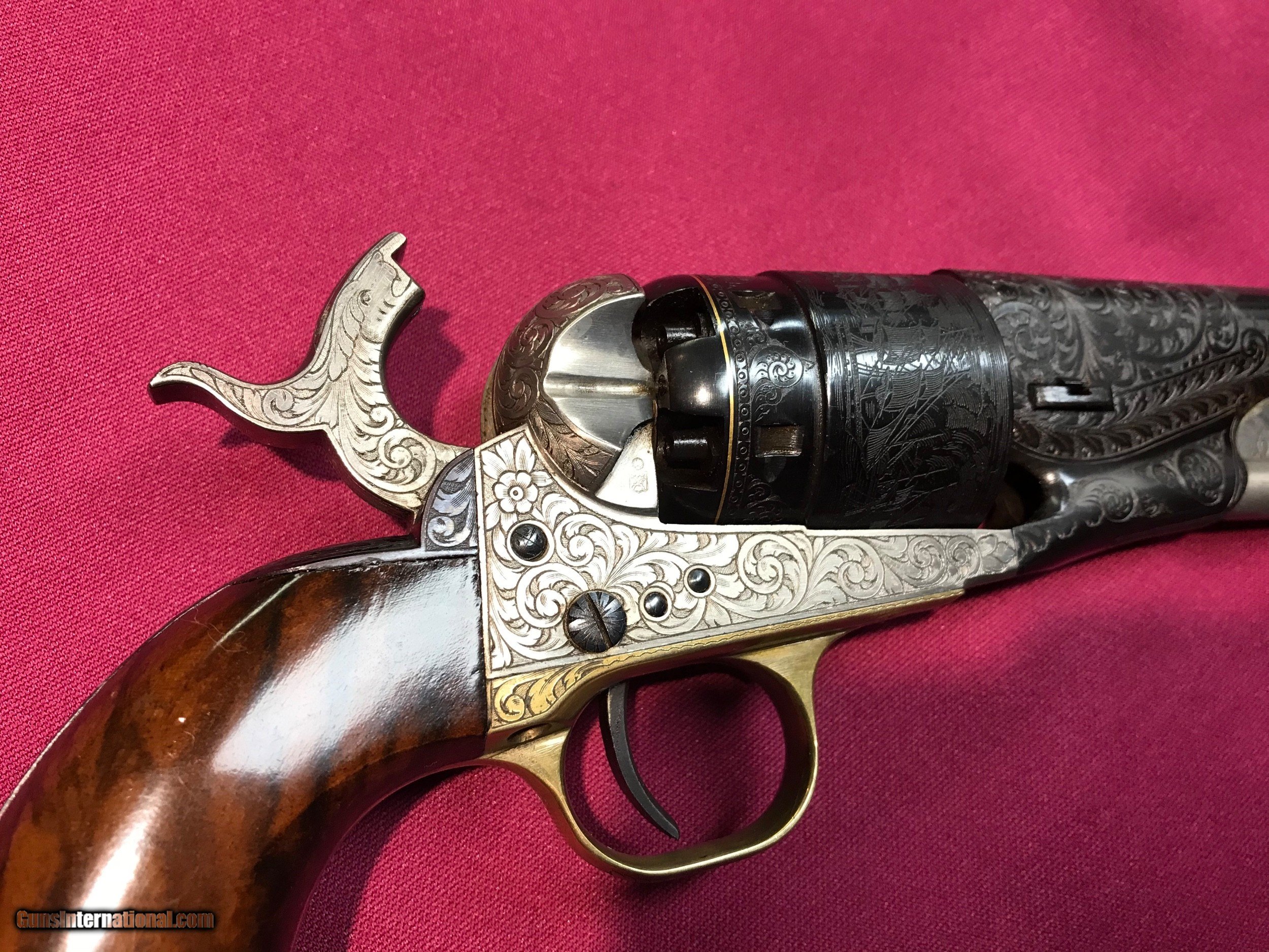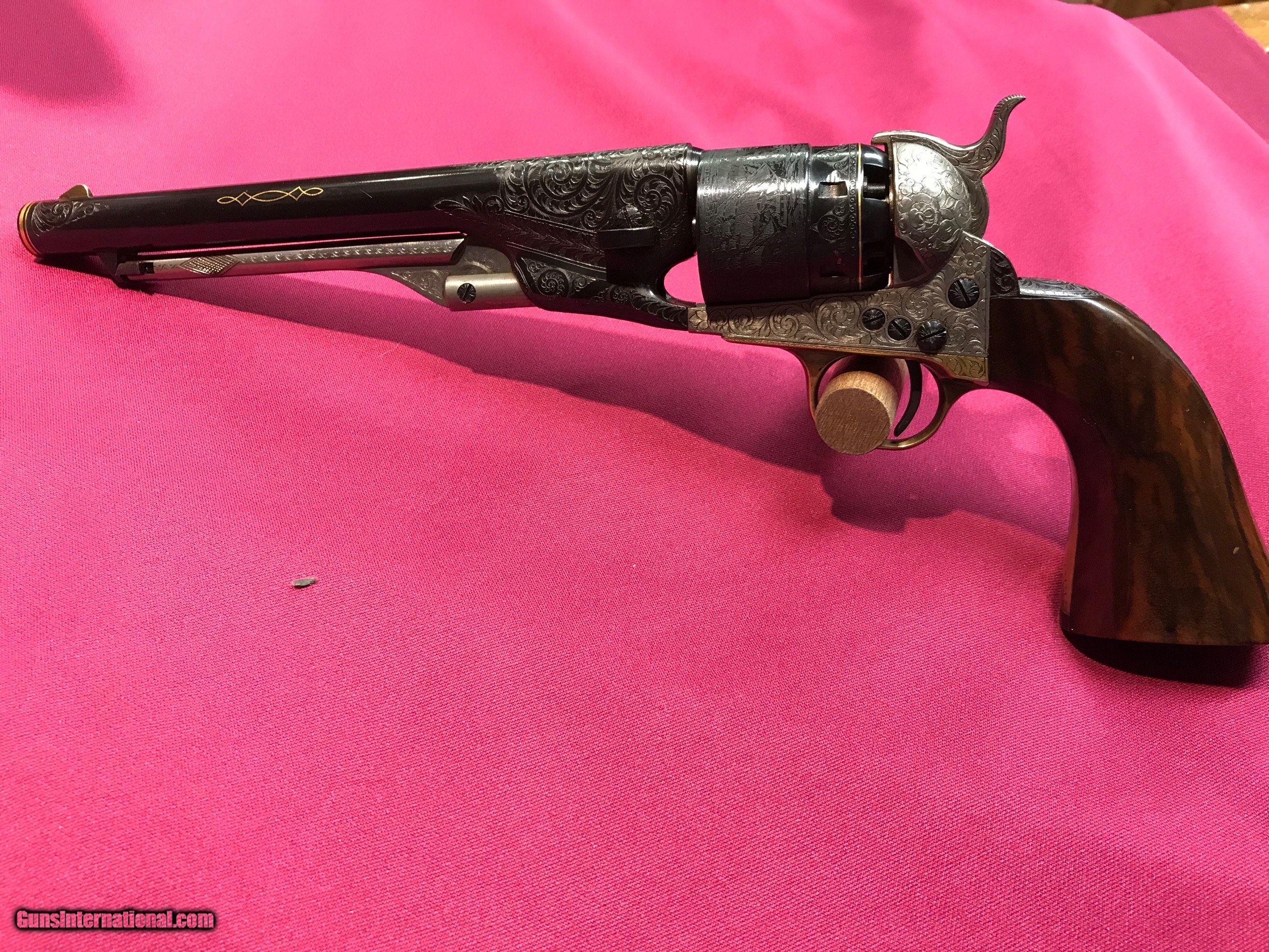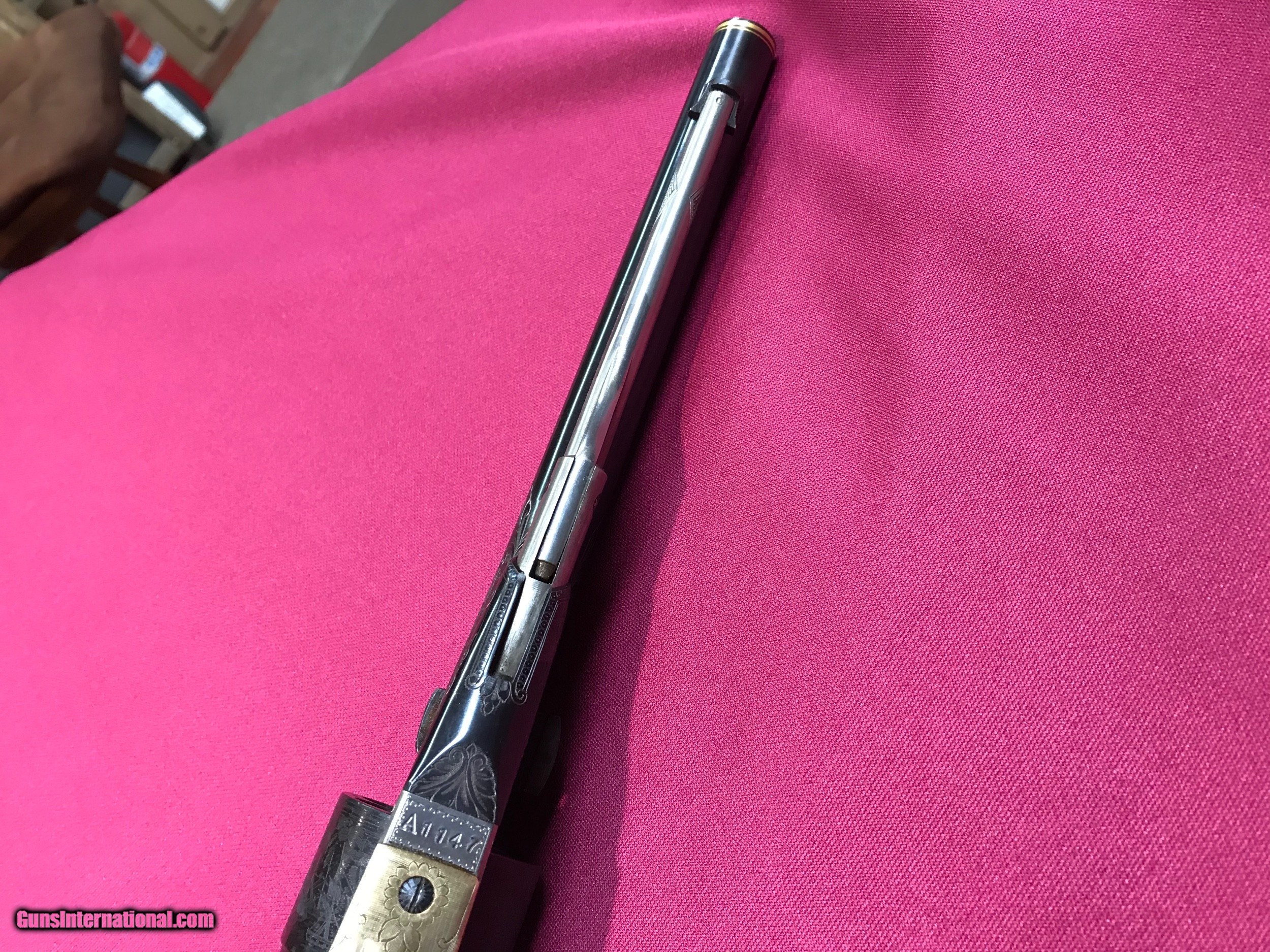 Description: This is a 1860 4 screw deluxe factory engraved with the burl walnut grips , In 44 cal ,New condition comes with wooden box. Questions? Call Richard 406-407-0698 SOLD |