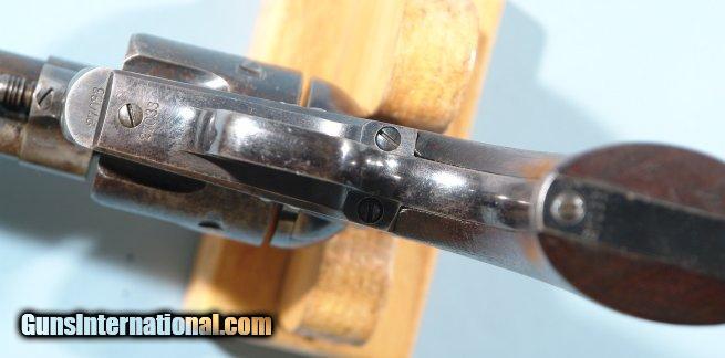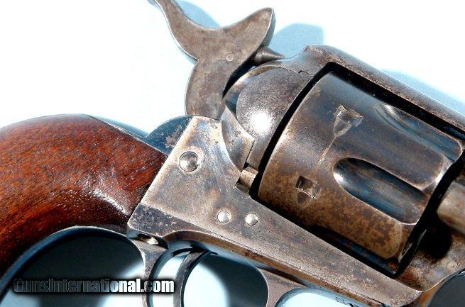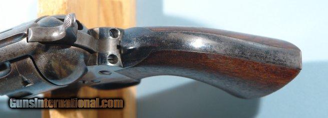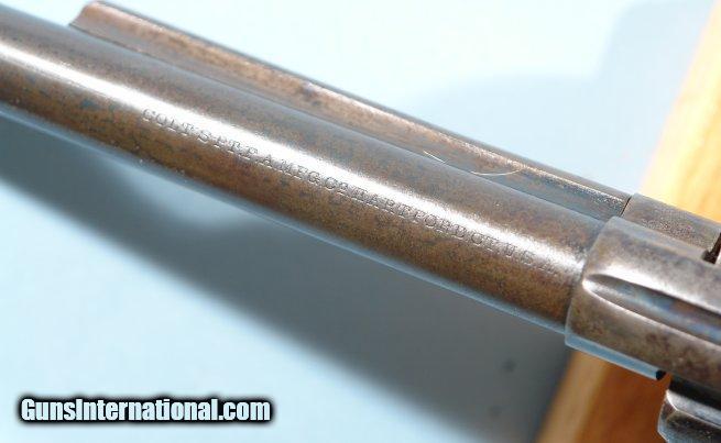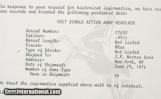 Description: SUPERB EARLY COLT SINGLE ACTION ARMY 7 ½” BLACK POWDER .45 CAL. REVOLVER W/FACTORY LETTER-1876 SHIP DATE. Serial number in the 27,xxx range and all matching with proper serial number stamping on the barrel under the ejector rod housing and on the outside of the cylinder. 100% original and with 90% plus color case hardening on the frame and hammer and 70% plus blue on the cylinder and 50% on the barrel with balance on both a pleasing and evenly mixed deep patina. Early style “donut” ejector rod head. Back strap and trigger guard with 90% plus bright blue. Excellent screws with most of the bright blue original finish. Mint markings with all serial number stampings and the barrel address and frame patent dates as crisp as they were struck at the factory in 1876. Original to the gun excellent factory one piece walnut grips with the original finish. Perfect working order and excellent bore and chambers. Factory letter states it was shipped to J. P. Moores Sons, New York, N.Y. June 29, 1876 only a week after the Custer Massacre. Moores was a major Colt dealer and distributor supplying guns smaller dealers and private buyers around the country. Local customers included many of the rich and famous from New York and visiting New York including Teddy Roosevelt and performers in Buffalo Bill’s Wild West Shows. The nicest early frontier era black powder single action we have had in years. Price on request. SOLD Antique: Yes |