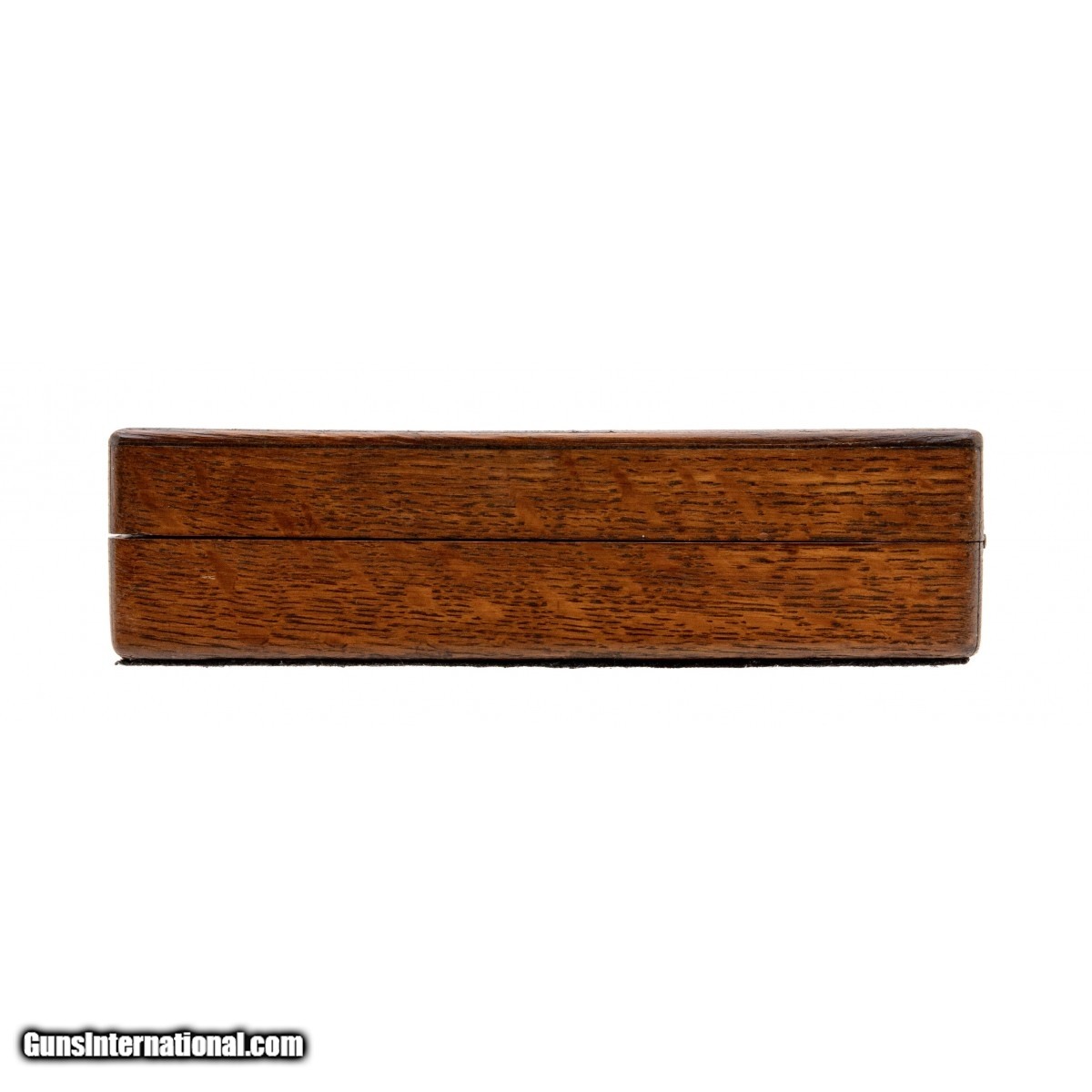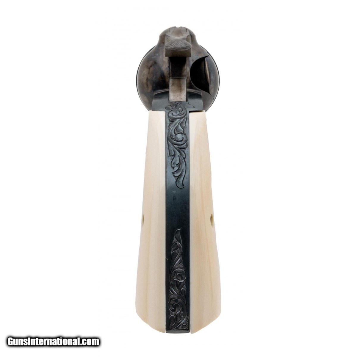 Description: " SN:132159. Manufactured circa 1912, .32 WCF with a 4.75"" barrel. Bore has strong rifling and scattered pitting. single action revolver with fluted cylinder, 2-line patent dates on left side of frame, encircled rampant Colt trademark to the right of the patent date, neither the finish or New York Punch dot engraving is original but was done professionally. Come with wooden box and extra grips. Consignment. SOLD Curio/Relic: Yes |